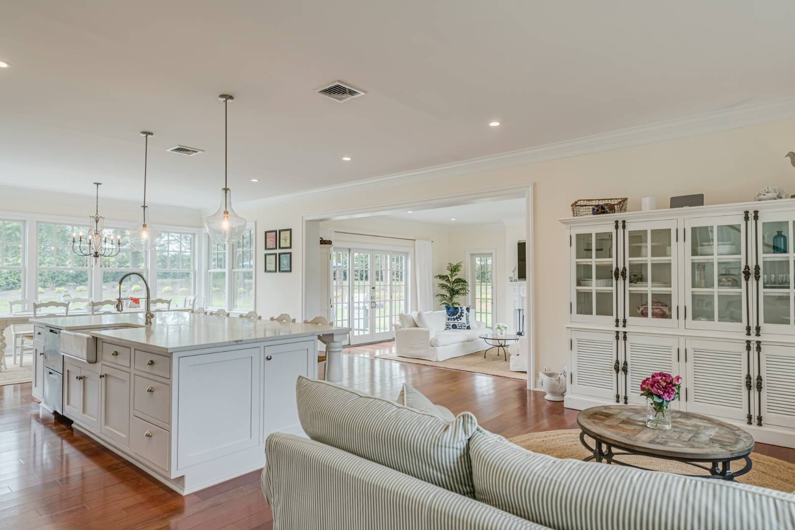 Come home to this spacious and beautifully finished and appointed 4,721+/- sq. ft. home on over an acre in Sagaponack, with 7 bedrooms including two masters, 7 full baths, a heated gunite pool and detached garage with pool house, half bath and 800+/- sq. ft. of storage above. Light-filled living areas include a living room with fireplace, glass doors to the patio and grounds on two sides, plus glass doors to a covered patio with fireplace. A l