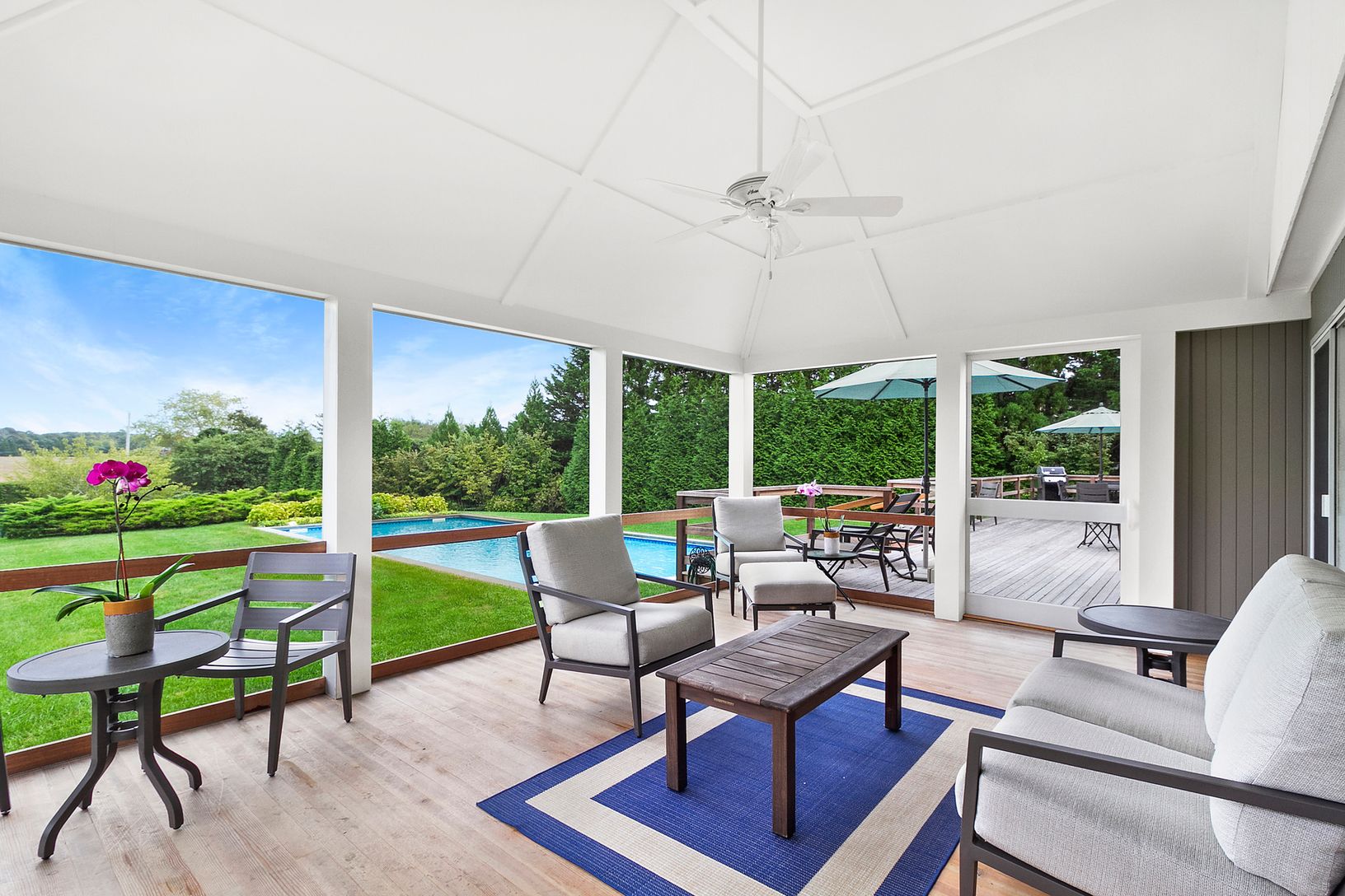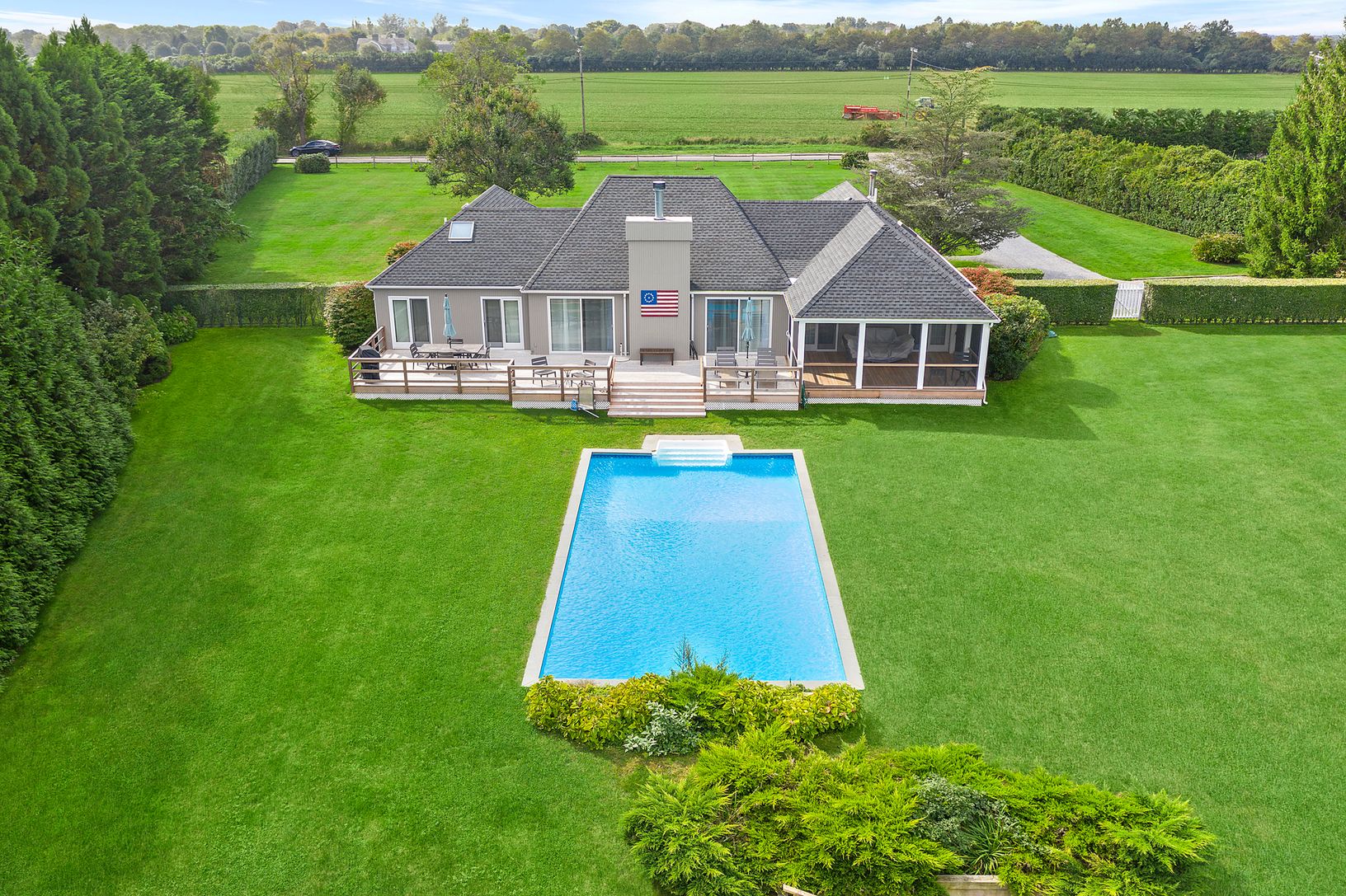 First time offered this wonderfully maintained contemporary south of the highway home offers unobstructed farm views in both directions. This 4 bedroom, 2.5 bath home features a cedar ceiling great room with fireplace and open views to the east to the private pool and farmland beyond. The kitchen is bright and open with a window looking to the western lawn and farm. The first floor master suite has sliding doors to an over sized screened porch