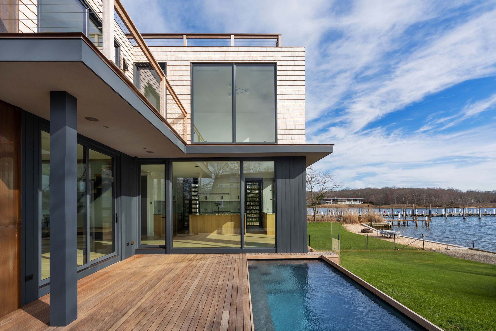 NOW COMPLETE & MOVE-IN READY. Boasting 74' of water frontage on 0.17 acres+/-, this new construction modern residence features 2,350 SF+/- of interior living with 4 bedrooms, 4 full and 1 half bathrooms. Resort-style ambiance abounds with a heated gunite pool and an 85' dock.