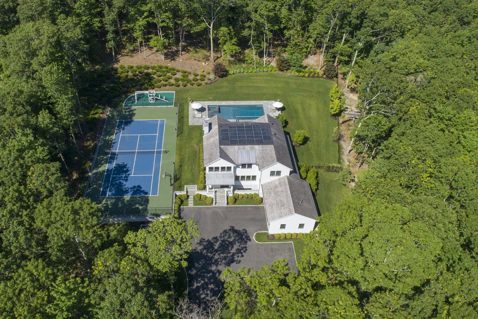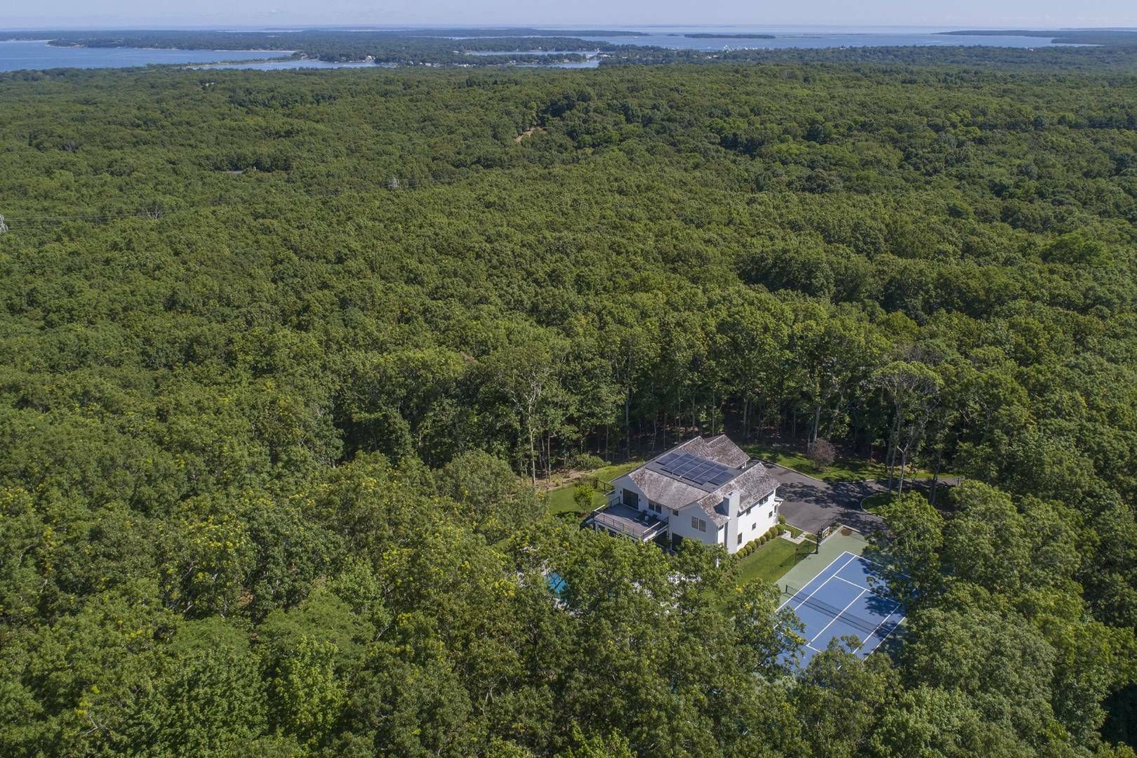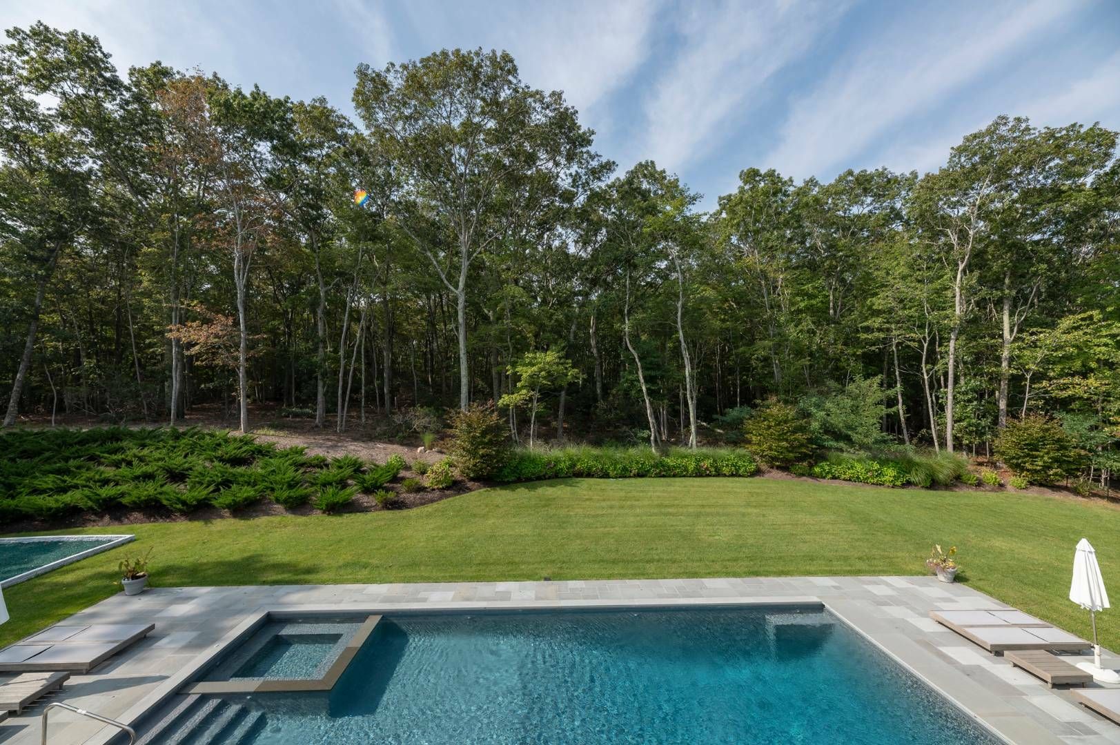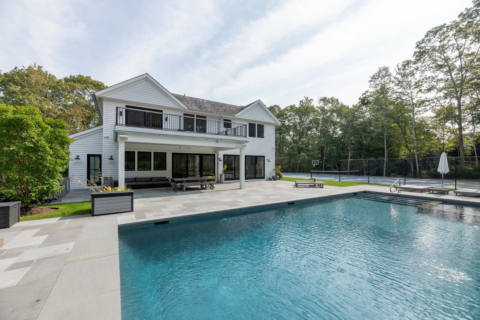 Enjoy peace and privacy on this gated 5.23+/- acre estate in Sag Harbor with two homes and two pools. The two homes between them have ten bedrooms, nine full and three half baths. A new construction two-story residence built by Farrell has seven bedrooms, six full and one half baths, plus an additional half bath off the patio. Enter to light-filled open living areas flowing among a living room with fireplace and glass doors to a spacious stone