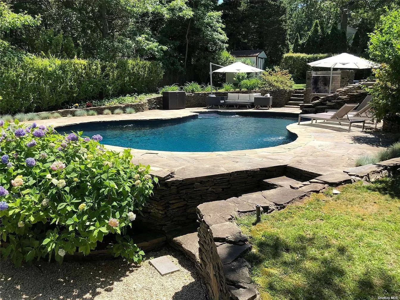 This perfectly situated crisp and clean beach house sits just 500 feet from Long Beach. With 4 bedrooms and 3 bathrooms over three floors and a newly renovated chef's kitchen, this home provides an abundance of comfort and convenience with beautiful details throughout. An upstairs balcony provides some glimpses of the bay. Outdoors, the heated gunite pool is surrounded by specimen trees and plantings, creating a private oasis. Multiple levels
