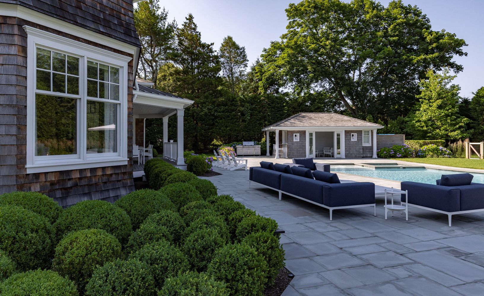 Experience the privacy and luxury afforded by this gorgeous 2018-built Hamptons estate with a gated entry and classic cedar shake siding in prime South Water Mill. The 10,500 SF custom-designed gem by Heartwood Construction blends traditional charm with modern style, and is nestled on an impeccably-landscaped shy acre enveloped by mature evergreen trees. Lushly landscaped, secluded grounds with pastoral views are complemented by a 20x40 heated