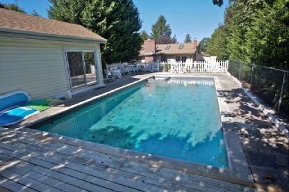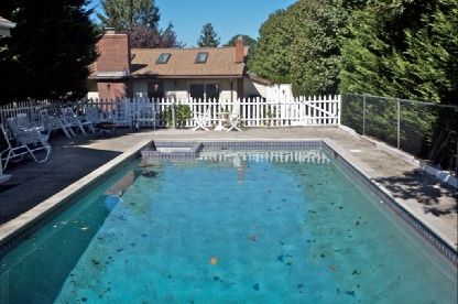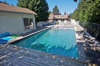 Features include sunny, large, open living room with wood-burning fireplace, large ktchen with lots of counter space and bar seating, finished basement with media den, large master bedroom with private deck, heated gunite pool, spacious decking and a lovely pool house.
