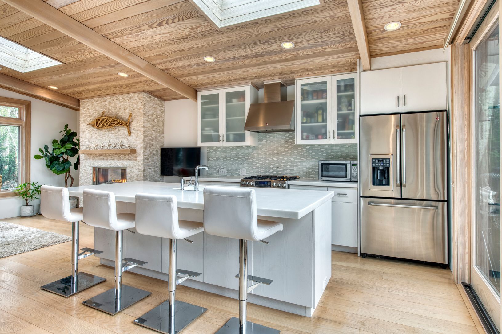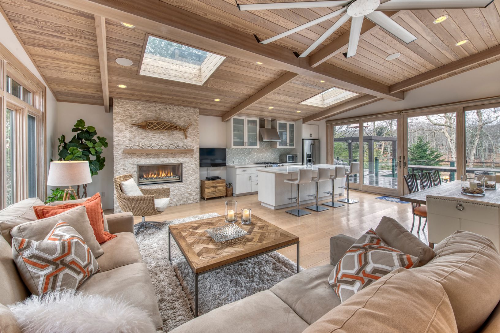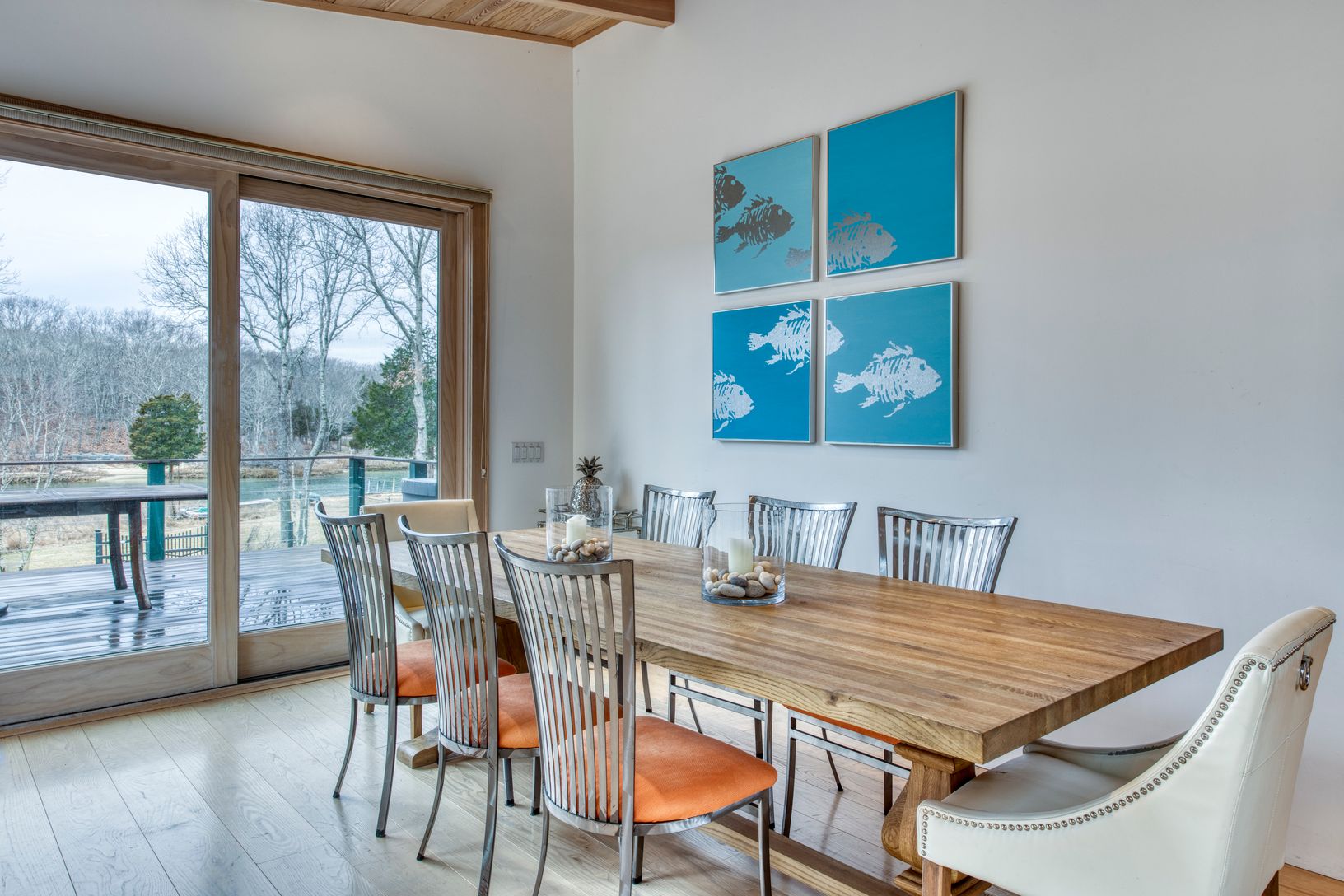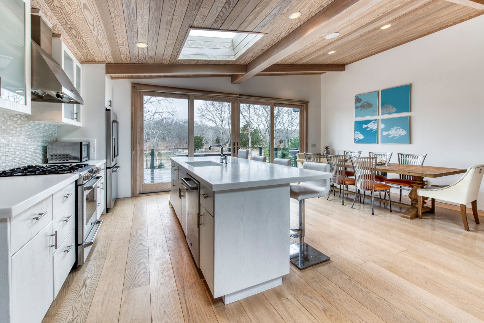 Completely renovated 3,000 square foot home in the Springs hamlet of East Hampton has westerly sunset views of Hog Creek estuary , a rare 8' x 16' floating dock for up to a 27 foot boat, 100' of private waterfront and direct access to Gardiner's Bay. Totally updated in 2014 This modern home features an open layout perfect for entertaining both in and out, wide plank ash floors on main level, eat-in-kitchen with large island, stainless applianc