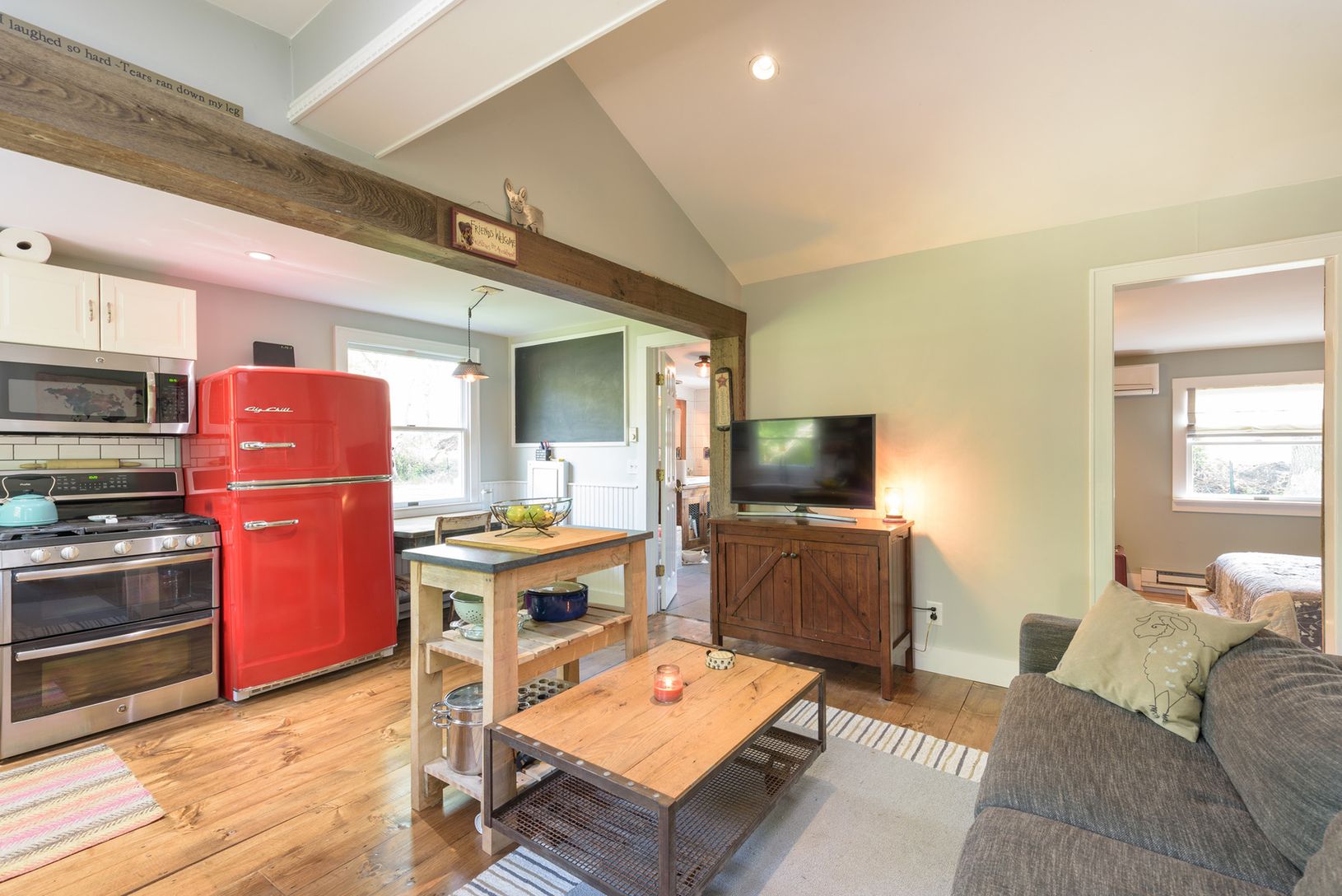 This completely renovated lovely hideaway is nestled at the end of a very private lane. It is ready for your Hamptons casual life! This easy style of living is what you deserve. The kitchen features a "cool" Big Chill red refrigerator and other updated stainless appliances. The two bedrooms and large bath are well appointed. Many of the features of the house are reclaimed items and include Vermont Pine Floors from sustainable pine farms. The