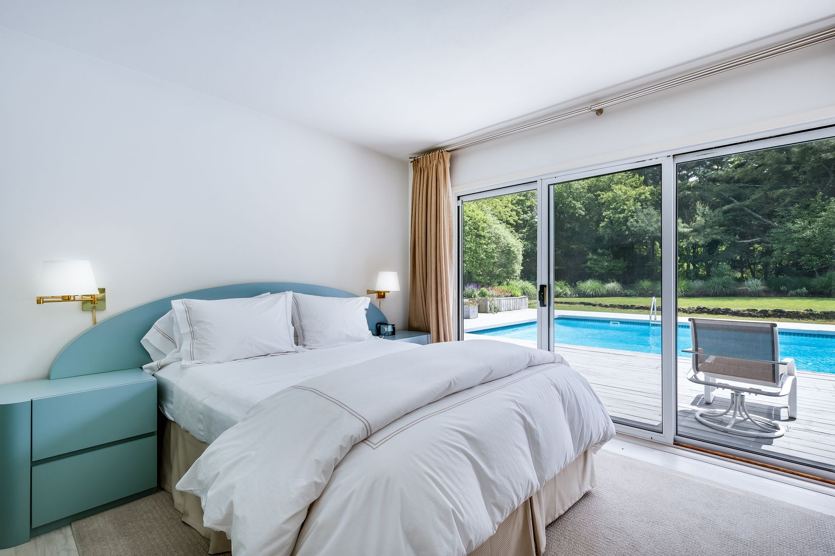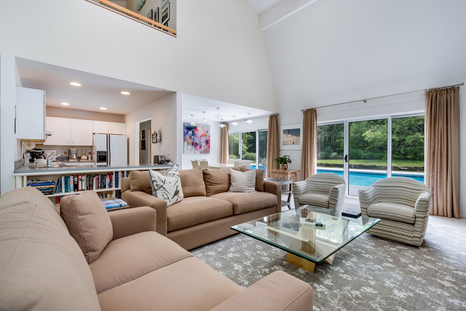 Set among horse and farm country, this 1.37 acre Water Mill property is landscaped for privacy with magnificent evergreen and perennial plantings. The open floor plan enjoys a wall of glass doors, allowing the beautifully designed grounds to meld into view year round. The oversized 50' x 20' pool is surrounded by a large deck, Japanese garden, a stacked stone wall detail and a pergola for entertaining. The living room boasts a soaring beamed c