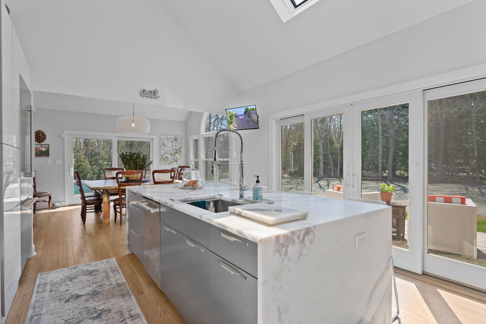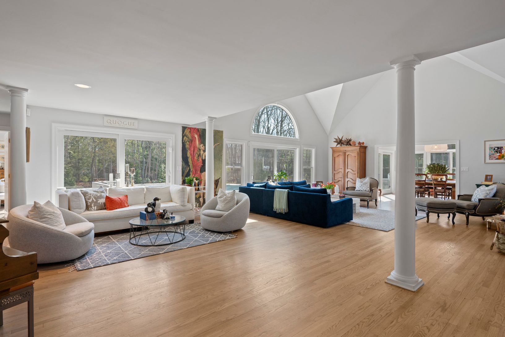 Tucked away behind beautiful mature landscaping, this fully updated 6-bedroom, 4.5-bathroom home is the perfect summer escape. Open, airy, and filled with natural light, the spacious living areas flow seamlessly into a stunning chef's kitchen with high-end appliances, custom cabinetry, and a large center island - ideal for relaxed summer living and entertaining. The flexible layout offers both first-floor and second-floor primary suites, provi
