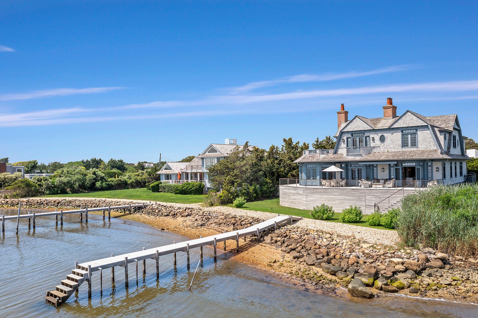 First Offering of This Bayfront Beauty! Custom designed by renowned architect Stuart Disston and constructed by Sea Level in 2011, this Nantucket style shingled home on Moriches Bay is a paragon of exceptional craftsmanship and the finest attention to detail. The deep flag lot setting and adjacent protected land afford privacy while the open bay offers a panorama of water views across to Dune Road. Expansive mahogany decking, heated gunite poo