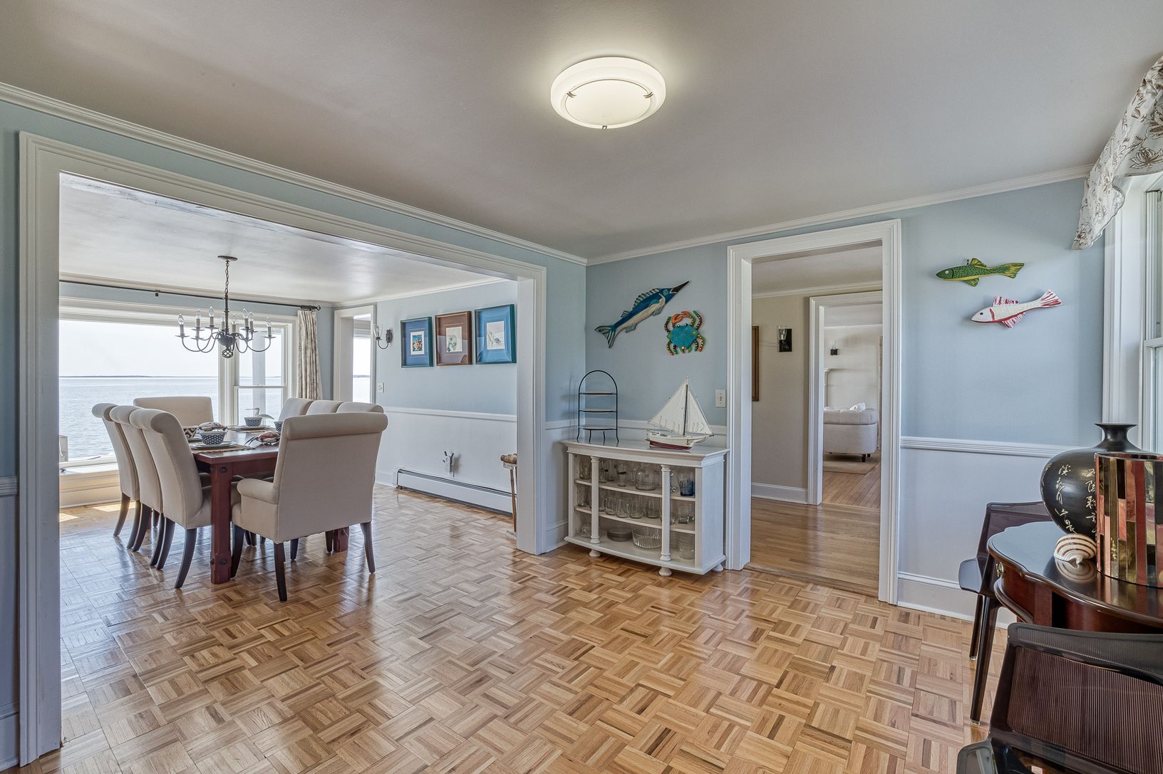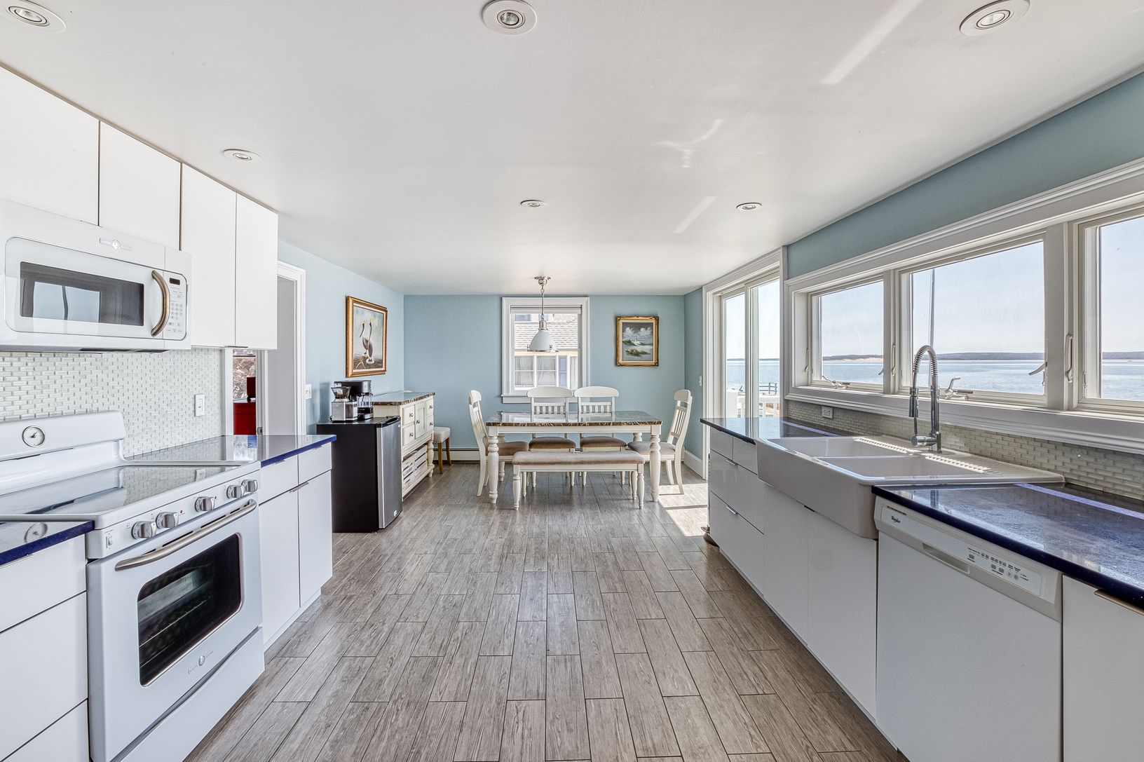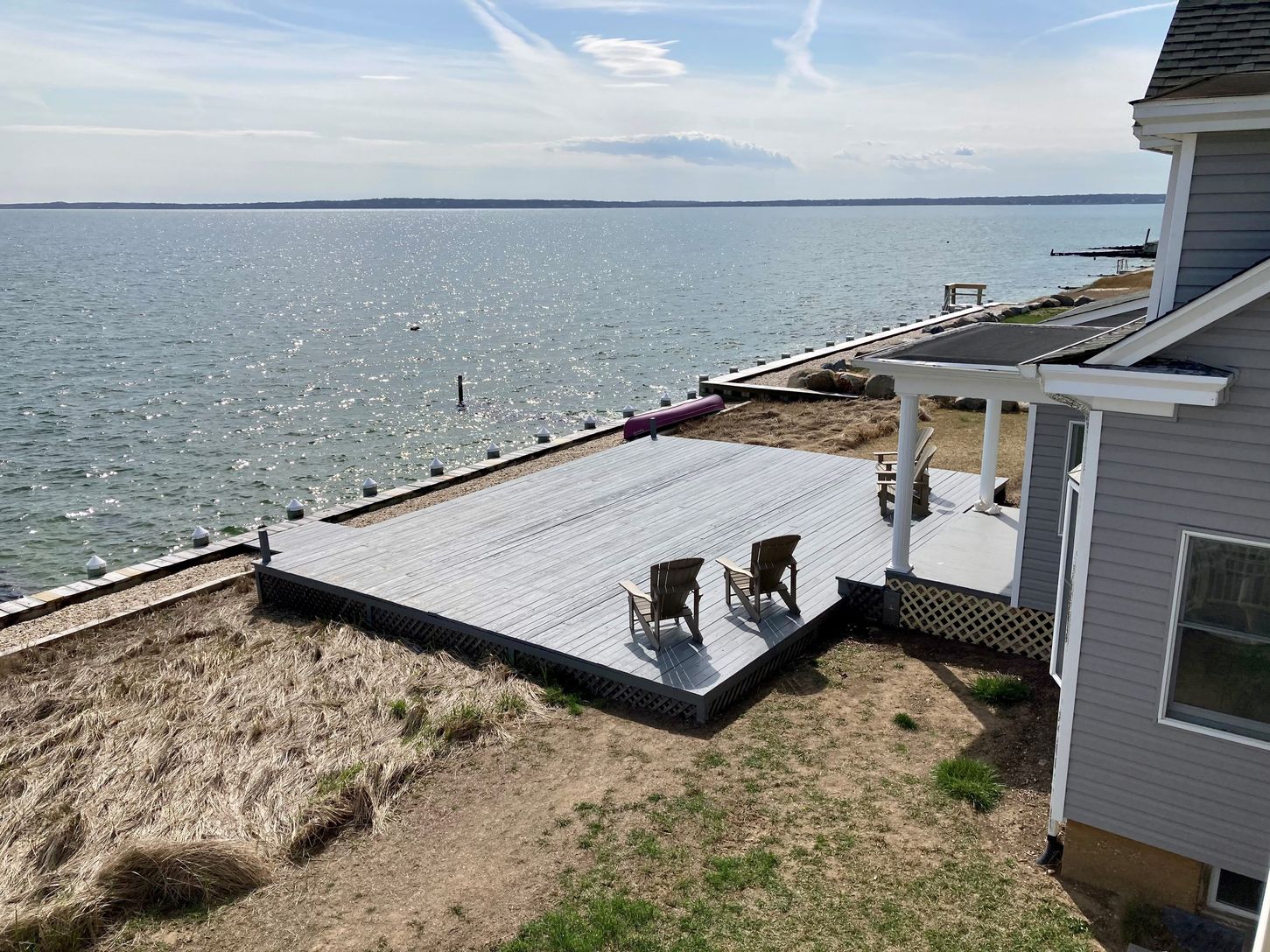 Spectacular renovated bayfront home at 380 Midway Road, Southold, embracing the prevailing southwesterly breezes and sweeping views over the Peconic Bay to the South Fork. The expansive waterside deck is destined for entertaining and cocktails at sunset while the beachfront bulkhead is a great spot to enjoy coffee in the morning. The impressive home spans two wings, each with bedrooms and entertaining spaces. The center of the homes features a