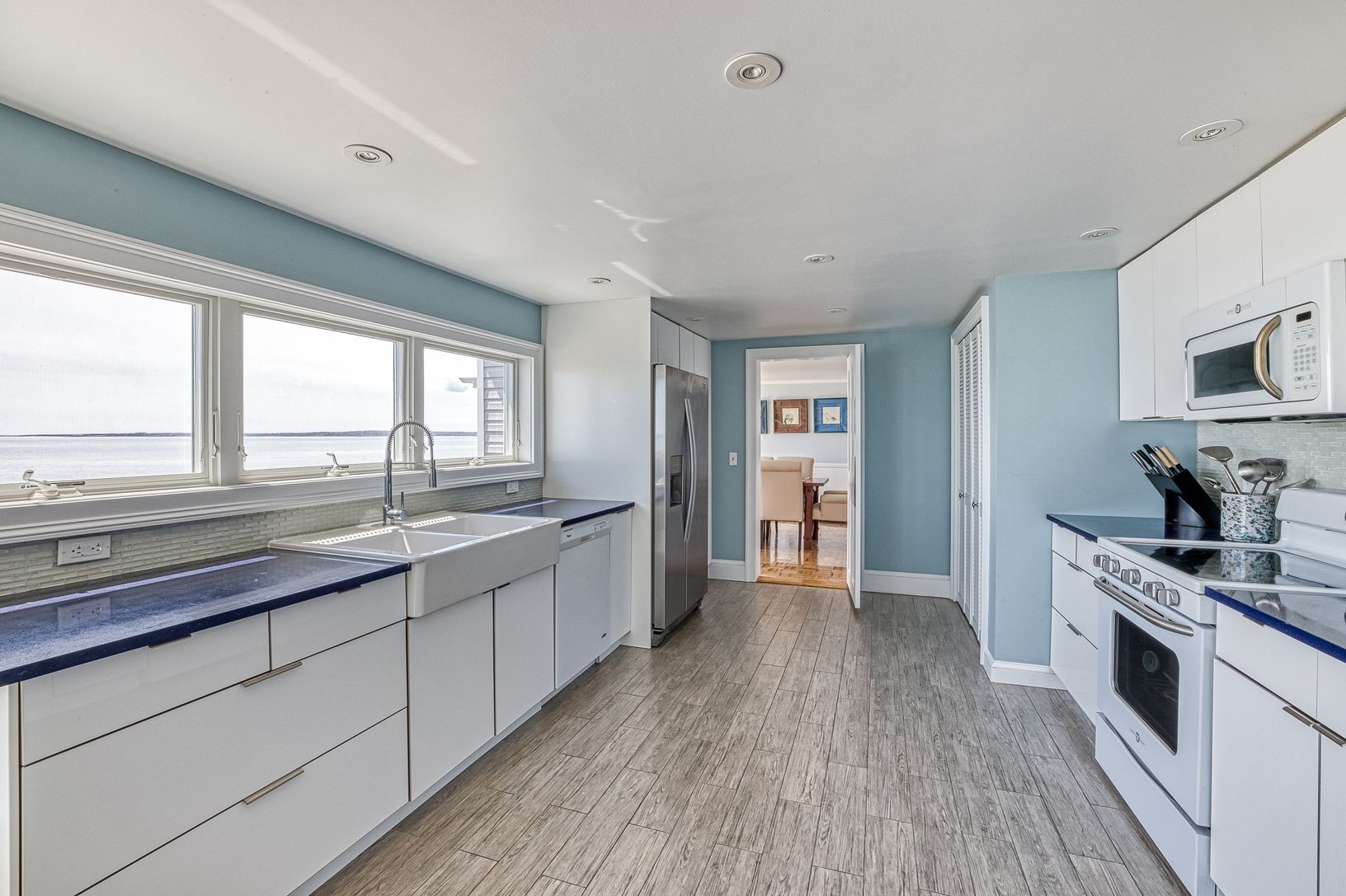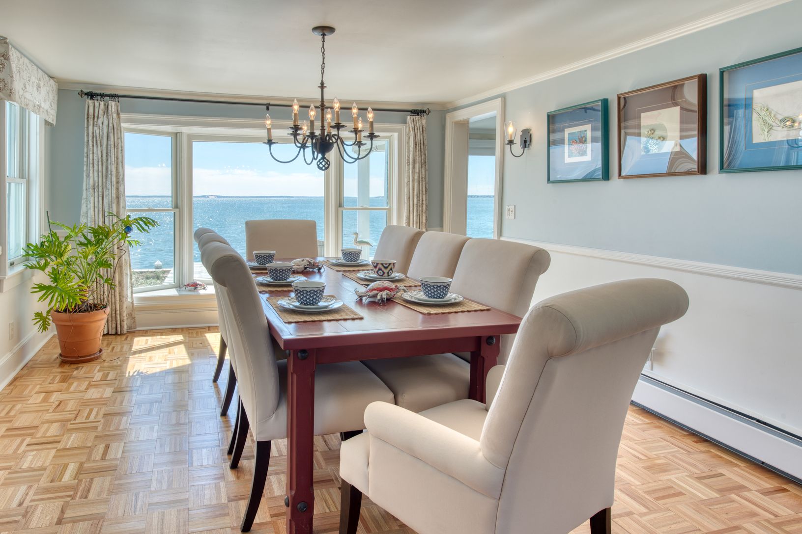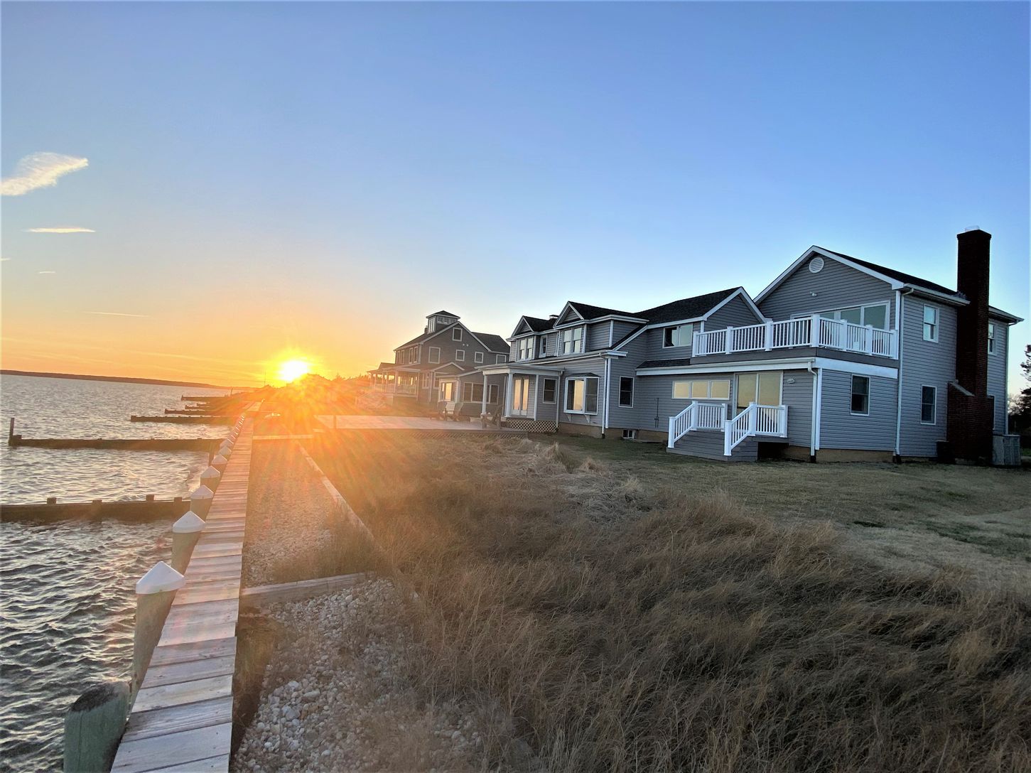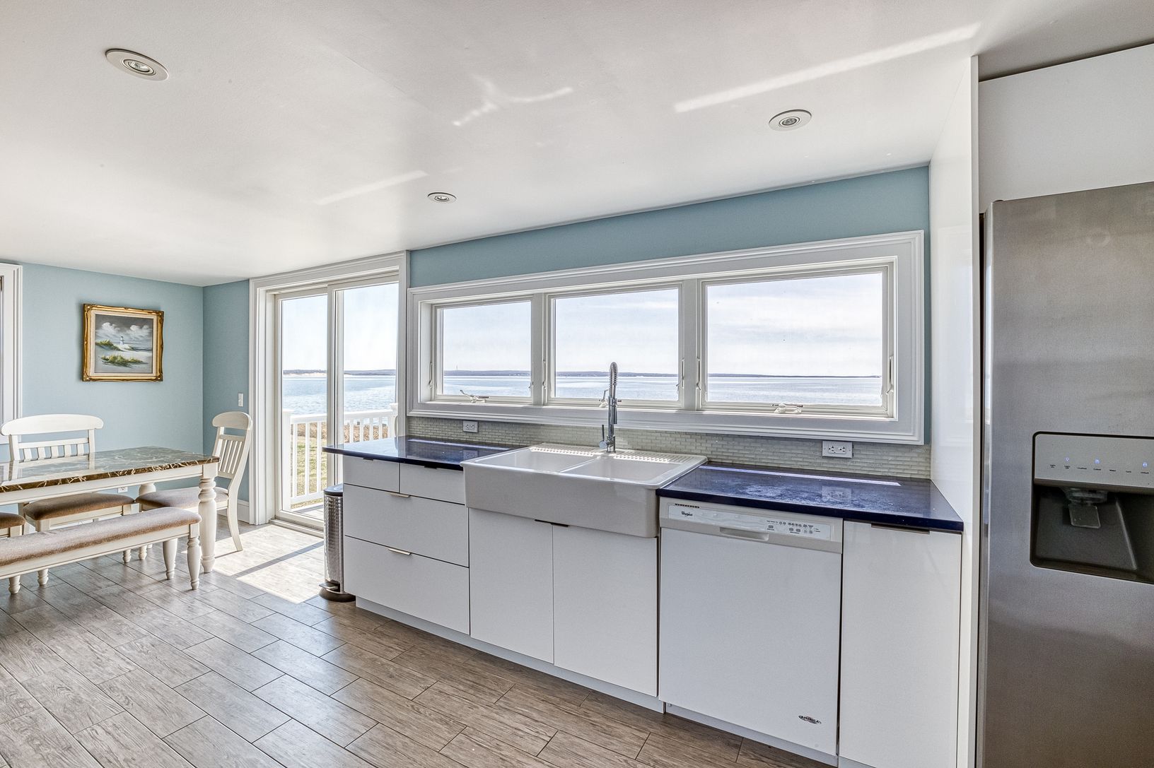 Spectacular renovated bayfront home at 380 Midway Road, Southold, embracing the prevailing southwesterly breezes and sweeping views over the Peconic Bay to the South Fork. The expansive waterside deck is destined for entertaining and cocktails at sunset while the beachfront bulkhead is a great spot to enjoy coffee in the morning. The impressive home spans two wings, each with bedrooms and entertaining spaces. The center of the homes features a