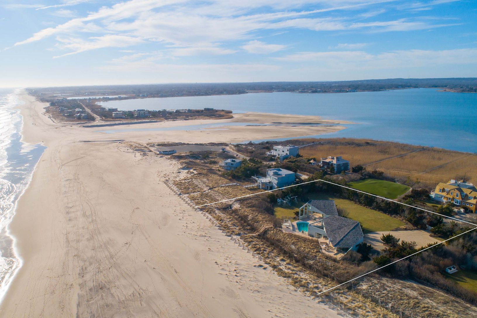 Occupying 2.6 acres+/- on one of the Hamptons' most prized stretches of oceanfront, 381 Dune Road offers direct Atlantic frontage, sweeping dual-water vistas, and an expansive building envelope capable of supporting a large estate. Elevated above the dunes, the property provides panoramic views of sunrise over the ocean and sunset over Shinnecock Bay.