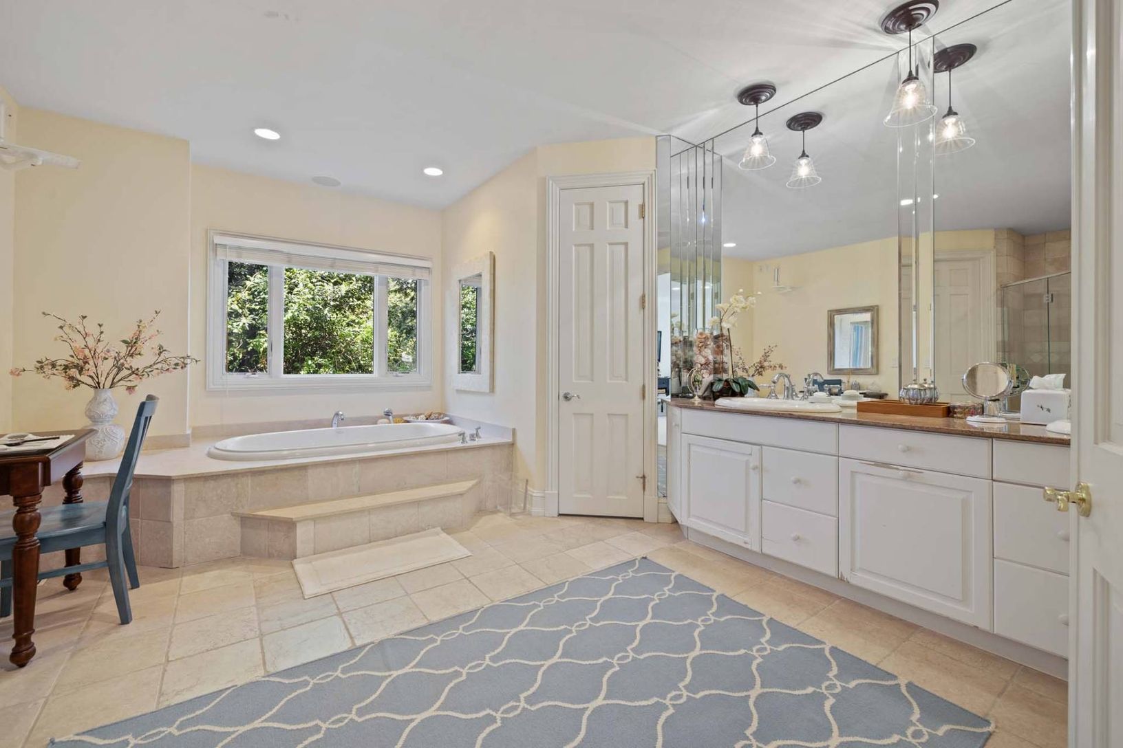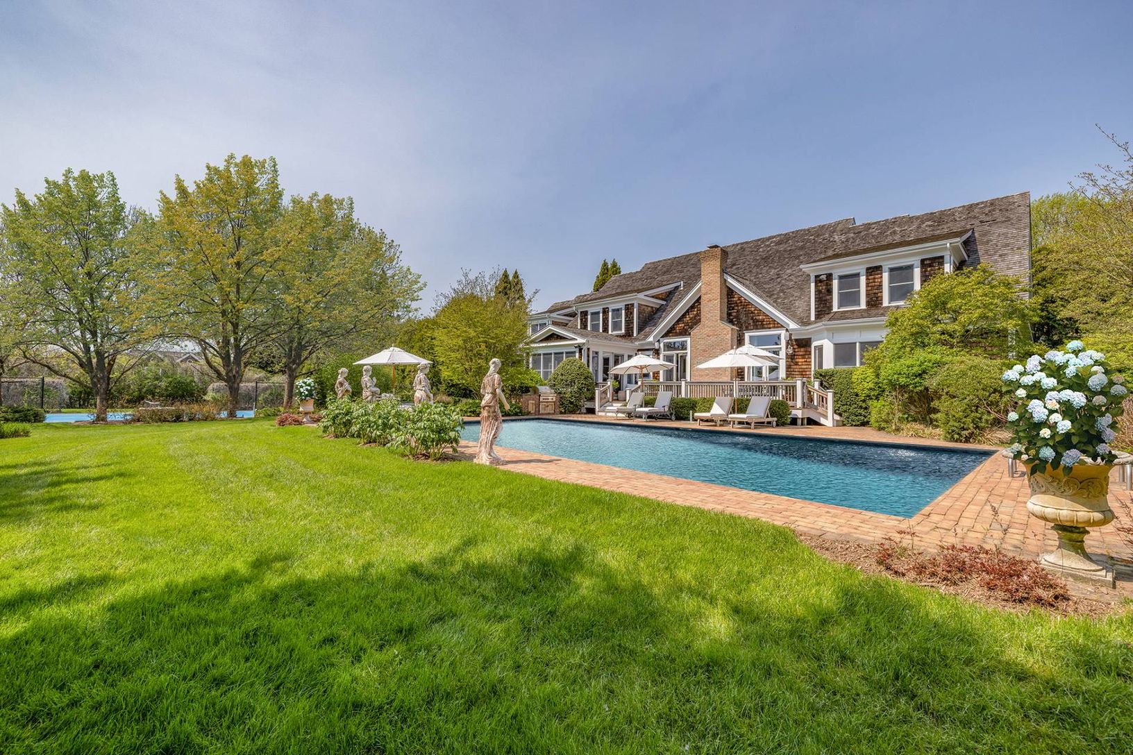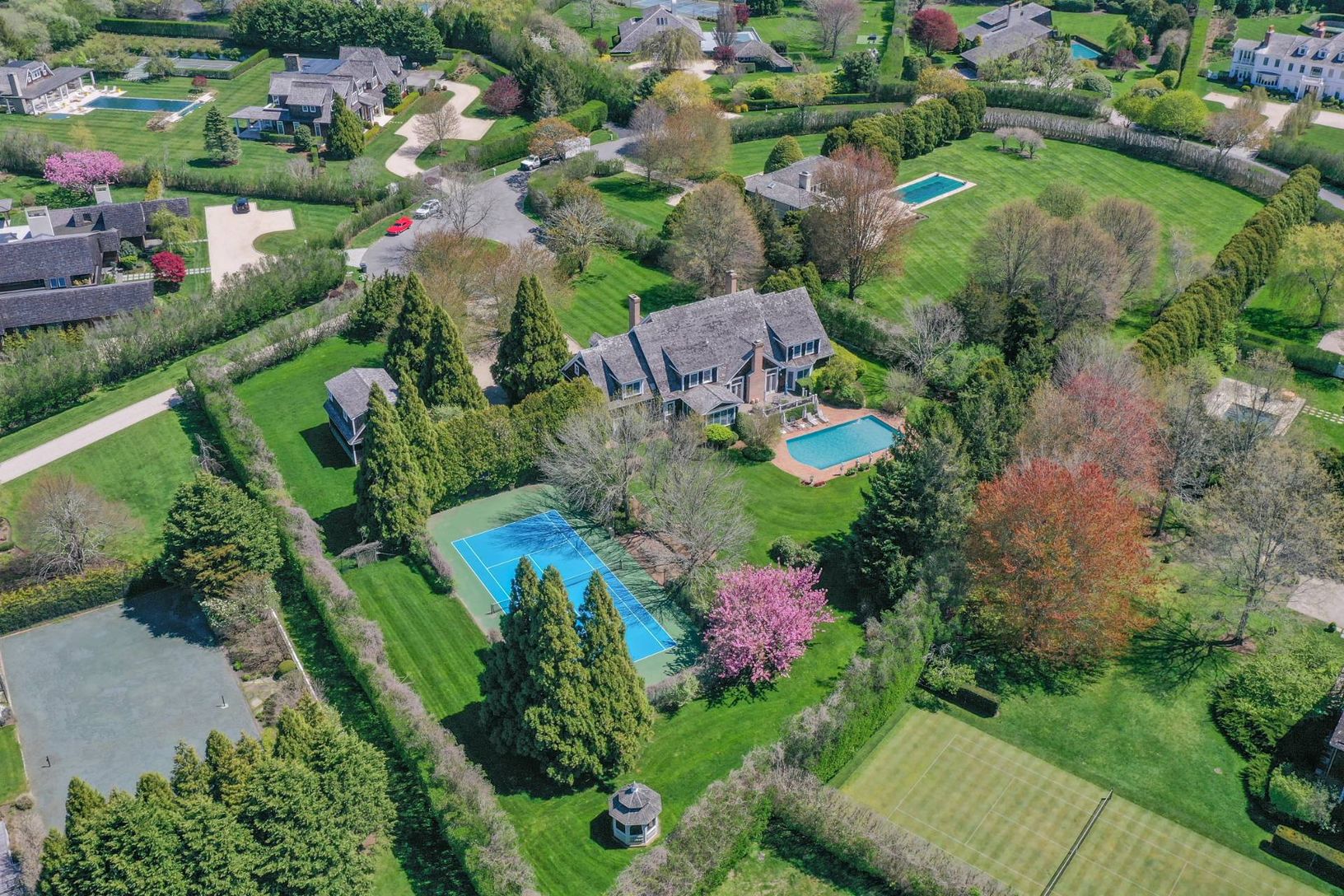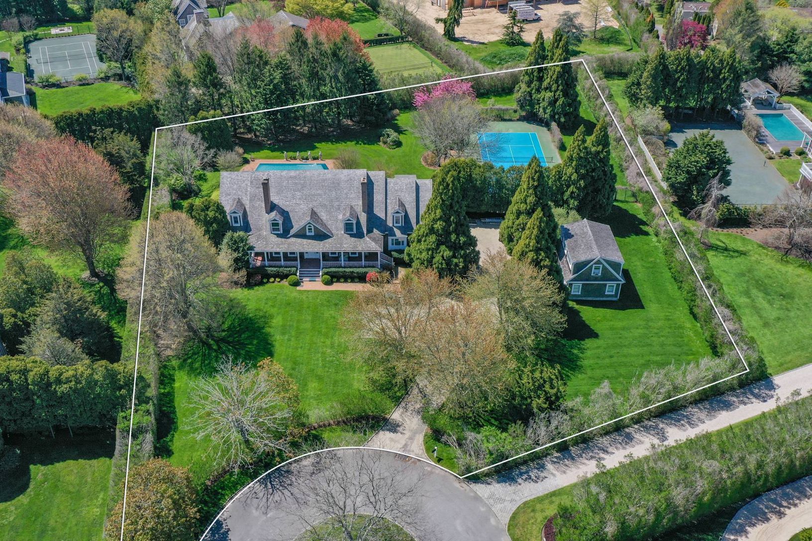 Located at the end of a quiet cul de sac street 1.5 miles from Flying Point Beach in Water Mill South, this 7,500 sq. ft. home (including finished lower level) has all the toys one might want for maximum Hamptons enjoyment. The 1.5 acre property has lush, mature landscaping with extensive exterior lighting, an all weather tennis court with basketball hoop, a detached two car garage with a finished studio above with a full bath, and an electri