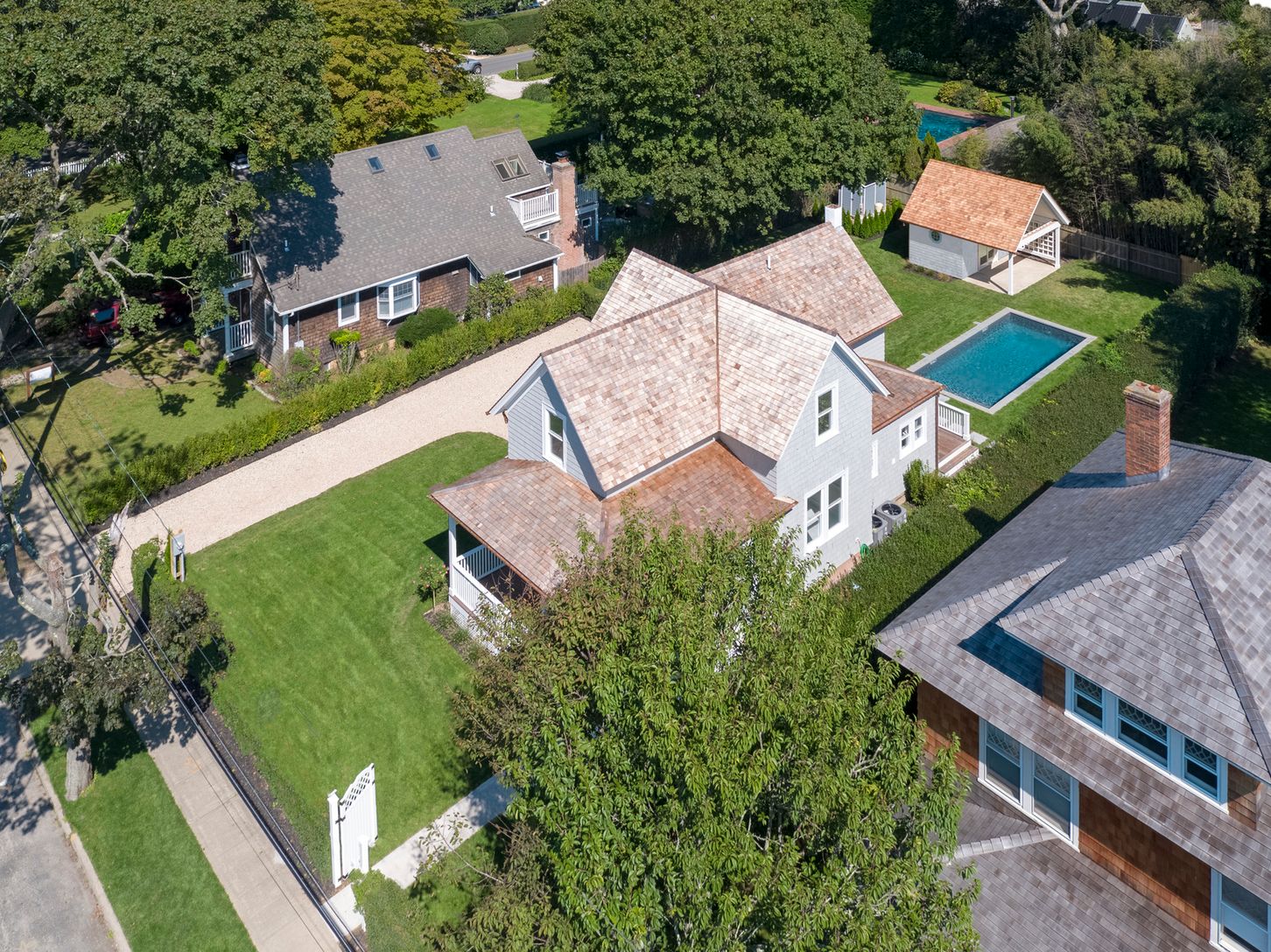 Leave the car and take the Jitney or train to this impeccably renovated 4 bedroom, 3.5 bath historic home in the heart of Bridgehampton steps from Main Street. No detail spared. From built-in Gaggenau espresso machine to a custom-built pool house with an outdoor shower. Enter the covered porch, overlooking the reserve, into the front parlor. The first level includes a junior master suite, eat-in chef's kitchen, formal dining room, and a mudro