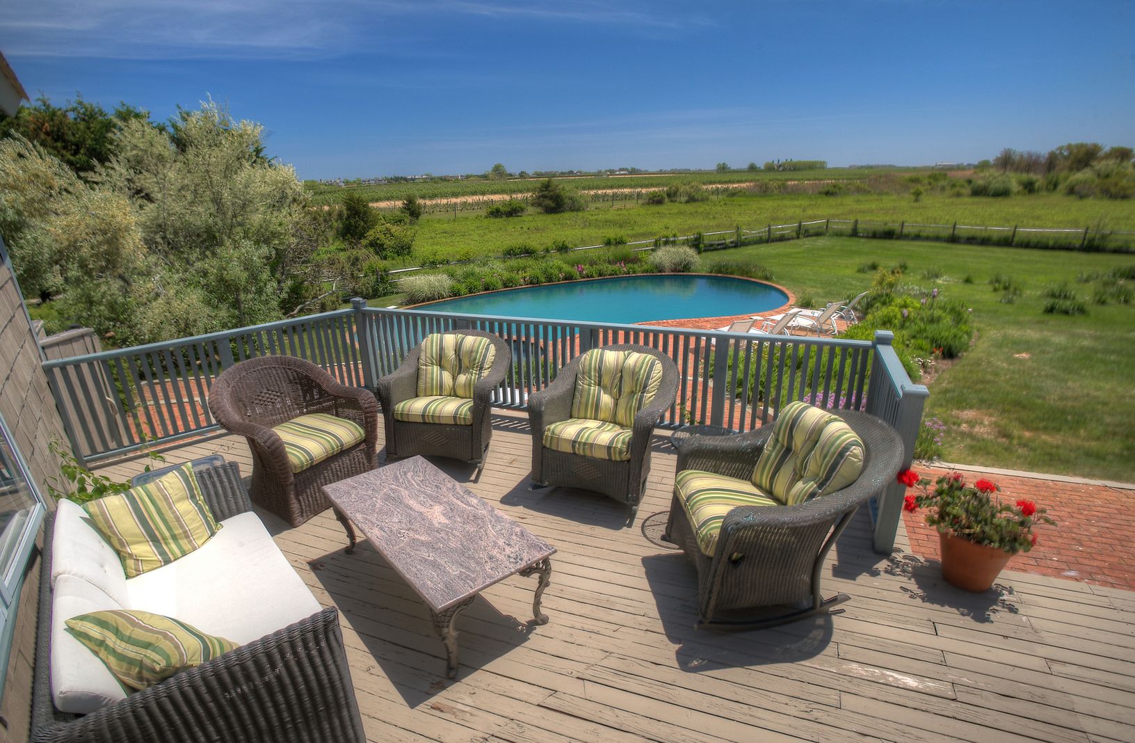 Charming two-story traditional home on a beautiful landscaped acre overlooking reserve, apple orchard, Mecox Bay and ocean views. This home is beautifully furnished, features 4 bedrooms, 3 baths, living room with fireplace, kitchen, formal dining room and sunroom. Enjoy entertaining on the outside deck or a swim in the heated Gunite pool, perfect summer living!