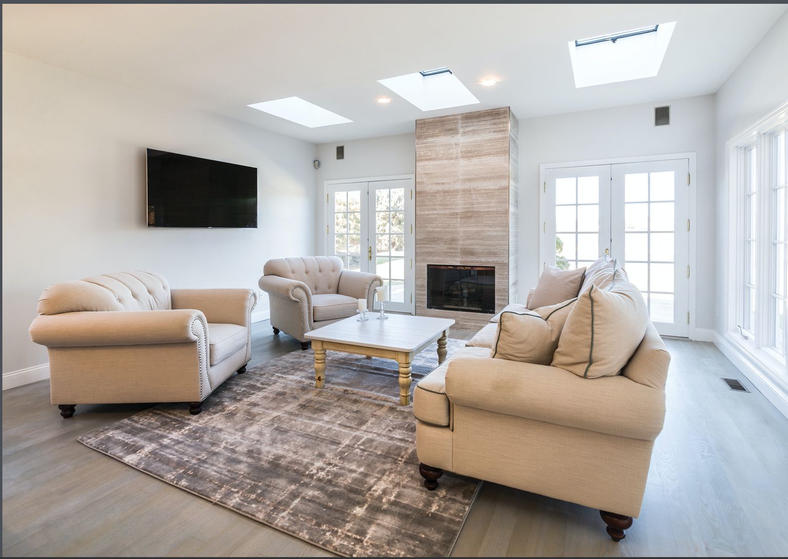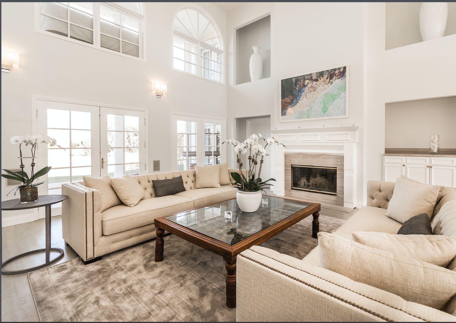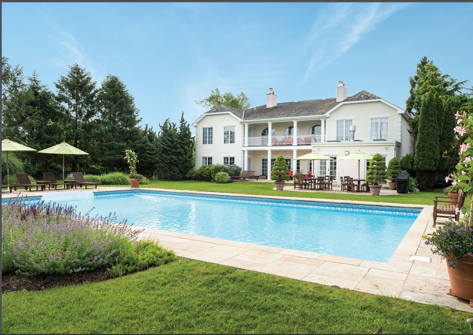 Spend your summer in this luxurious private rental South of the Highway! The interior has been completely renovated with tasteful, high end finishes creating the ultimate in high end style. Six large bedrooms, Six full baths, and one half bath. The En Suite is straight out of Architectural Digest. Located on the second level is a Jr. Master bedroom. The home features a formal dining room for entertaining, den, open living room with double hei