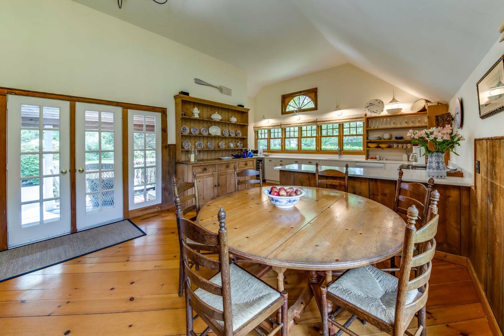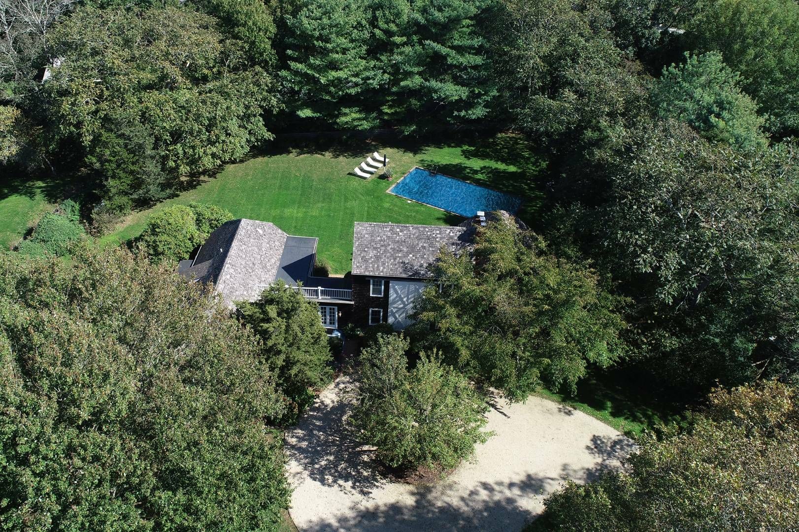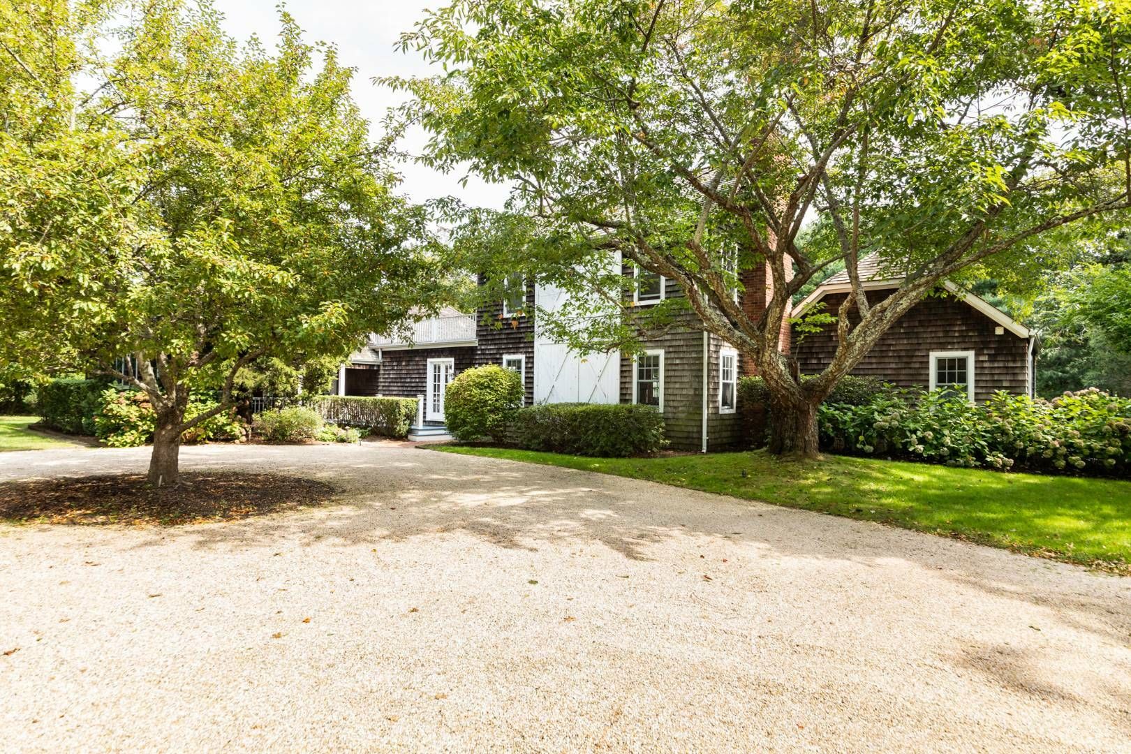 On a quiet cul-de-sac in the heart of Bridgehampton this enchanting barn-style home on a just-shy acre, set amid spacious lawns and majestic old trees, offers 3,800+/- sq. ft. of living space with 4 bedrooms and 4.5 baths. Glass doors opening from several rooms make it easy to entertain indoors or out. Exposed beams and rustic wood accents enhance the charm of this much-loved home. Enter through double doors to a gallery connecting two wings o