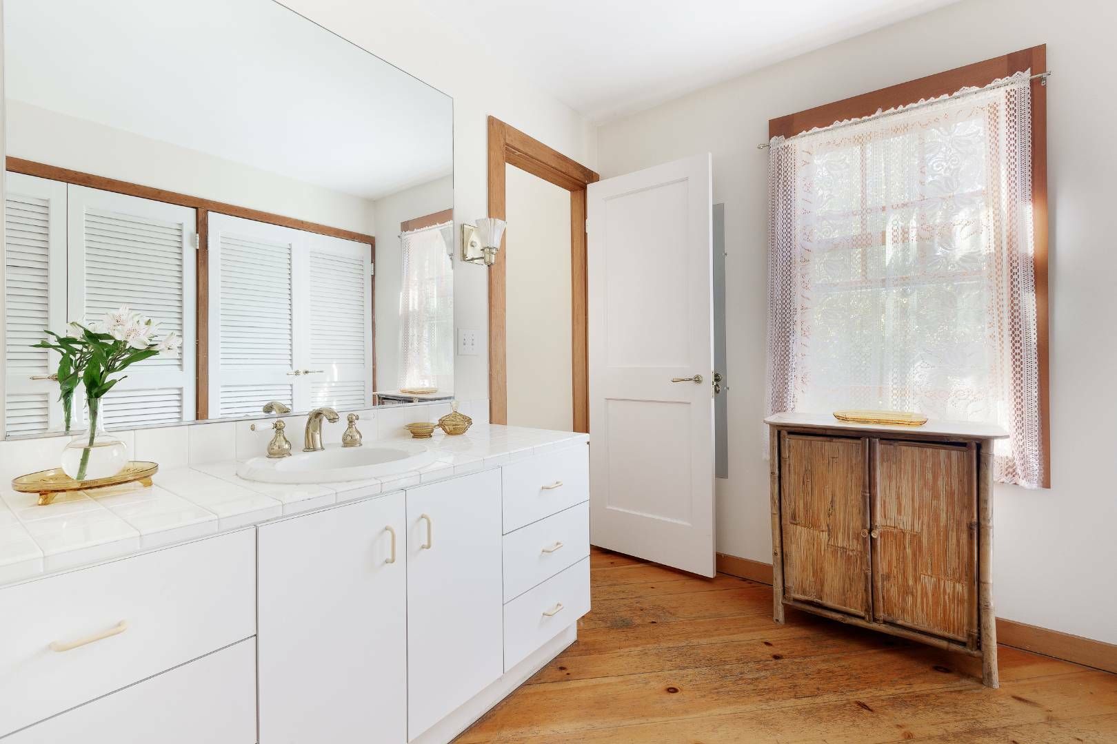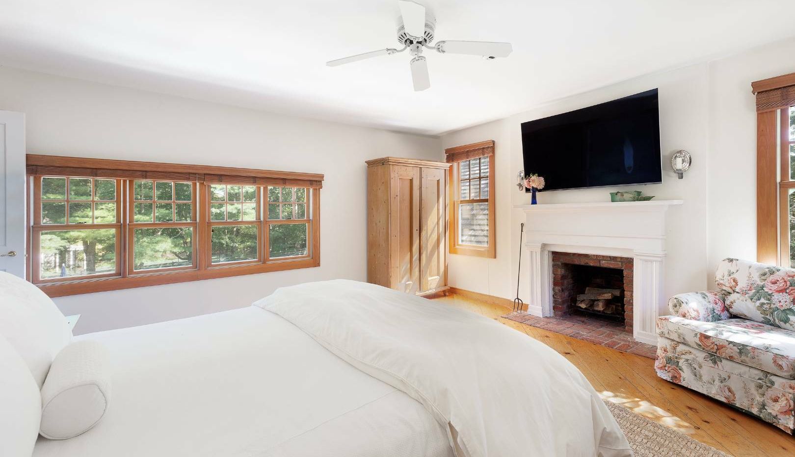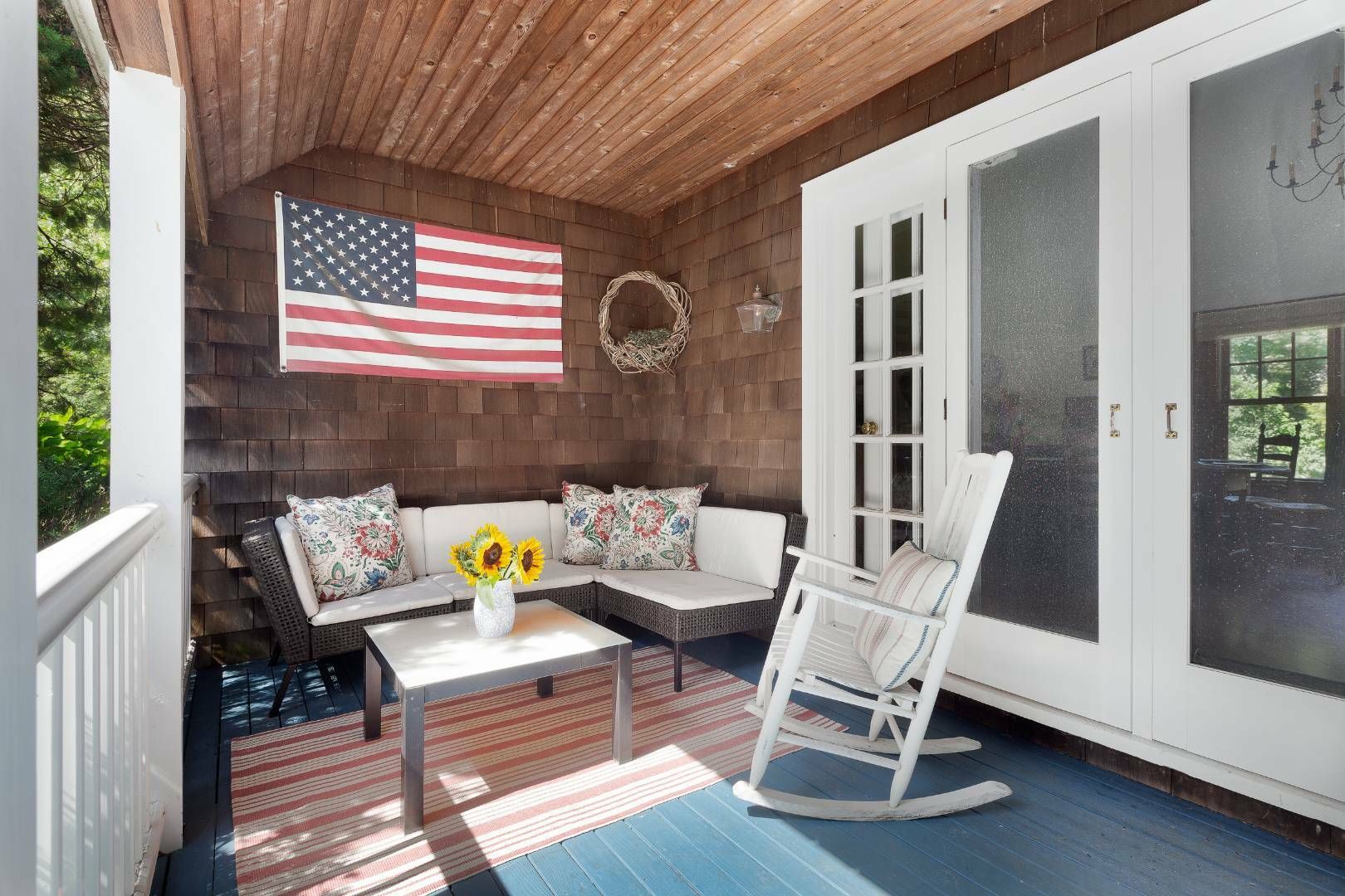 On a quiet cul-de-sac in the heart of Bridgehampton this enchanting barn-style home on a just-shy acre, set amid spacious lawns and majestic old trees, offers 3,800+/- sq. ft. of living space with 4 bedrooms and 4.5 baths. Glass doors opening from several rooms make it easy to entertain indoors or out. Exposed beams and rustic wood accents enhance the charm of this much-loved home. Enter through double doors to a gallery connecting two wings o