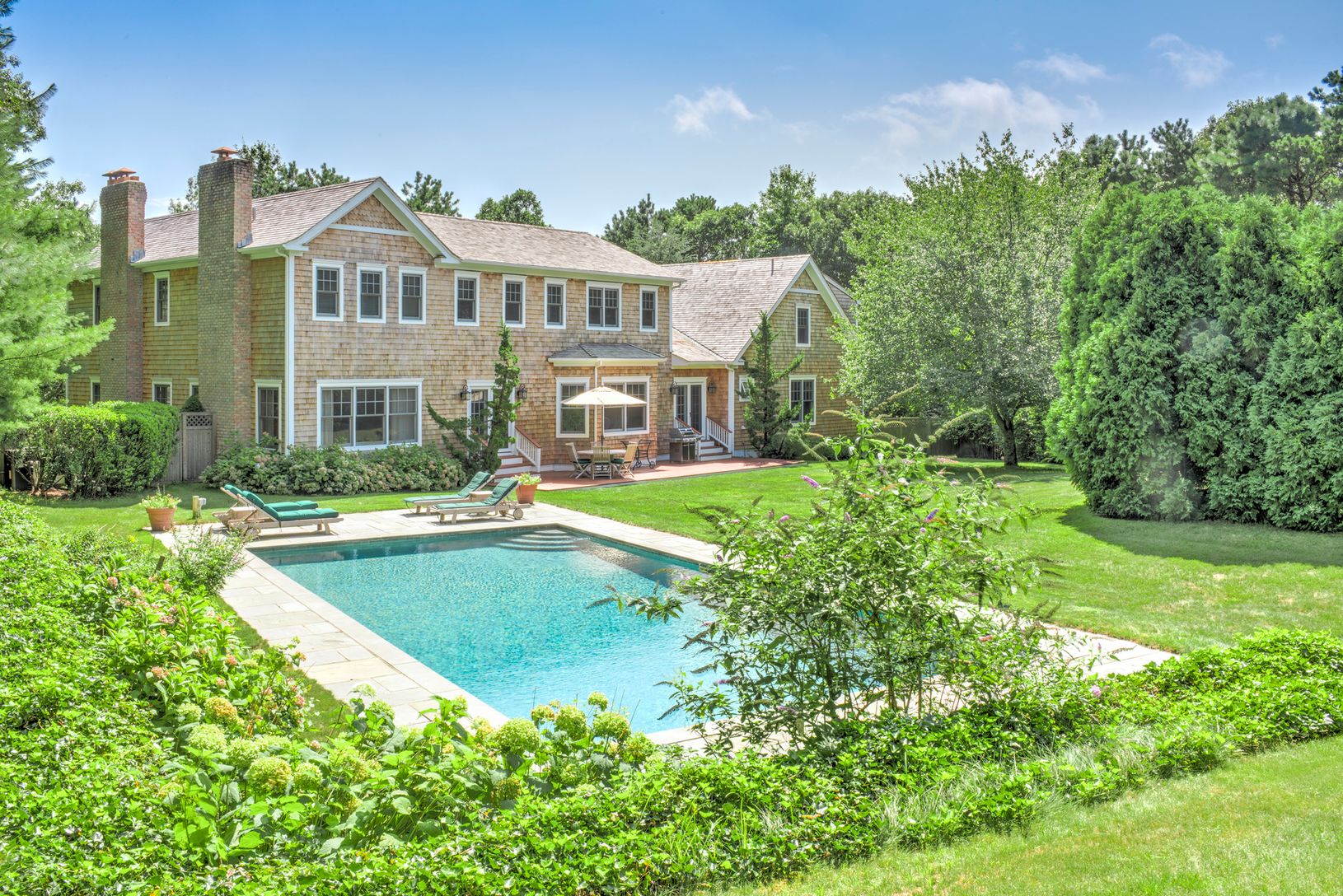 This immaculate home on a tranquil cut de sac close to Southampton Village is the perfect Hamptons retreat. The unique property with a heated gunite pool and all weather tennis is surrounded on three sides by Southampton Town reserve (scenic easement) and located at the end of Wireless Way...just minutes from the village. The first floor main part of the house features a coffered living room with woodburning fireplace, a full and a half bathr