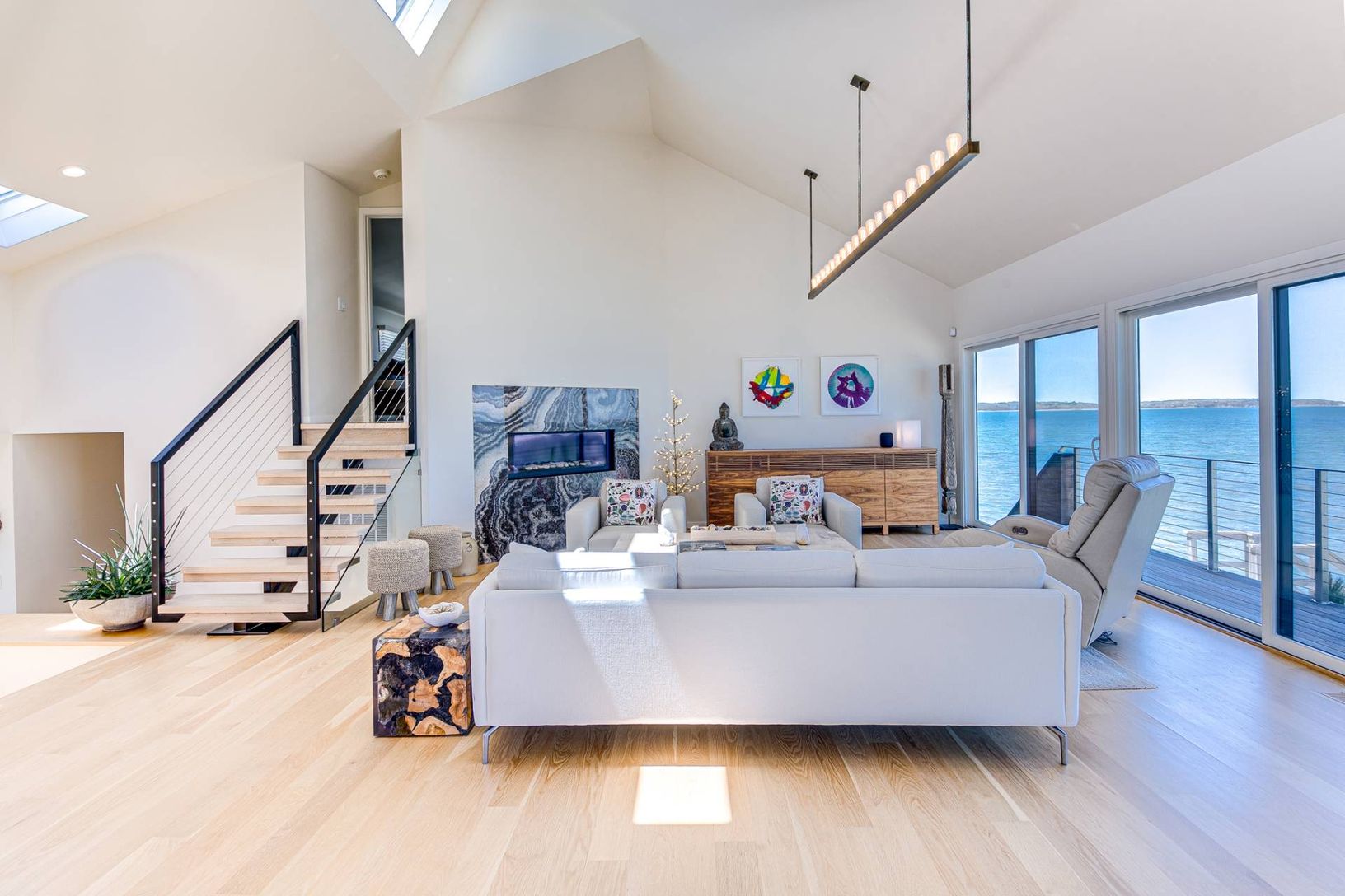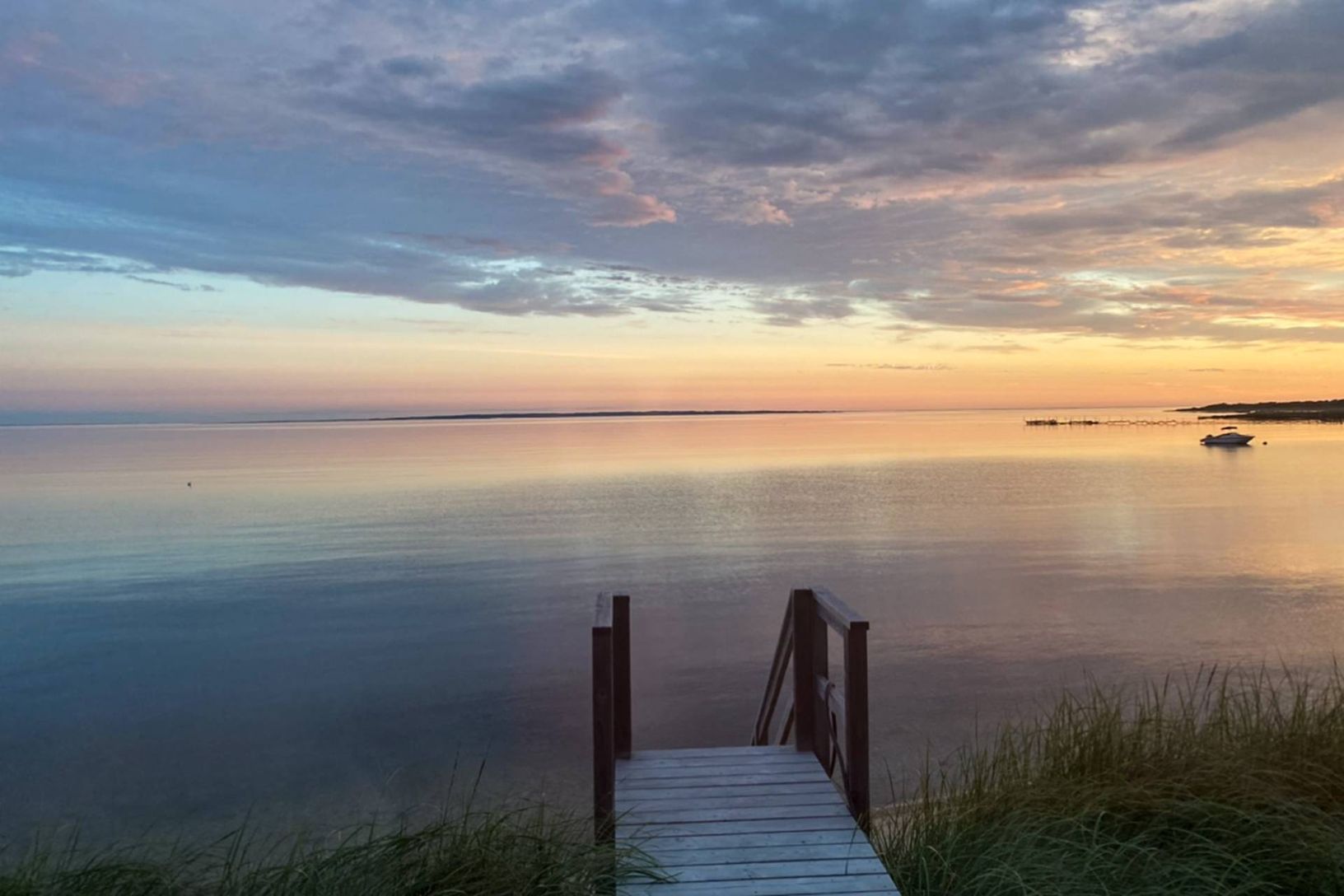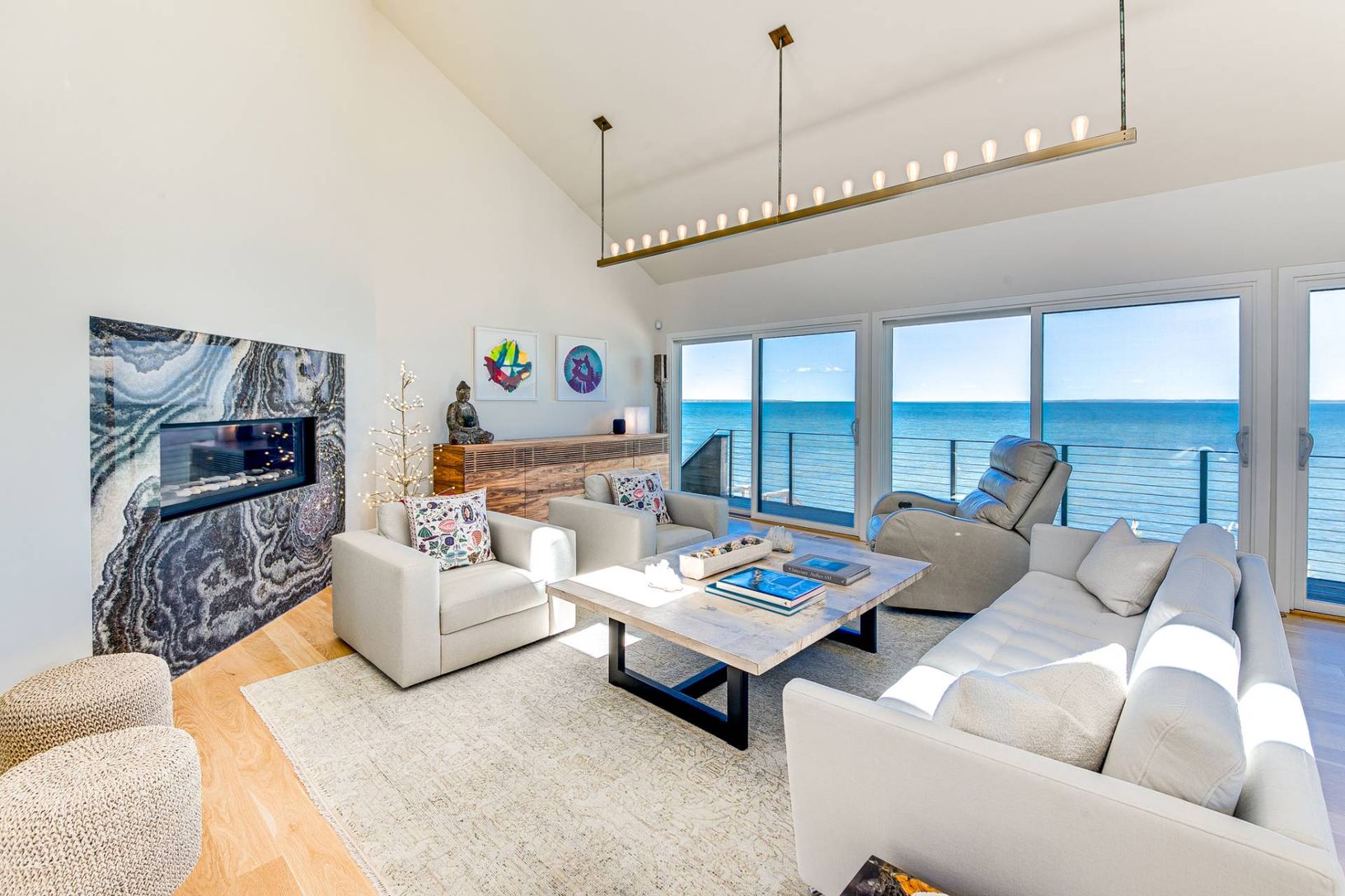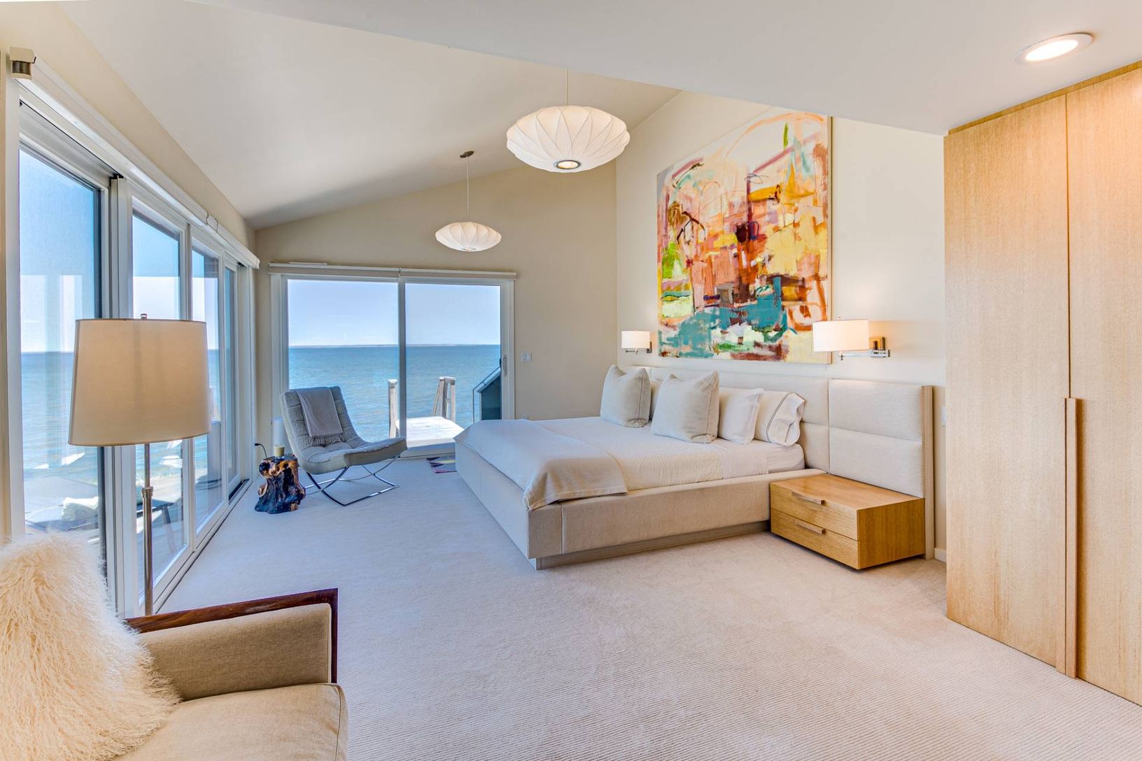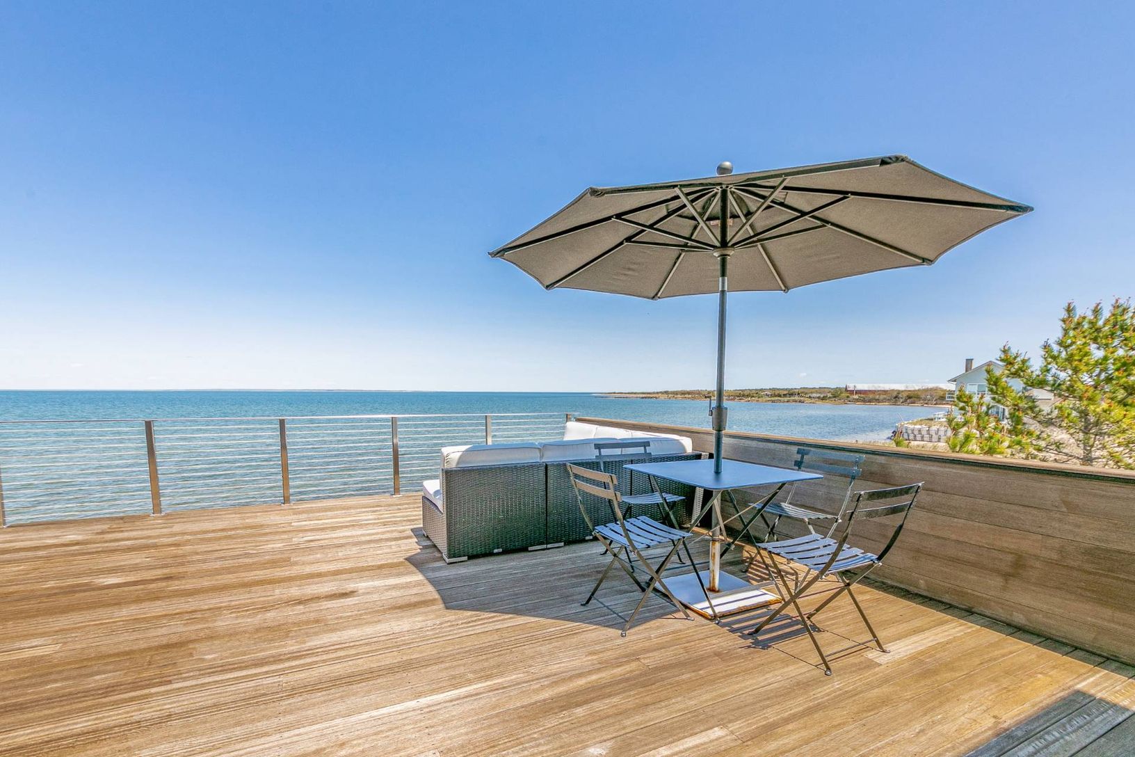 Located on Amagansett's coveted Cranberry Hole Road, this contemporary waterfront home offers unending views with spectacular sunsets from every room, especially the great room with its walls of sliding glass doors. Light cascades from skylights in the cathedral ceilings to the natural oak floors adding a touch of warmth to this approximately 3,000 square feet home featuring 3 bedrooms and 3.5 bathrooms. Outside the door is your own private be