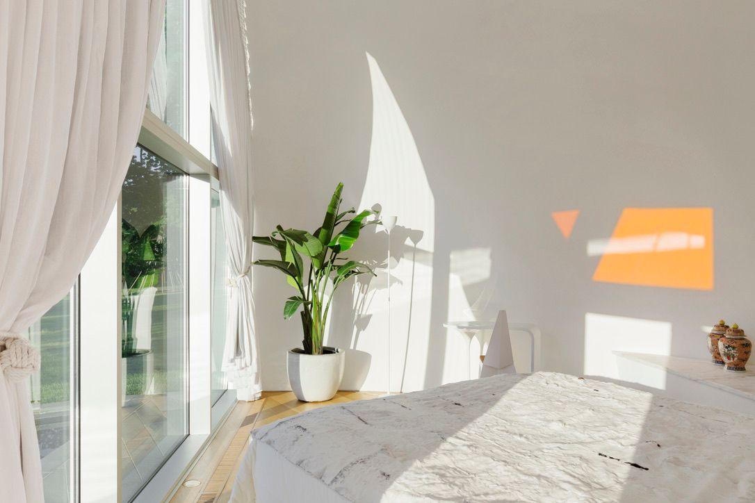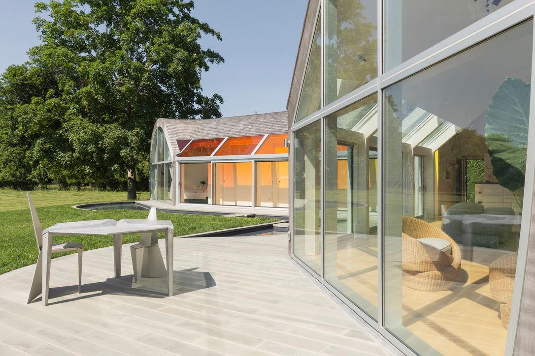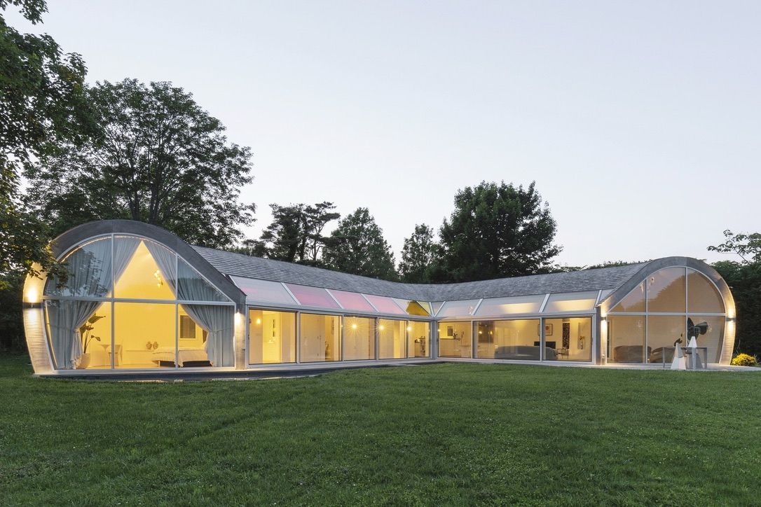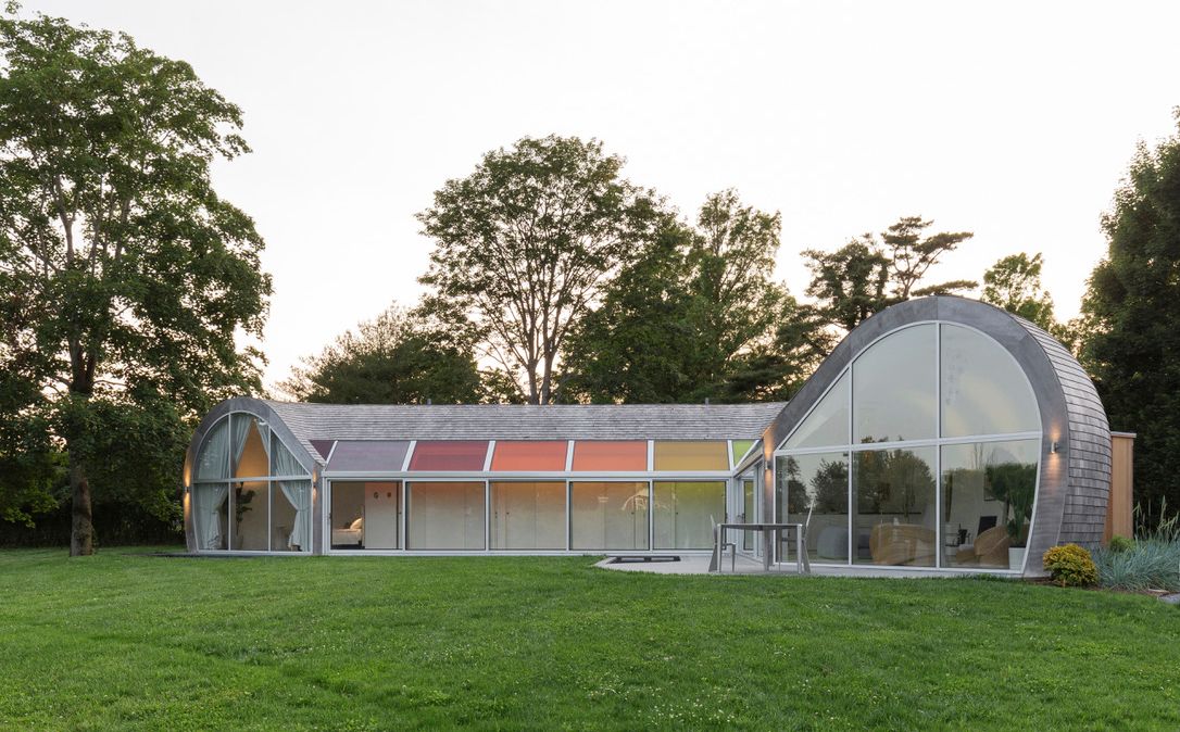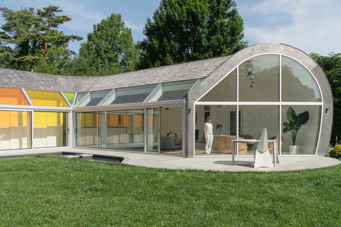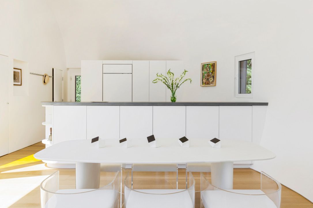A true architectural masterpiece, Cocoon House blurs the line between design and art. A cistern-reflecting pool wraps around the east and south sides, cooling the air, irrigating the lawn, and creating a mesmerizing mirror effect at dusk. Skylights, inspired by color theory, bring a thoughtful touch-red and orange tones in the primary bedroom promote rest, while yellows in the living space energize. A triangular skylight in the bedroom casts d