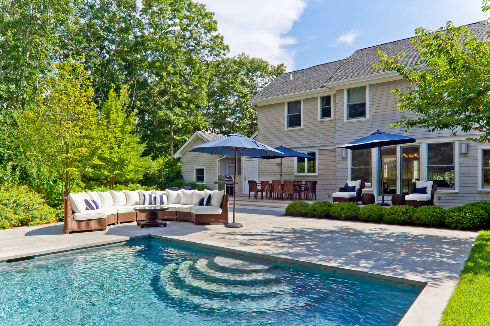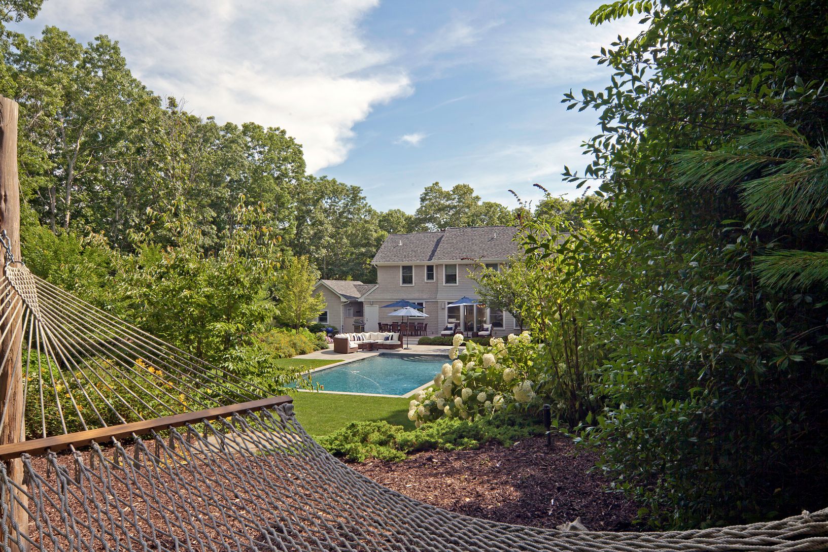 Light and bright home in absolutely pristine condition less than five minutes drive to both village and ocean beaches. .Professionally landscaped by Bayberry with specimen trees, shrubs, and privacy. This two story home is well maintained and features an open plan living room with fireplace, gourmet kitchen with marble countertops and stainless steel appliances, dining area with easy access to deck and pool. There is custom millwork throughou