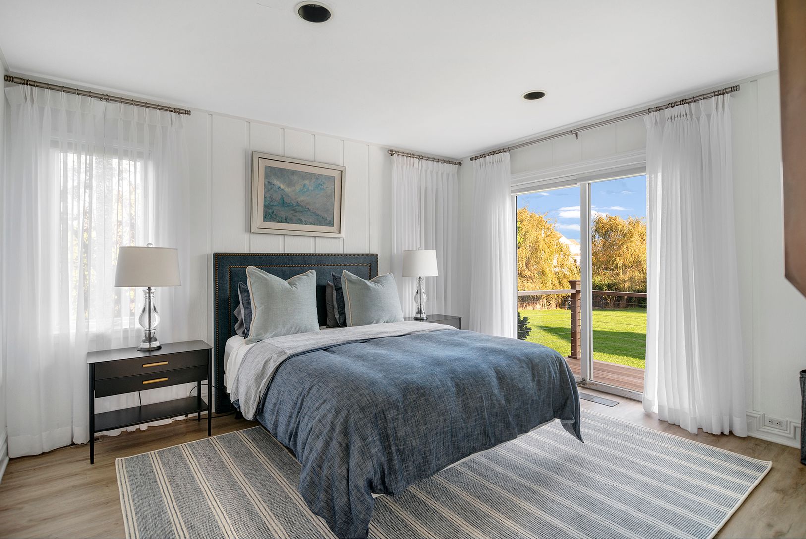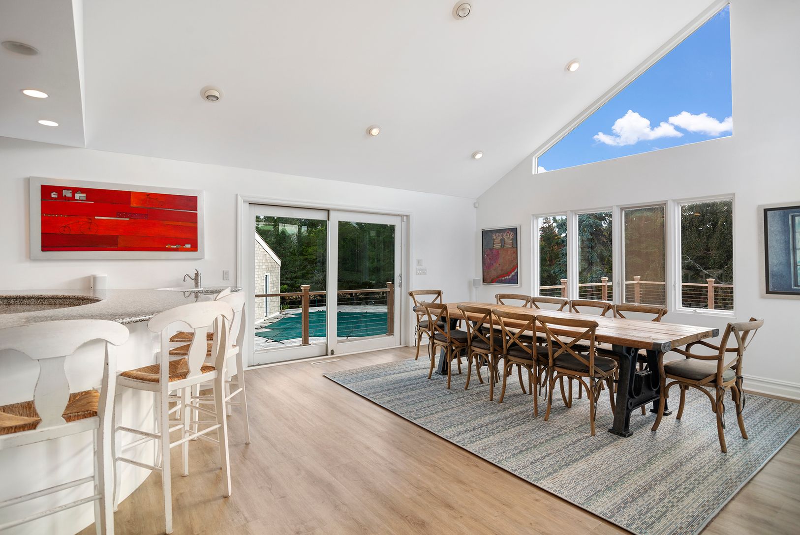 Available 6/1/25-7/7/25 for $35,000 plus utilities. Located in the highly desirable estate section of Quogue Village, this renovated Contemporary home offers four generously sized bedrooms, a heated pool, hot tub, pool house and a dock that accommodates a kayak, paddle board, and up to a 28 ft boat. An open floor plan is perfect for entertaining. The multiple glass sliders bring in light, allow access to the wrap around mahogany decking and p