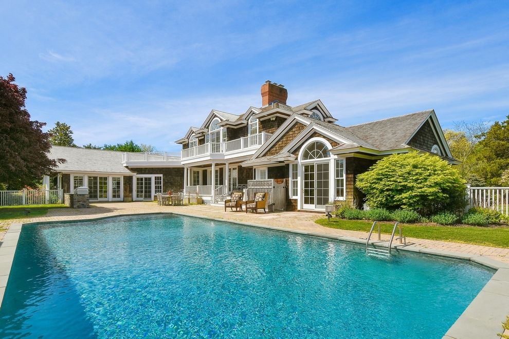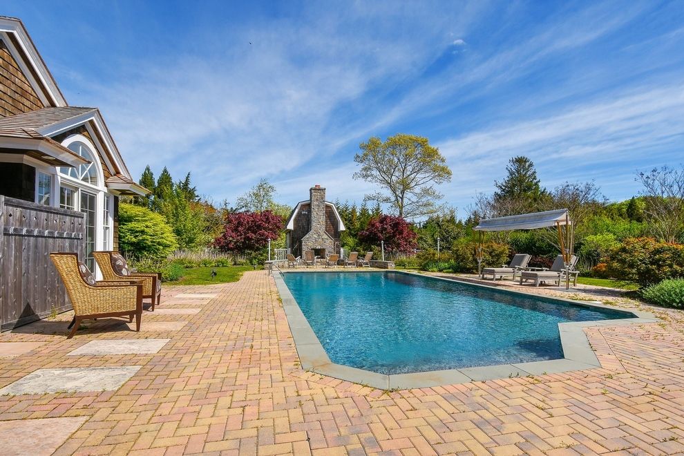 In the heart of Quogue on a quiet country lane, this post-modern 4-bedroom home includes a master suite with fireplace and marble master bath, large open-space rooms, screened porch, over-sized pool with large outdoor entertainment area. Low Quogue taxes and ocean beach.