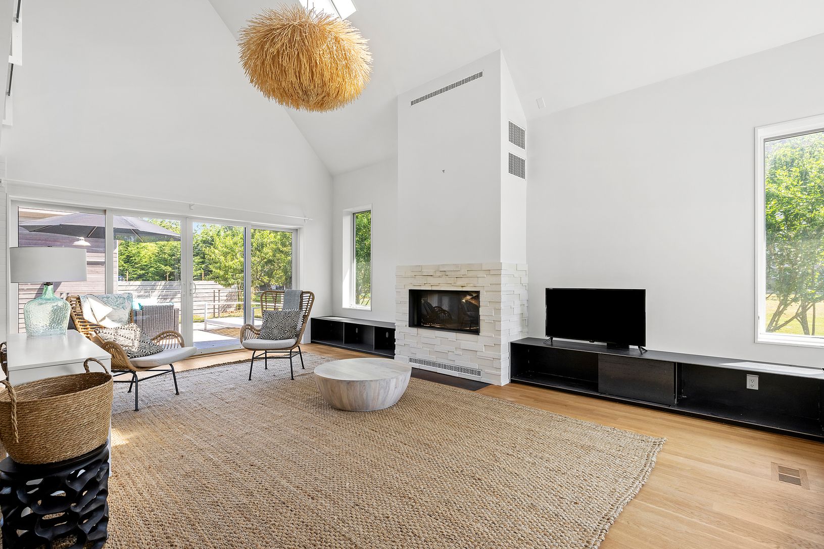 This modern beach house situated on a quiet street in Ditch Plains a few short blocks to the ocean shore, and is a great opportunity to own a turn key home in an ideal, coveted Montauk location. Well-maintained and move-in ready, the entry has a mudroom with custom built-in storage and coat closet. The gorgeous interior features an open living area with walls of glass, fireplace, and sliders to the back deck. The custom chefs kitchen has a lar