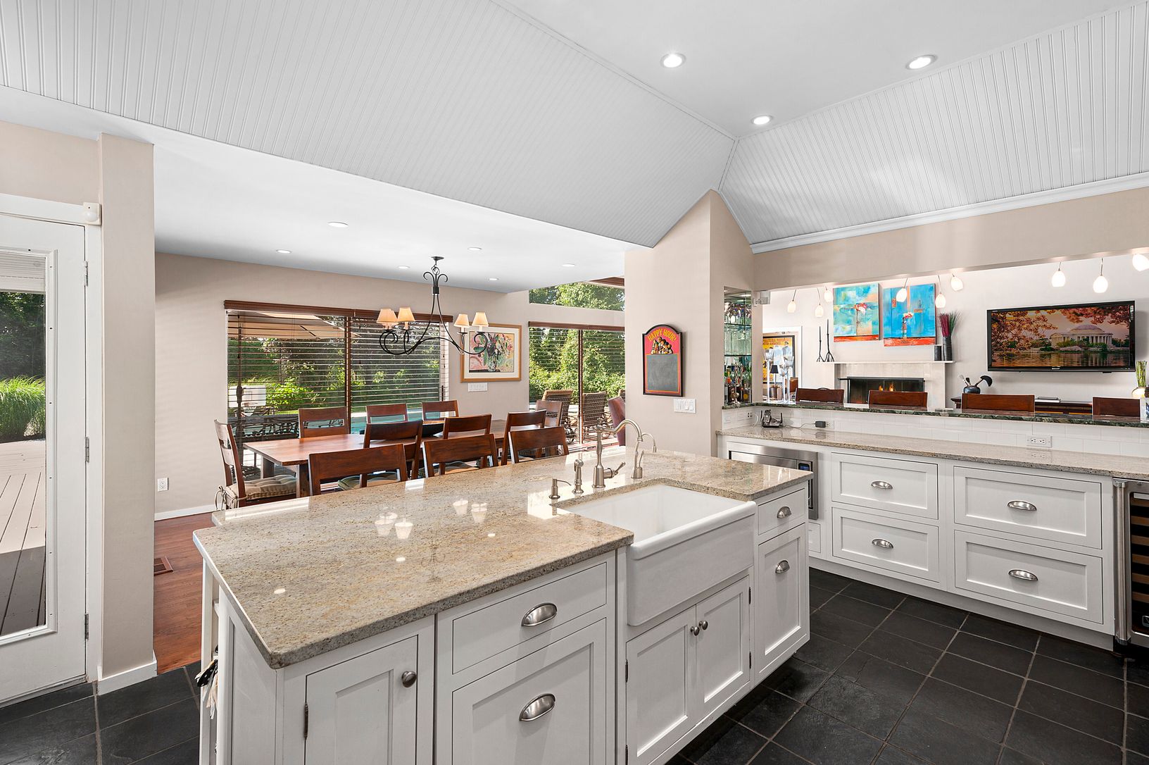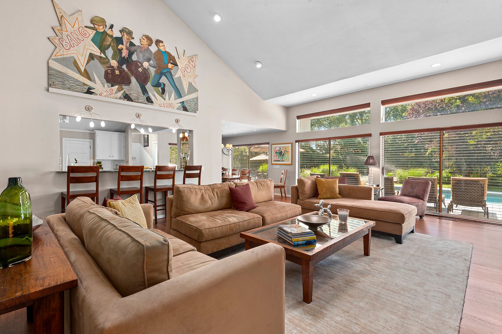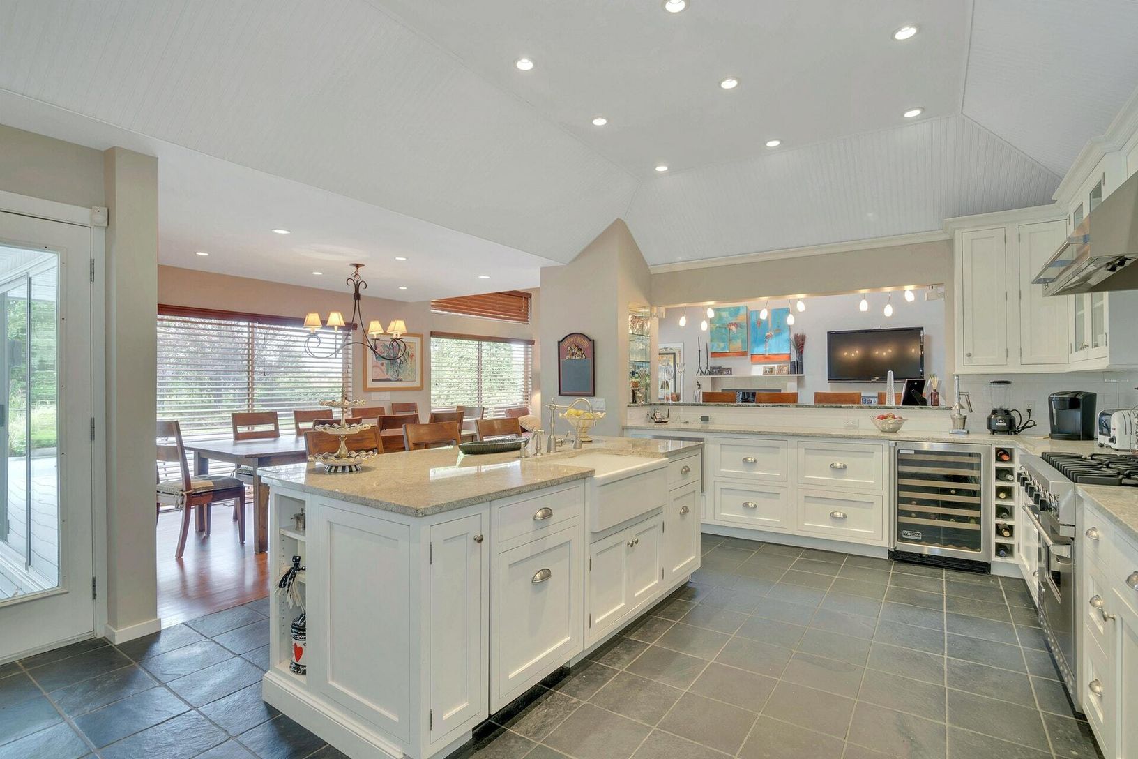 farm views and beautiful hues of sunsets this well designed contemporary home with perfectly placed transom windows and skylight offers open floor plan yet offers privacy within this well maintained home. Living room w wood burning fireplace, office/den ,chefs kitchen, with sous chef sink, island seating, adjacent dining area w