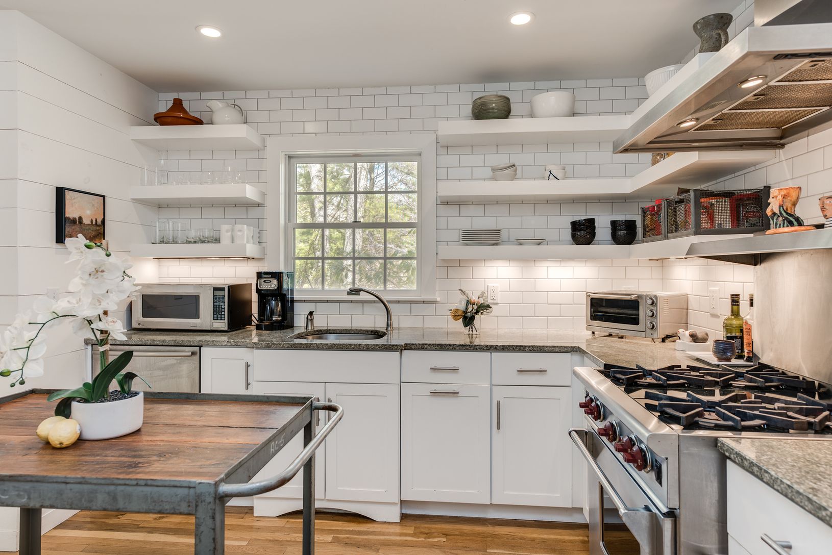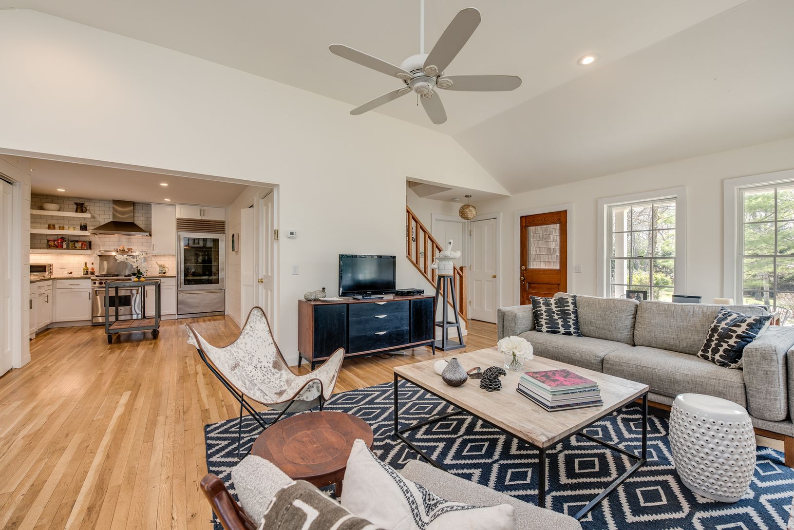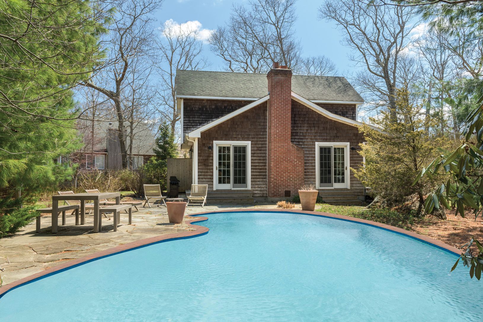 On a private road in a small community of homes that has its own seating area overlooking Three Mile Harbor as well as stairs offering easy water access, this beautiful two-story, three bedroom, three bath traditional home with light-filled white interiors and hardwood flooring throughout has been beautifully maintained. The spacious living room is part of the open floor plan and features a wood-burning fireplace and multiple French doors lead