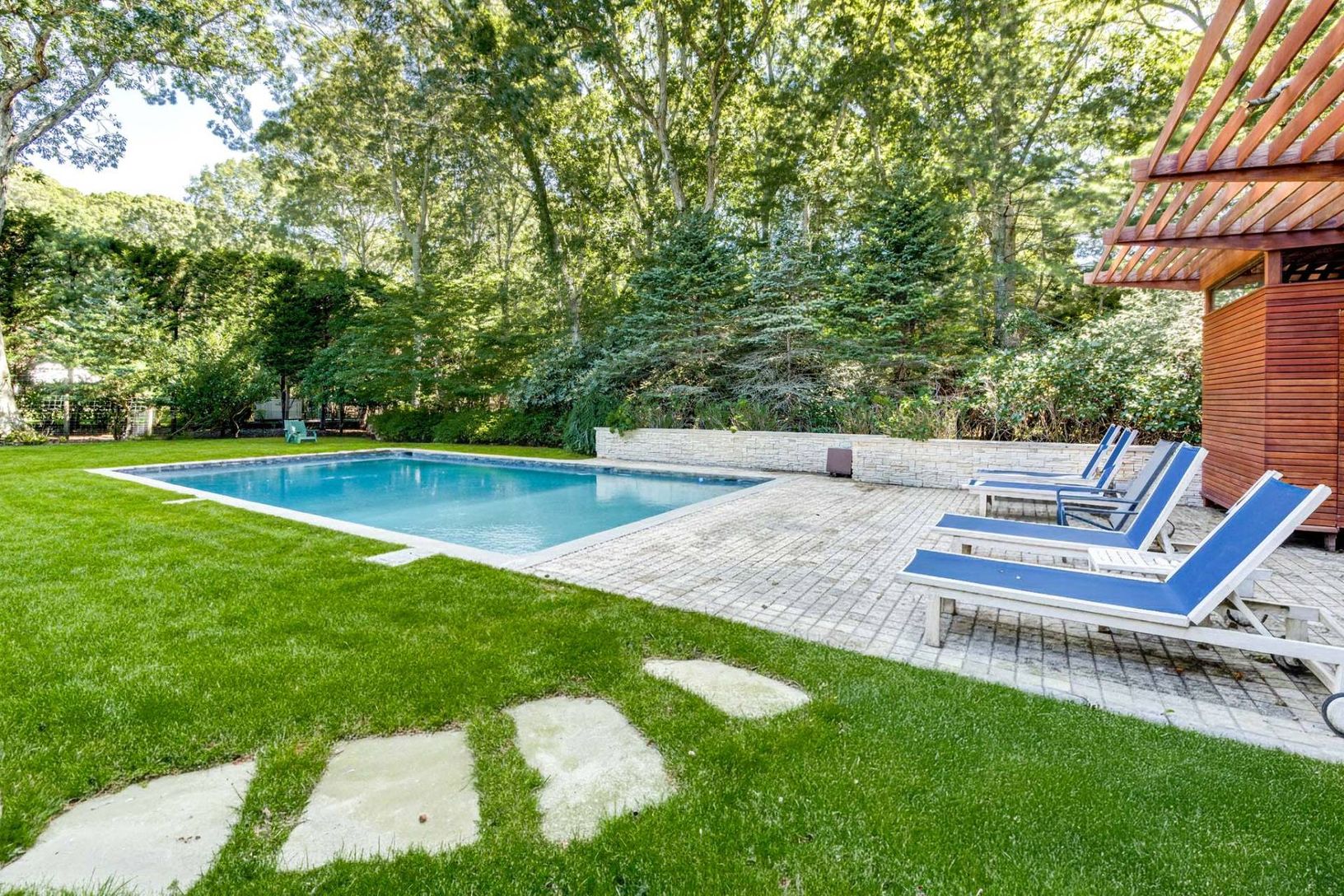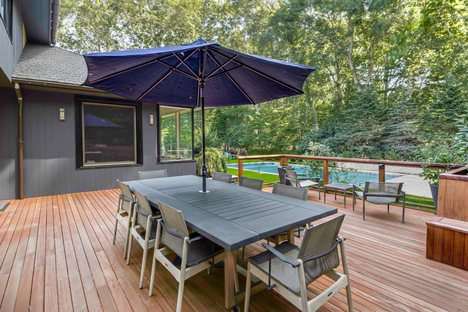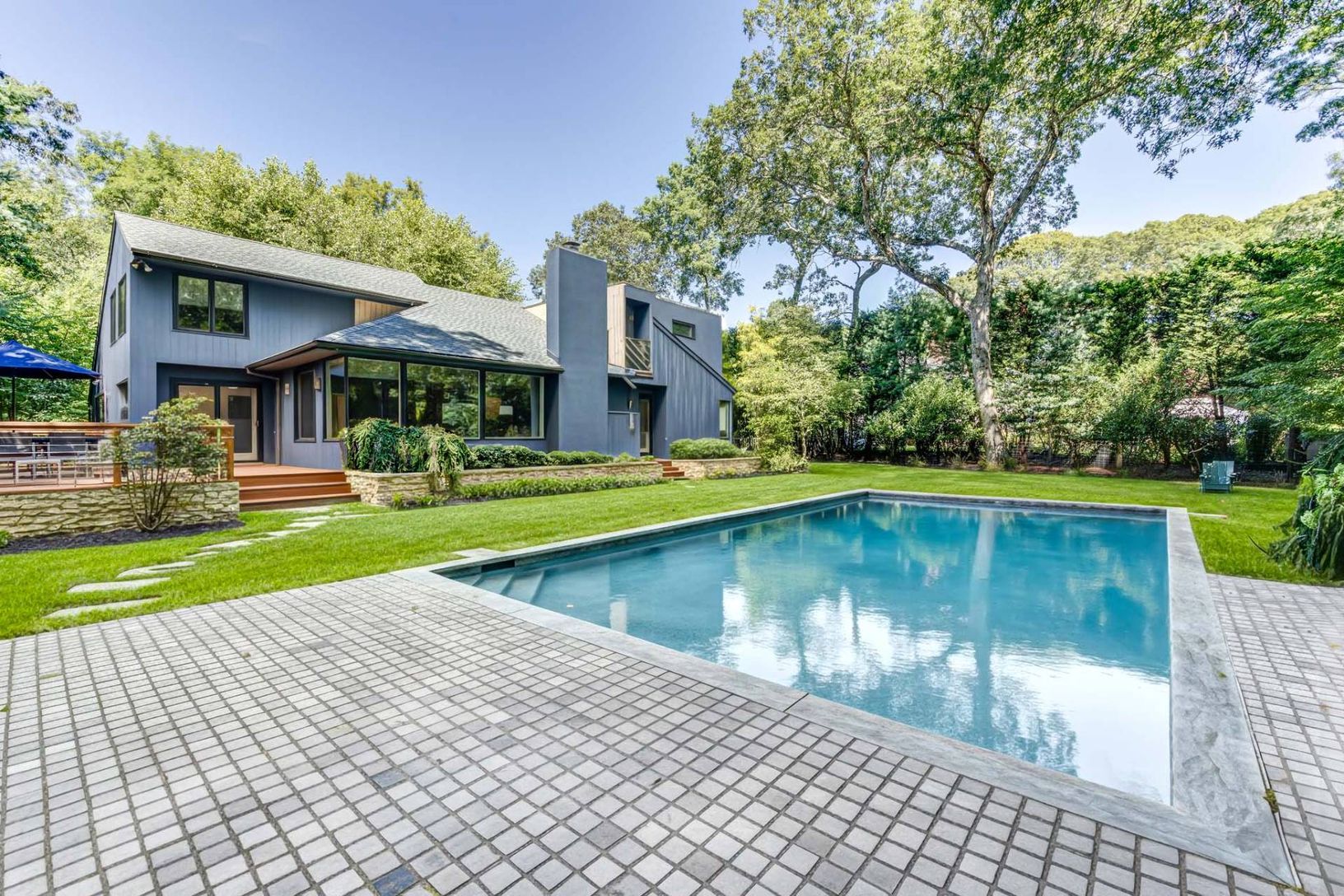 Convenient to all, this striking Modern home located in the Hansom Hills section of East Hampton's Village Fringe, has been beautifully renovated and stylishly furnished. Features include five bedrooms, five bathrooms, an open floor plan with living room, dining room, chef's kitchen, den and finished lower level with playroom/media room. Walls of glass offer views of the beautifully landscaped grounds, mahogany deck, heated pool and outdoor ki
