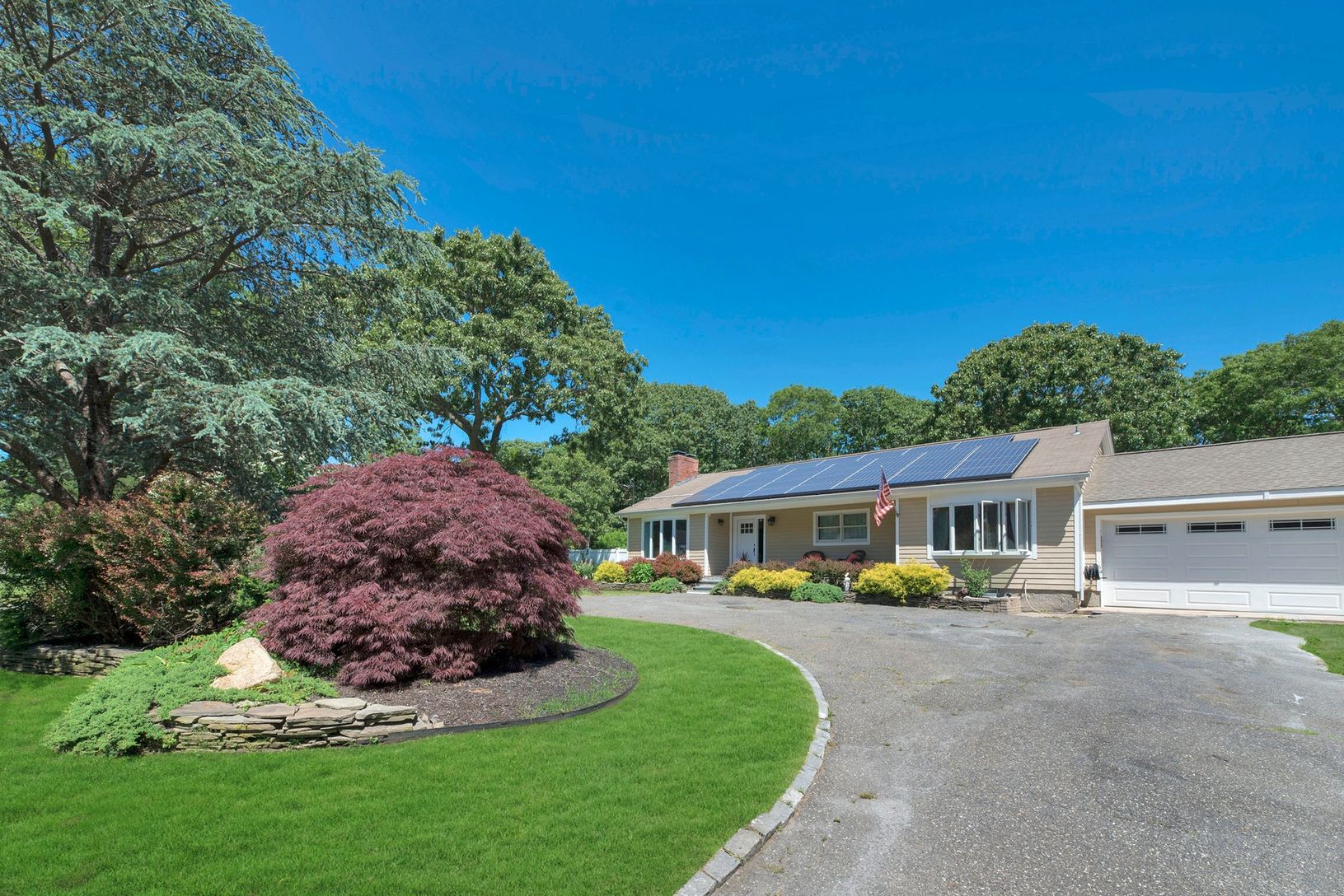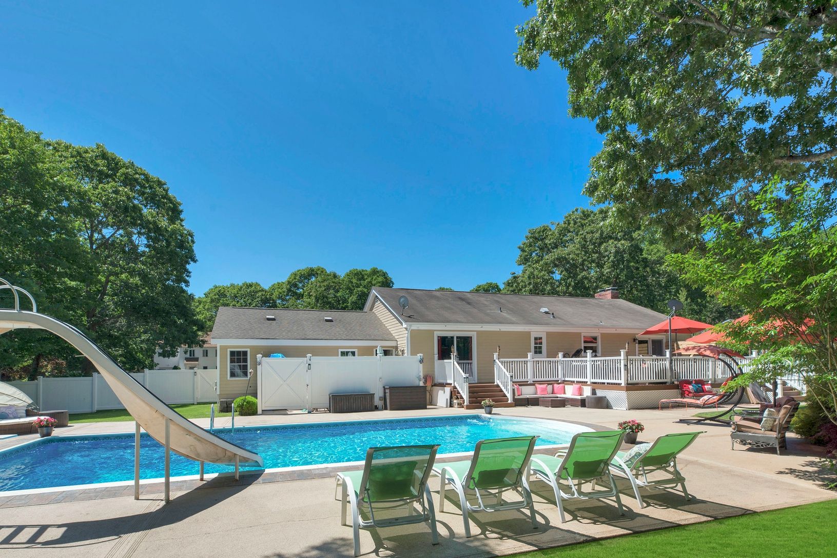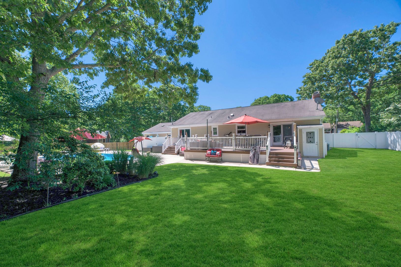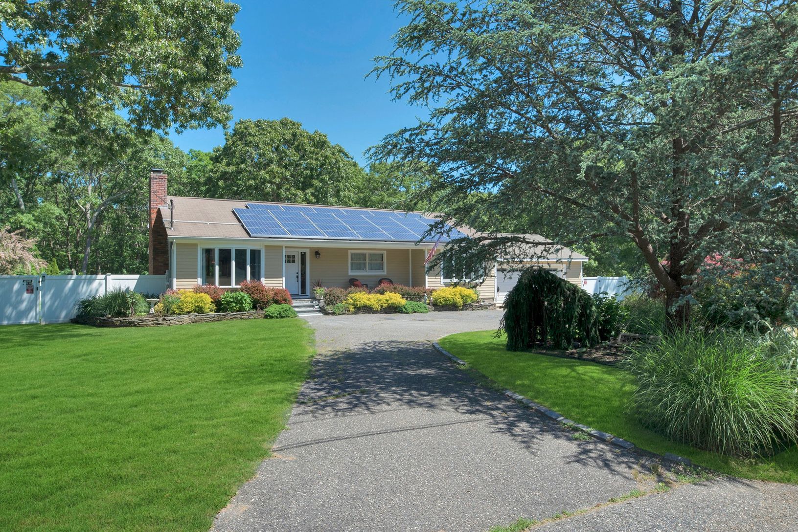 Swim suits needed! Lovely spacious custom ranch with inviting salt water pool and lush surrounding gardens. Backs up to preserved wooded land. Privacy unlimited. Open floor plan living room with fireplace, formal dining and eat in kitchen, master bedroom suite plus two guest bedrooms and bath. Finished lower level for great entertaining with walk out entrance. Fully owned solar panels. All this and the property is located on a cul de sac