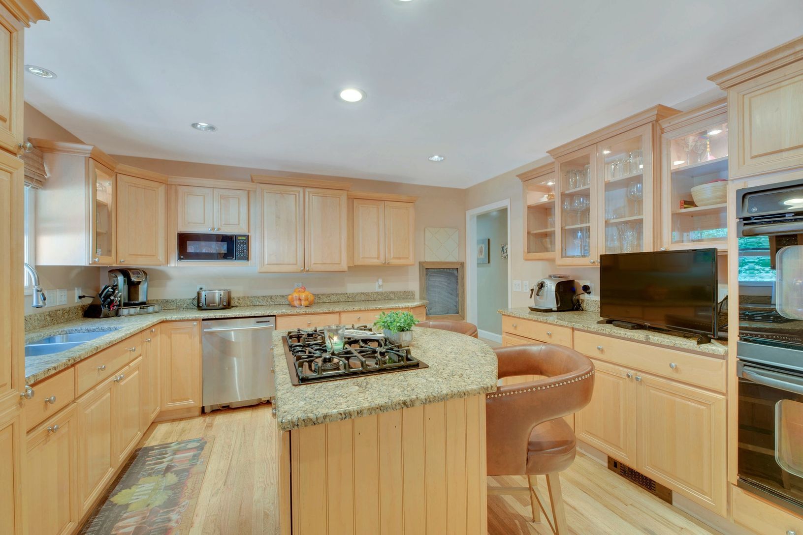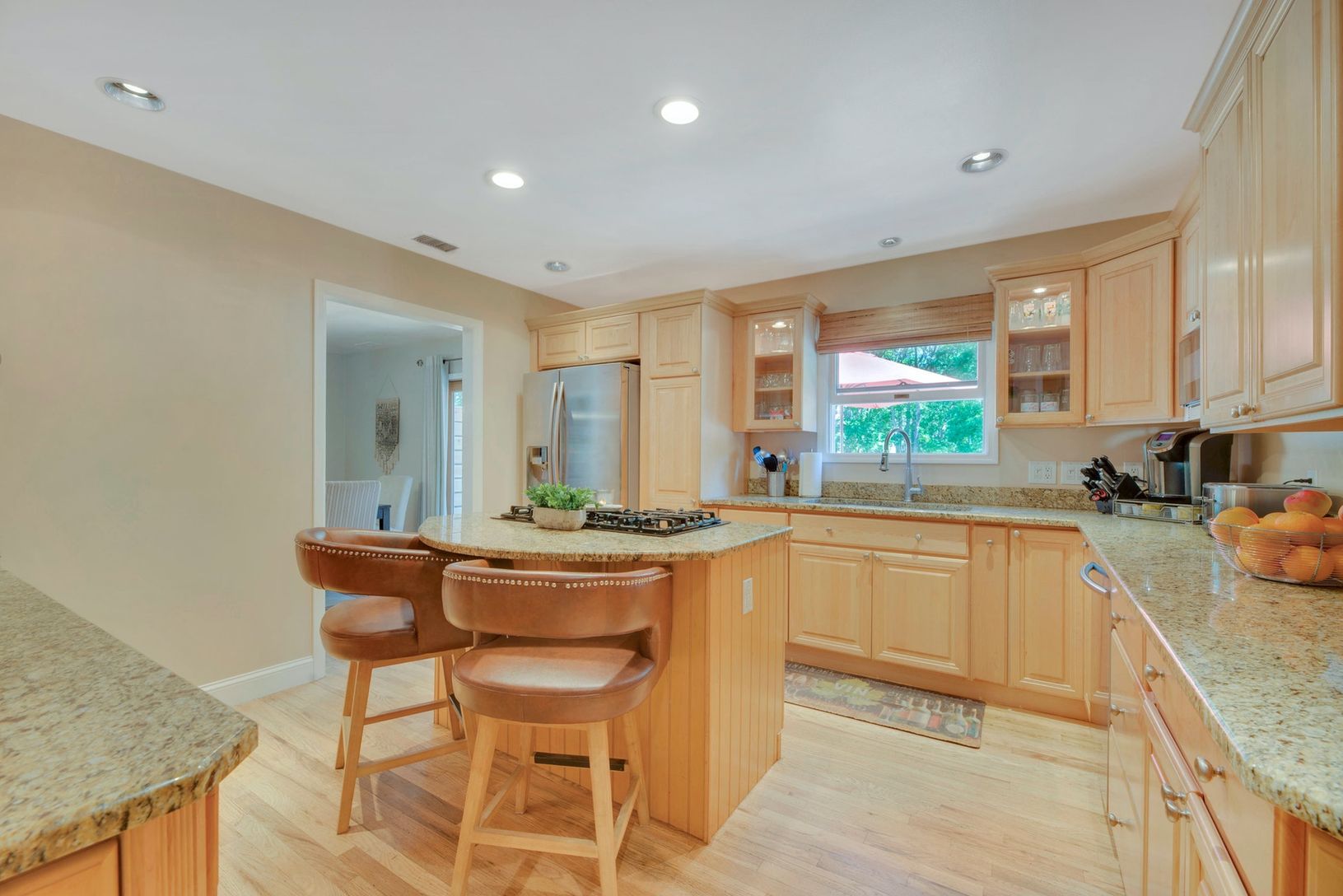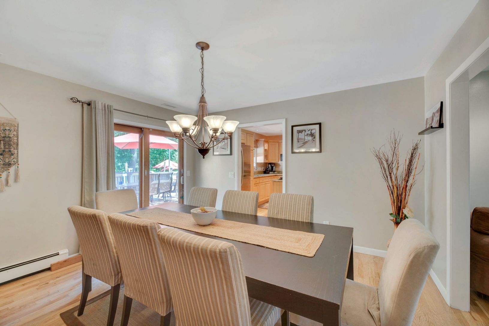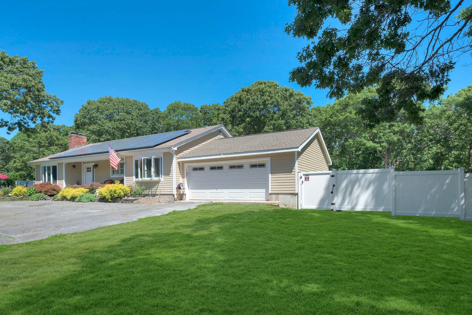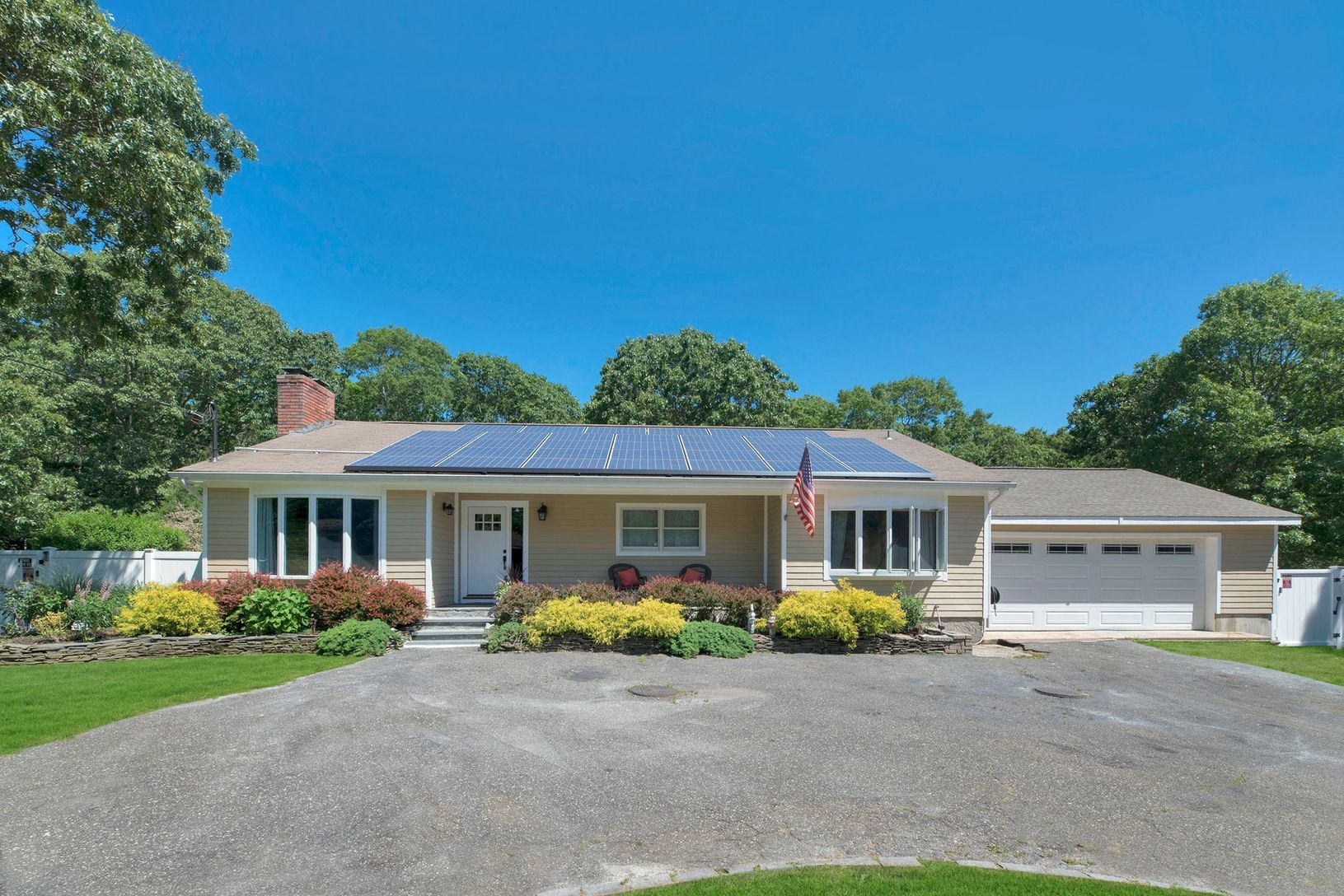 Swim suits needed! Lovely spacious custom ranch with inviting salt water pool and lush surrounding gardens. Backs up to preserved wooded land. Privacy unlimited. Open floor plan living room with fireplace, formal dining and eat in kitchen, master bedroom suite plus two guest bedrooms and bath. Finished lower level for great entertaining with walk out entrance. Fully owned solar panels. All this and the property is located on a cul de sac