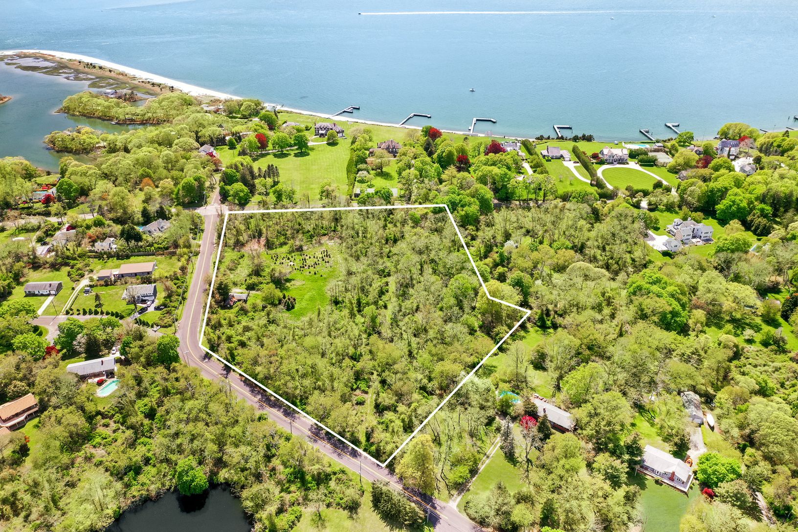 Part of "Cherry Tree Farm," this acreage, which totals 7.67 +/- acres, is at the corner of West Neck Road and Nostrand Parkway. Offering sound views toward the west and gently rolling with light vegetation, this property has seen horses grazing, tomatoes growing and once had a turn-of-the-century Dutch barn. Zoned for two-acre lots, the next owner can explore the possibility of sub-division, if desired. Depicted in photographs taken in the lat