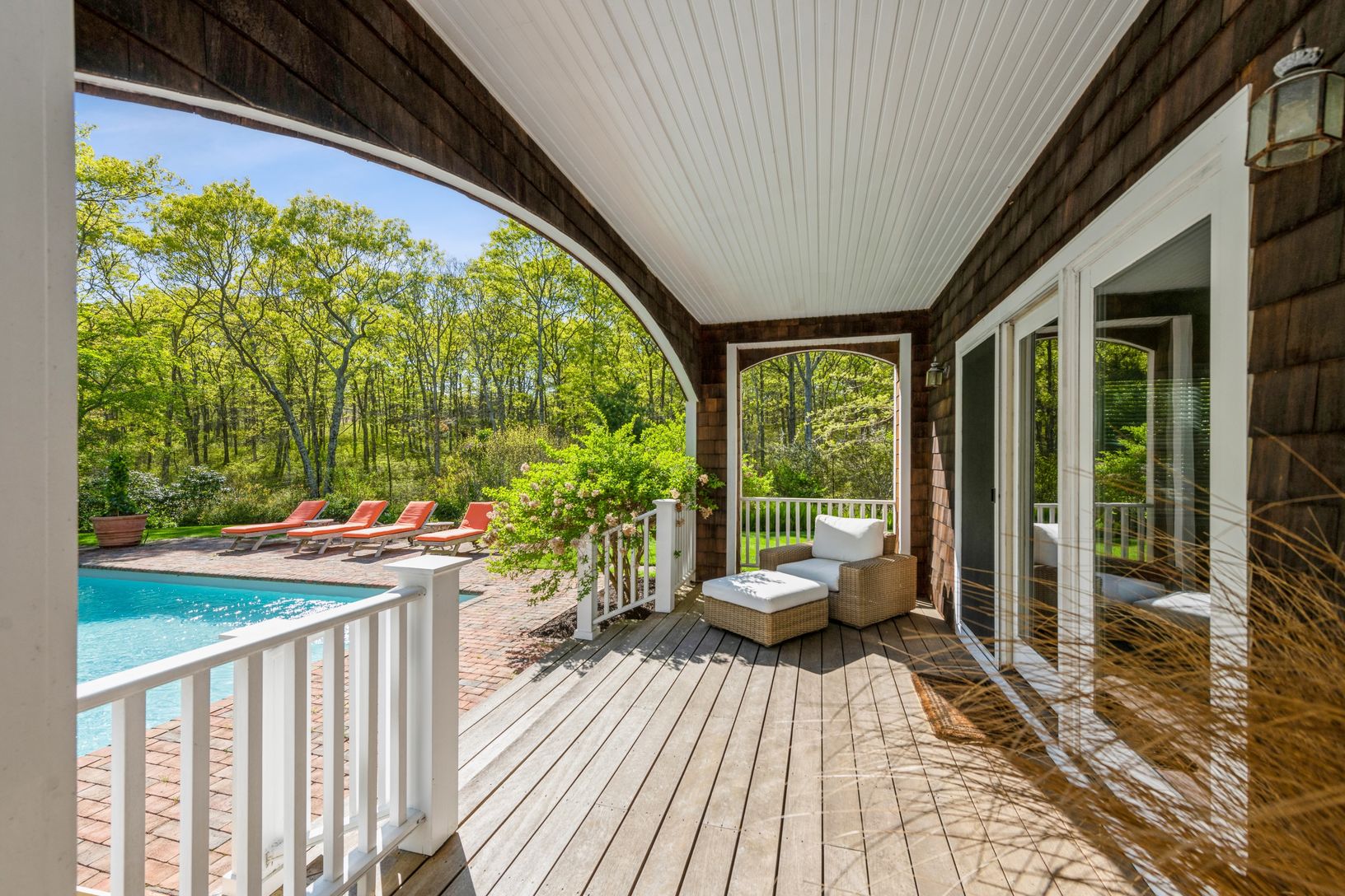 This chic light-filled home features 4 bedrooms and 3.5 baths and is ideally located between East Hampton and Sag Harbor Villages. Enter through fenced perimeter and gated driveway to a manicured 2.25 acres of greenery for ultimate privacy. The stunning grounds offer a large, heated saltwater pool, bocce court, with two porches and multiple covered seating areas and detached two car garage. Perfect for entertaining and al-fresco dining.