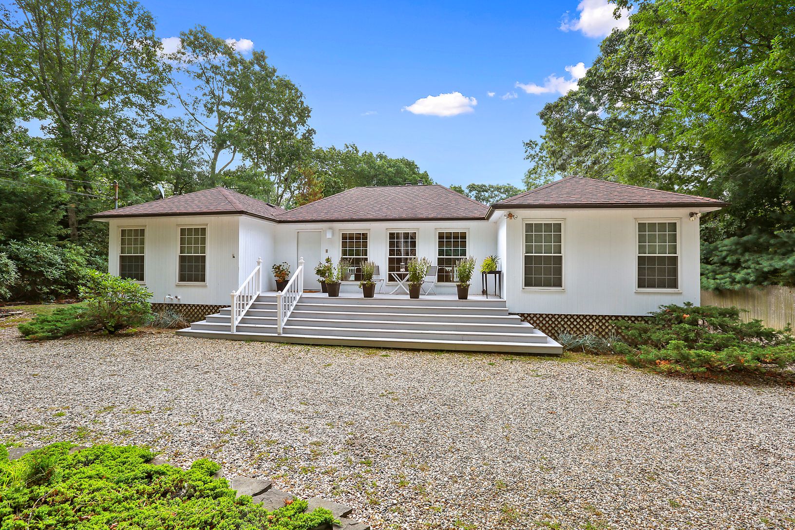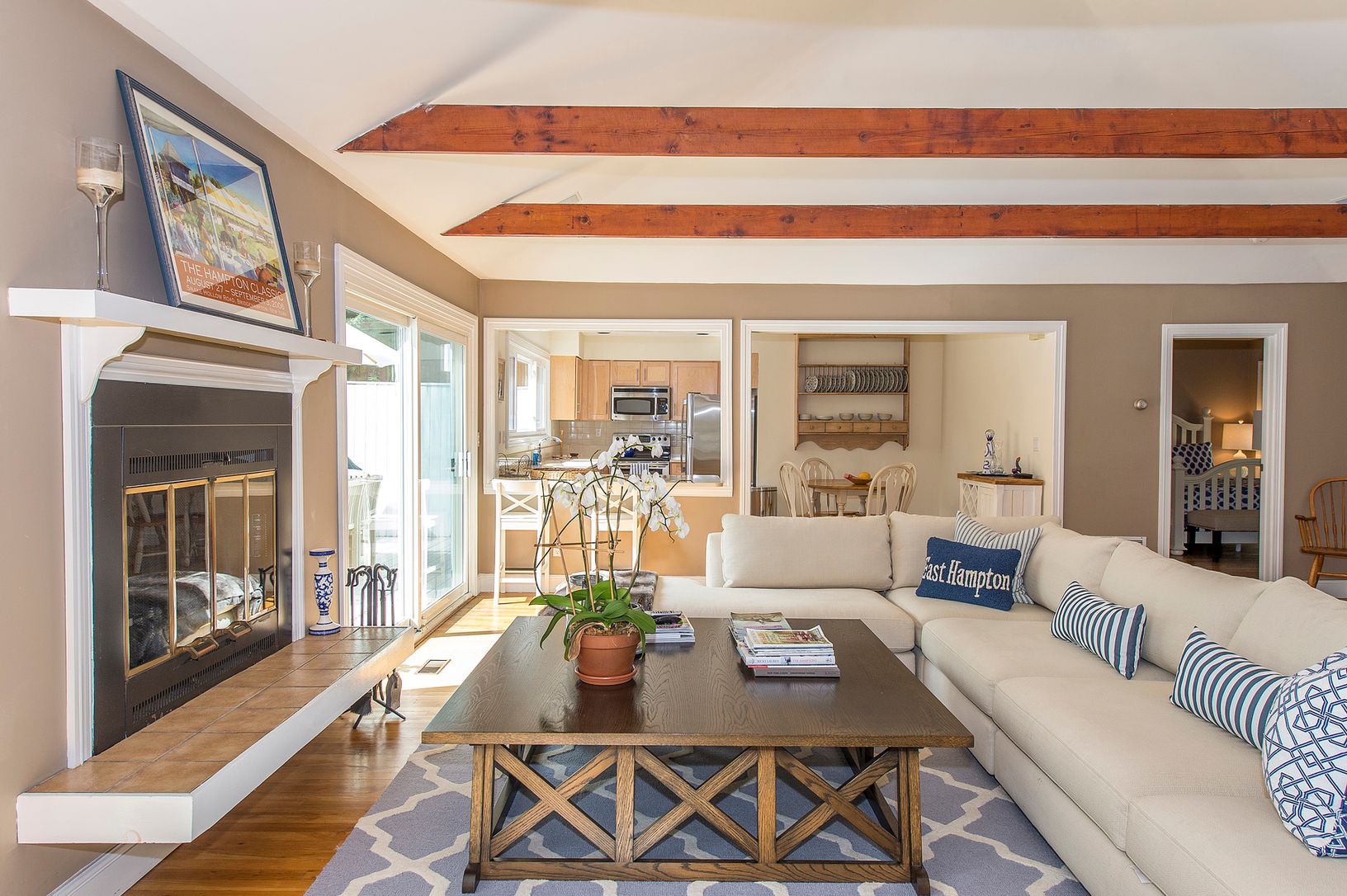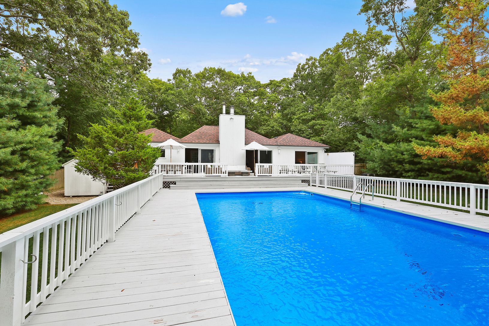 A perfect beachy, summer retreat awaits! This lovely three bedroom, two bath spot is primely located close to all in East Hampton in a quaint waterfront neighborhood. A large open living space greets you as you enter through the door with a great room with fireplace and vaulted ceilings and an open eat-in-kitchen with breakfast bar. Through the glass sliders, you'll find plenty of decking that surrounds the heated pool and perfectly flowing in
