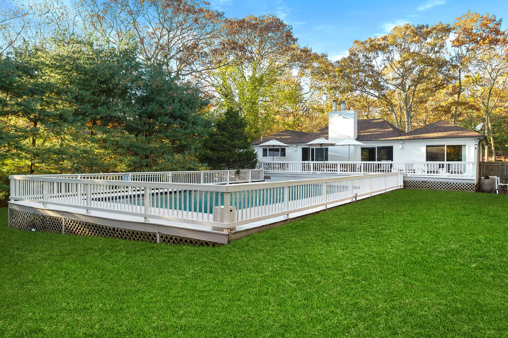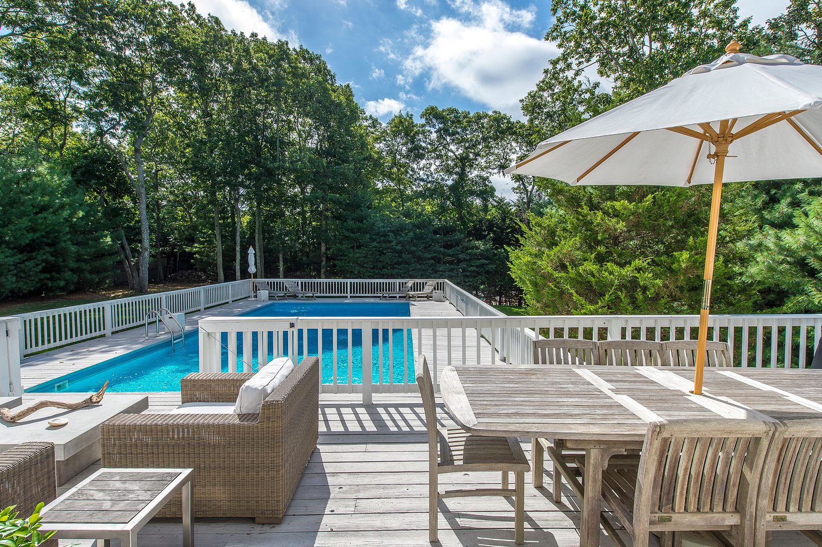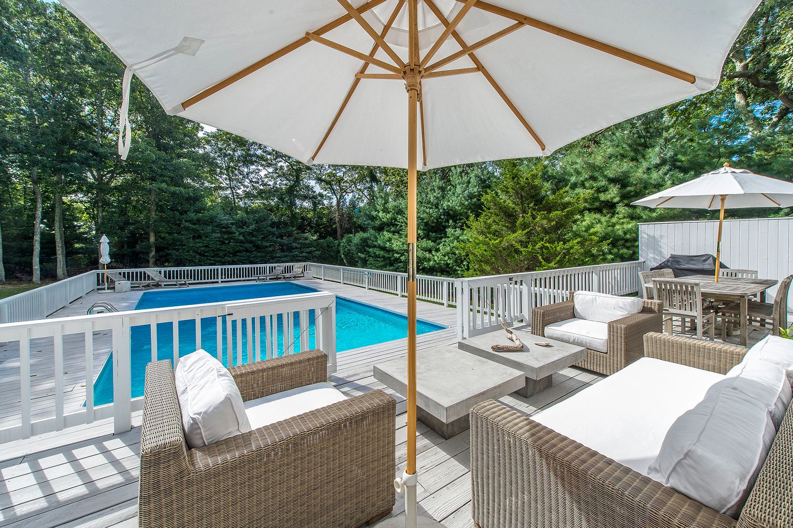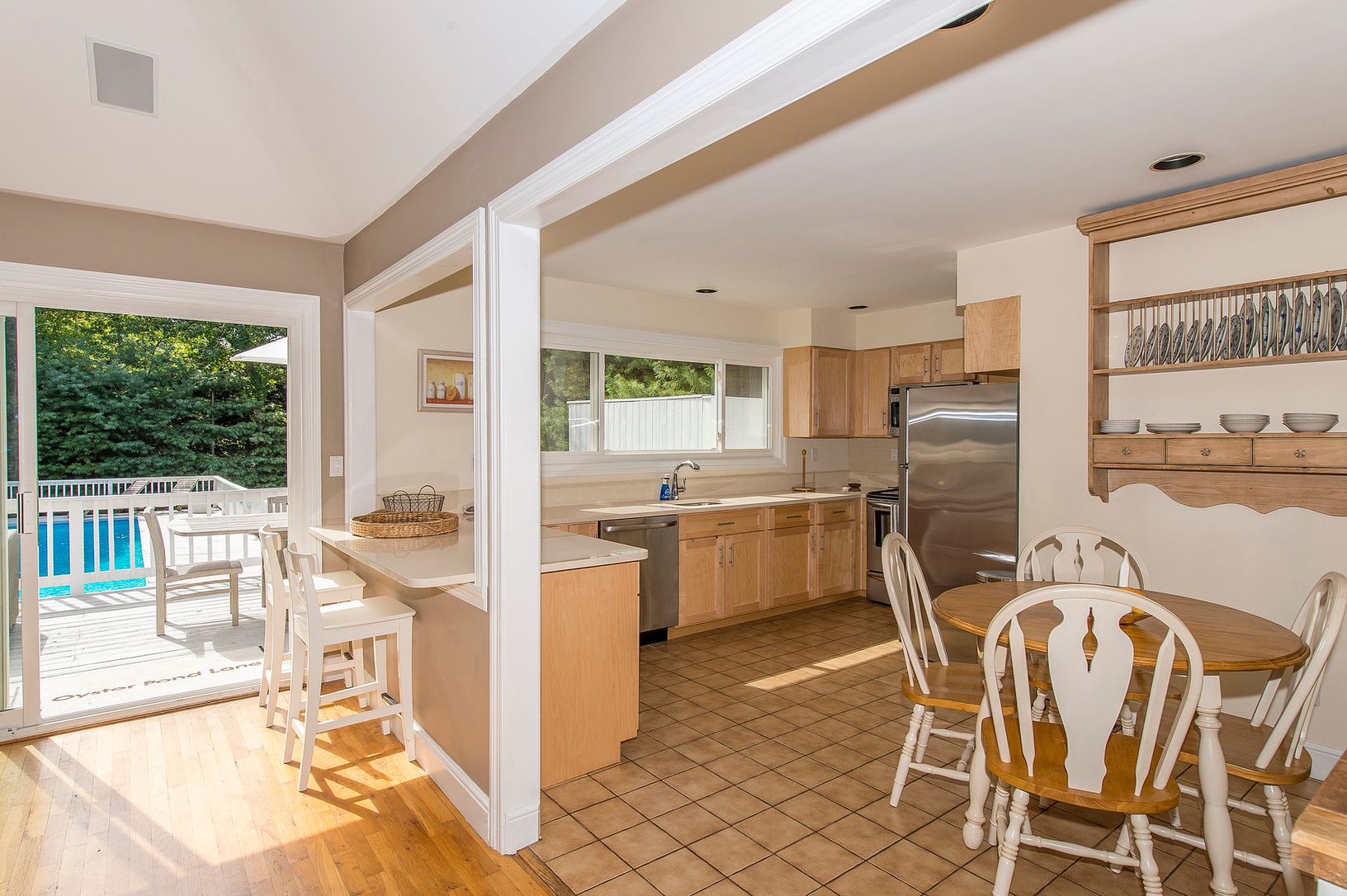 A perfect beachy, summer retreat awaits! This lovely three bedroom, two bath spot is primely located close to all in East Hampton in a quaint waterfront neighborhood. A large open living space greets you as you enter through the door with a great room with fireplace and vaulted ceilings and an open eat-in-kitchen with breakfast bar. Through the glass sliders, you'll find plenty of decking that surrounds the heated pool and perfectly flowing in