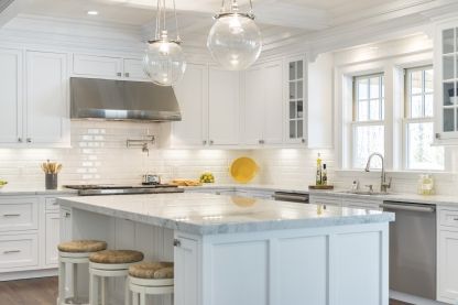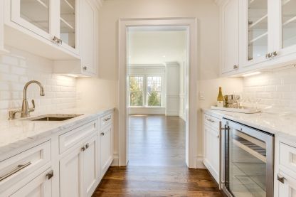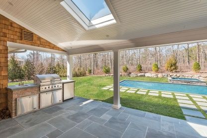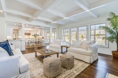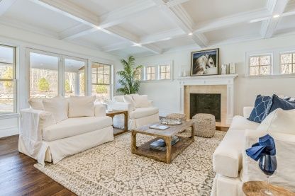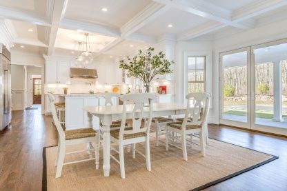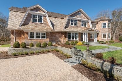 Experience tranquil seclusion in this brand new two-story shingled traditional home on a quiet, private just-shy acre near Southampton Village, adjacent to a reserve. Enter from a covered bluestone porch into a soaring double-height entry foyer opening to light-filled open-plan living areas with coffered ceilings and exquisitely detailed millwork. An easy flow among the living room, formal dining area featuring a secret entrance to the wine ro