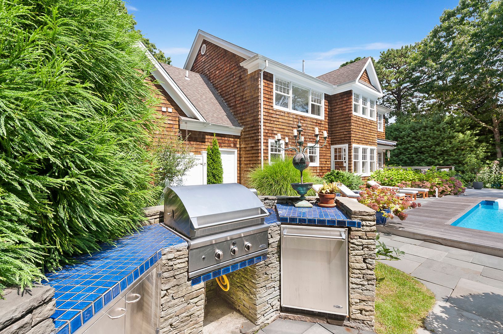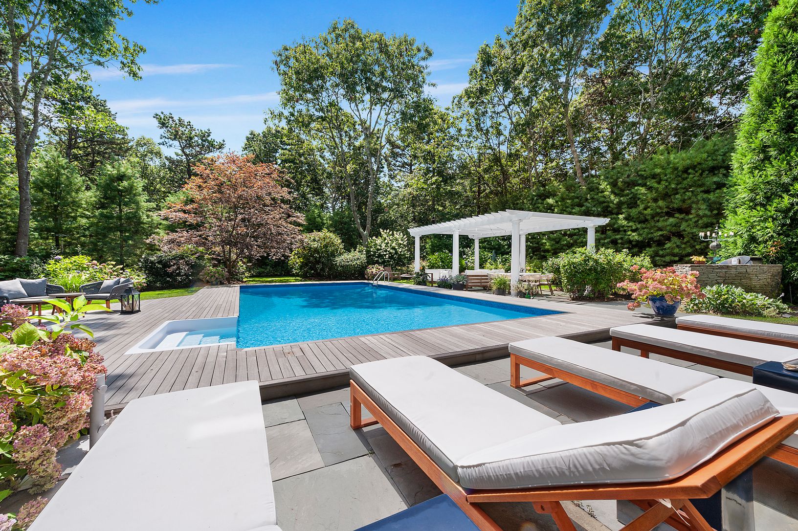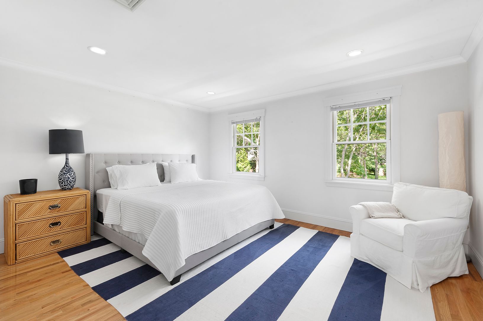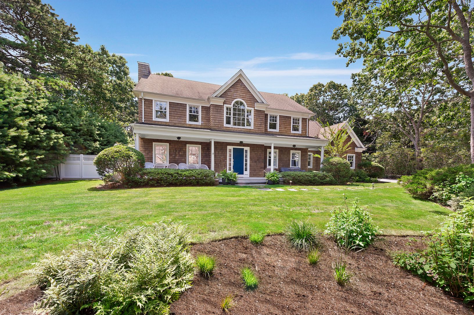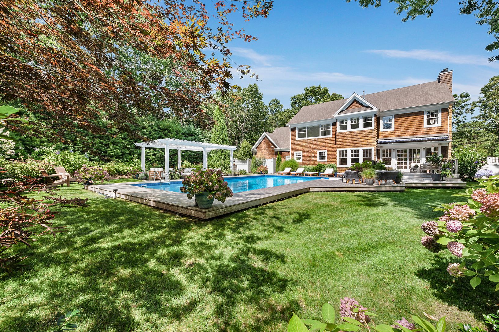 On a quiet cul-de-sac street in peaceful Wainscott, less than 2 miles to famed “Beach Lane” sits this private, shingled traditional with five bedrooms and four and a half baths. Enter from a classic front porch to a double height foyer where light floods the open interior living space. A living room with stone fireplace flows to a breakfast area and eat-in kitchen with granite countertops and stainless steel appliances. There is grand first fl