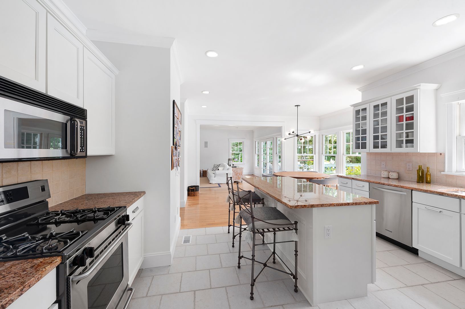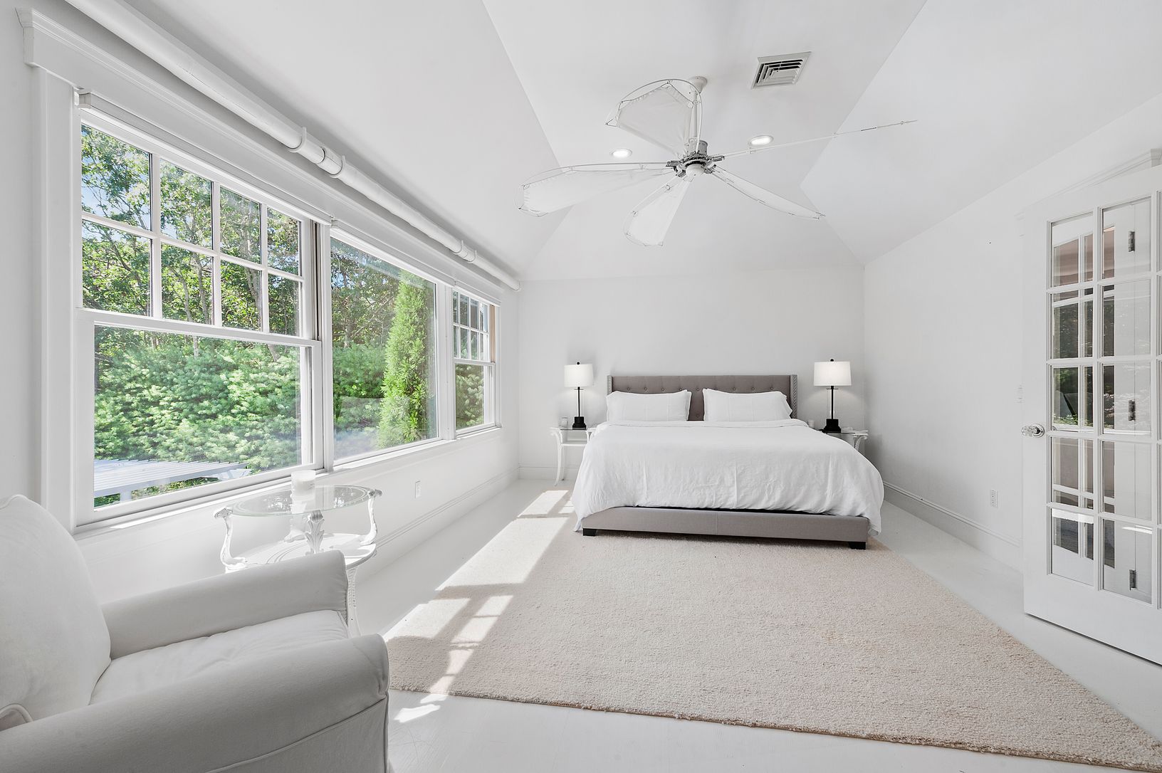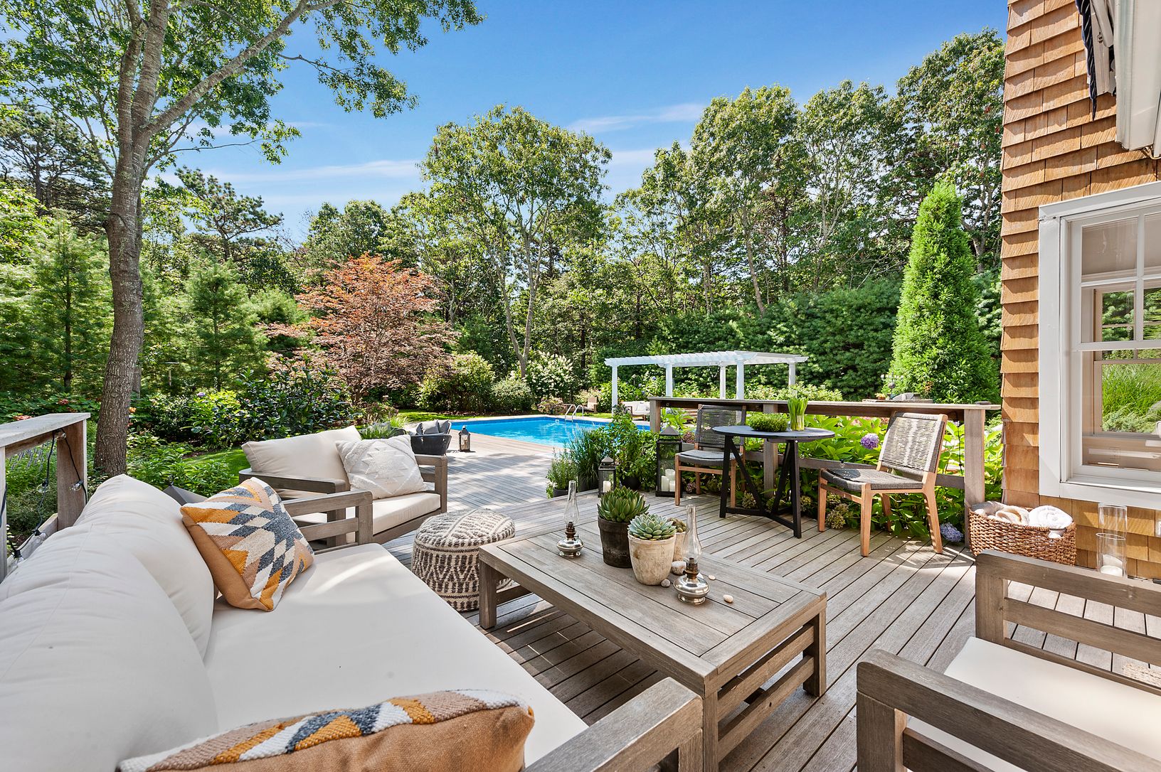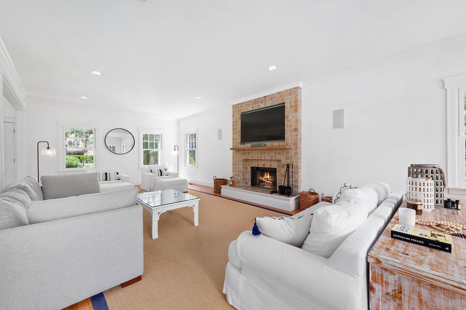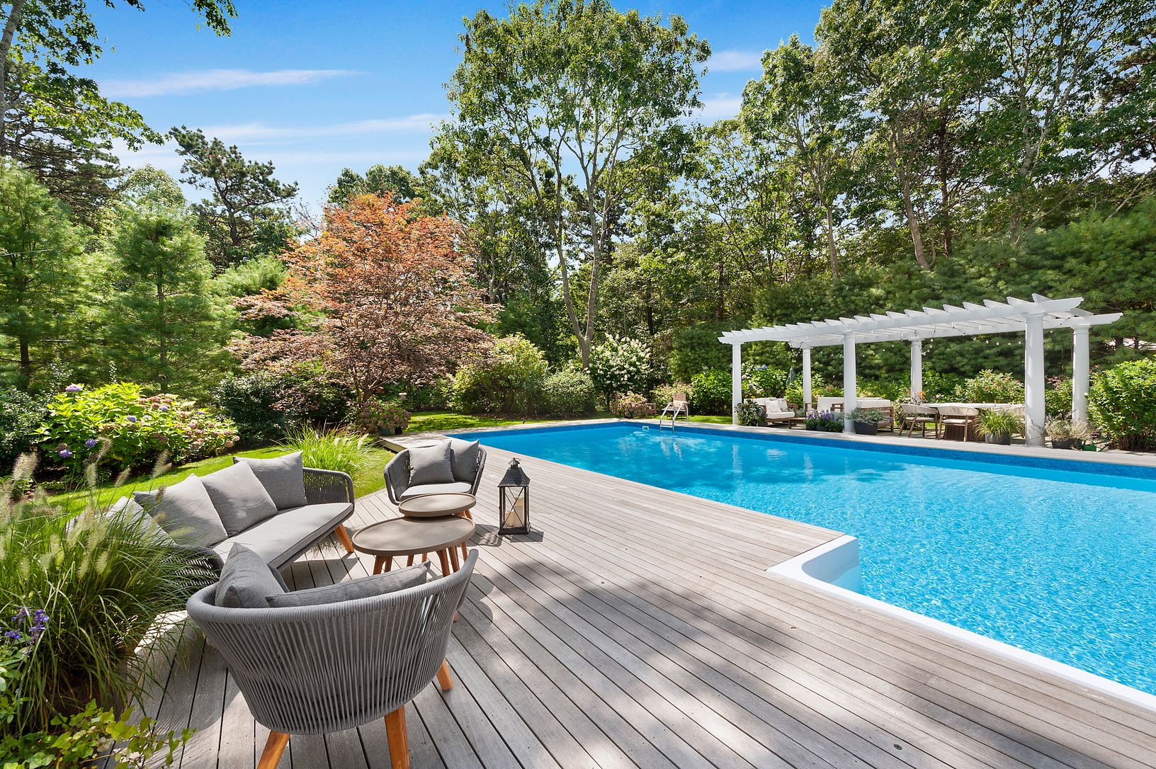 On a quiet cul-de-sac street in peaceful Wainscott, less than 2 miles to famed “Beach Lane” sits this private, shingled traditional with five bedrooms and four and a half baths. Enter from a classic front porch to a double height foyer where light floods the open interior living space. A living room with stone fireplace flows to a breakfast area and eat-in kitchen with granite countertops and stainless steel appliances. There is grand first fl