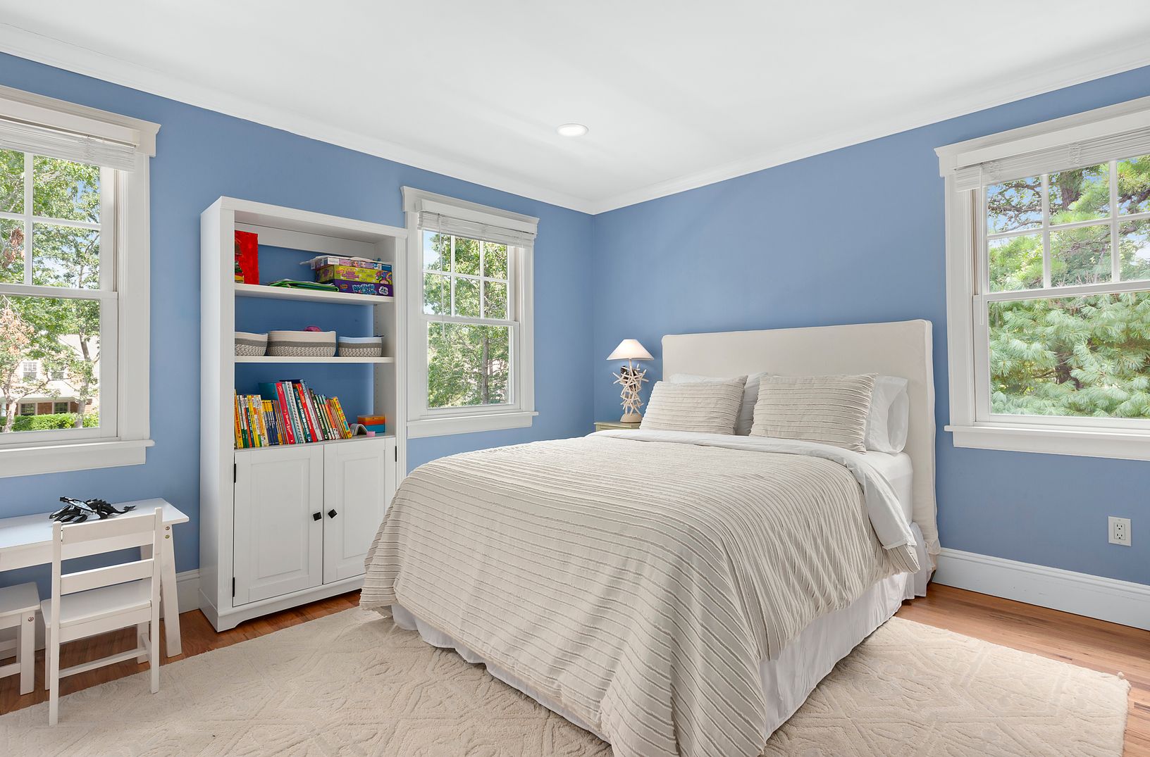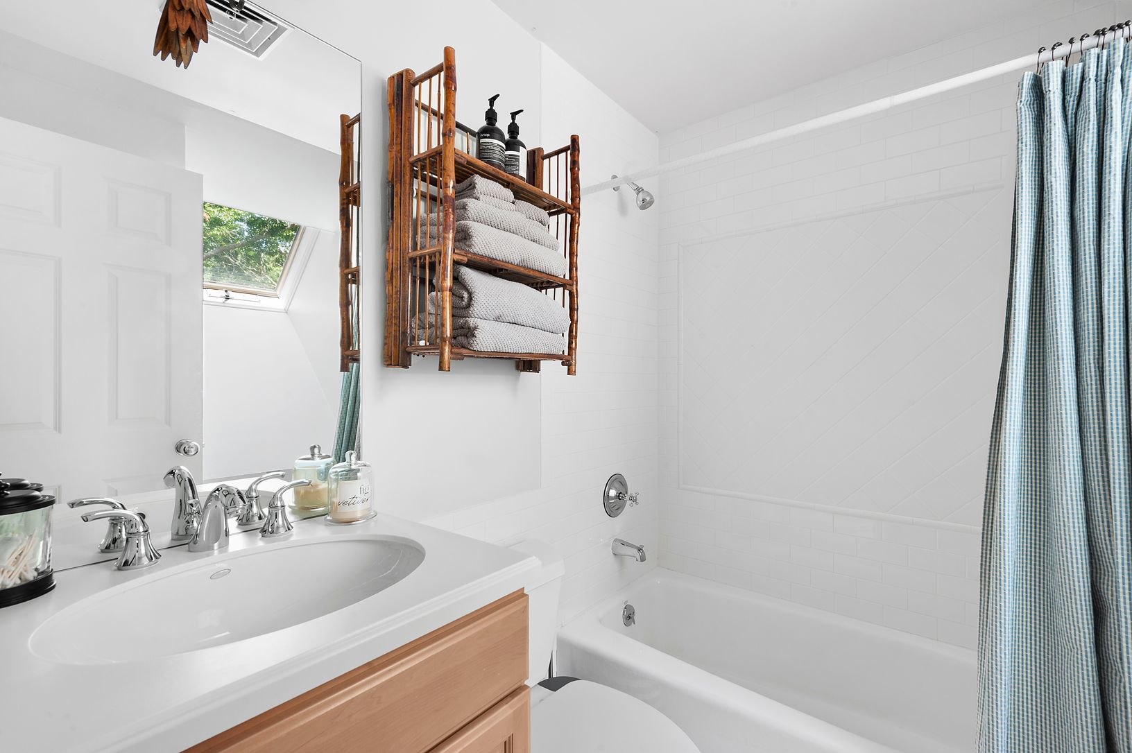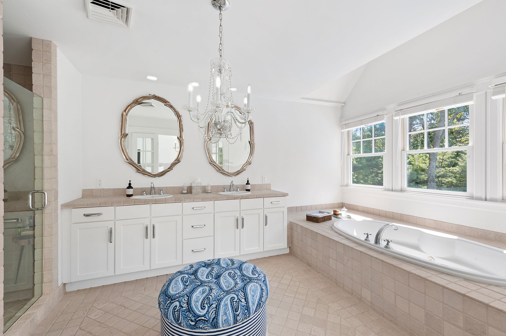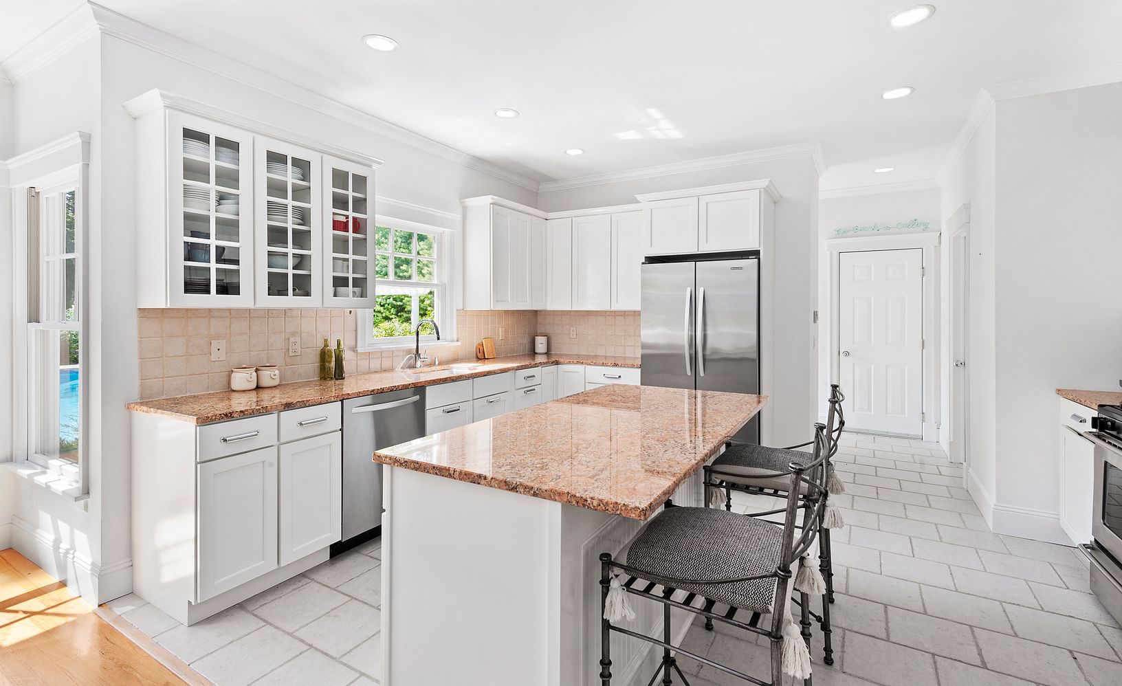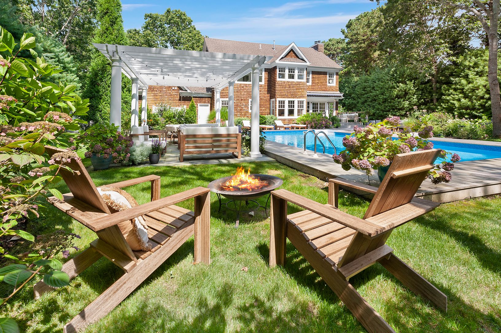 On a quiet cul-de-sac street in peaceful Wainscott, less than 2 miles to famed “Beach Lane” sits this private, shingled traditional with five bedrooms and four and a half baths. Enter from a classic front porch to a double height foyer where light floods the open interior living space. A living room with stone fireplace flows to a breakfast area and eat-in kitchen with granite countertops and stainless steel appliances. There is grand first fl