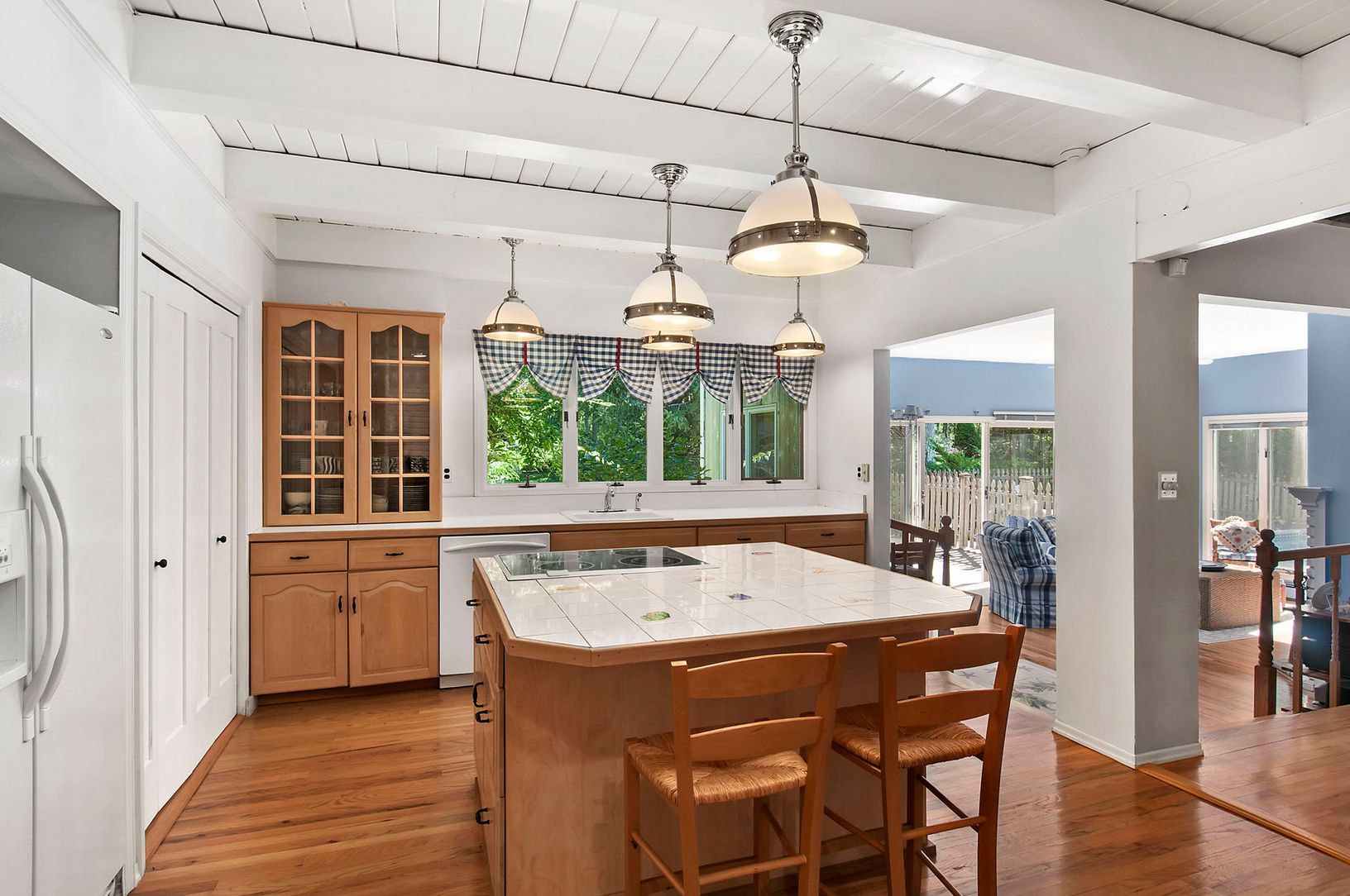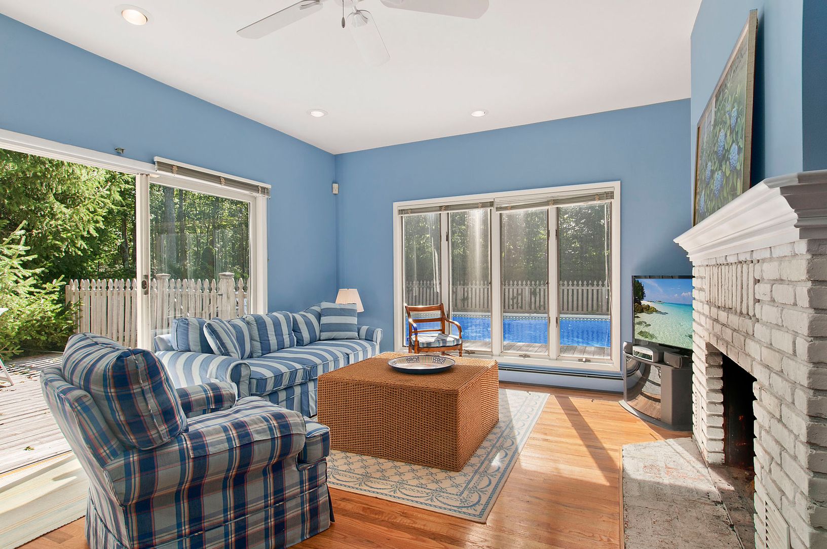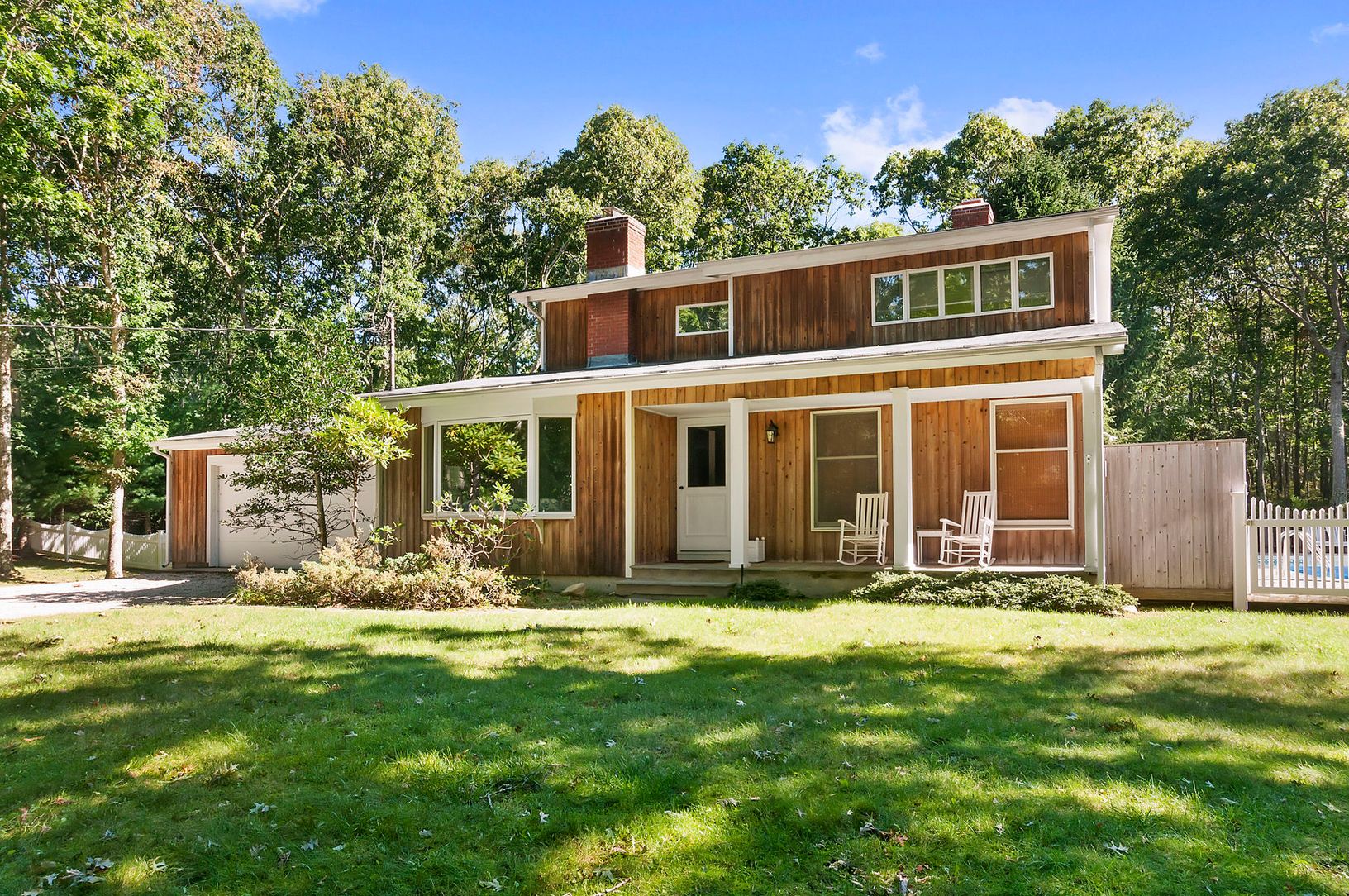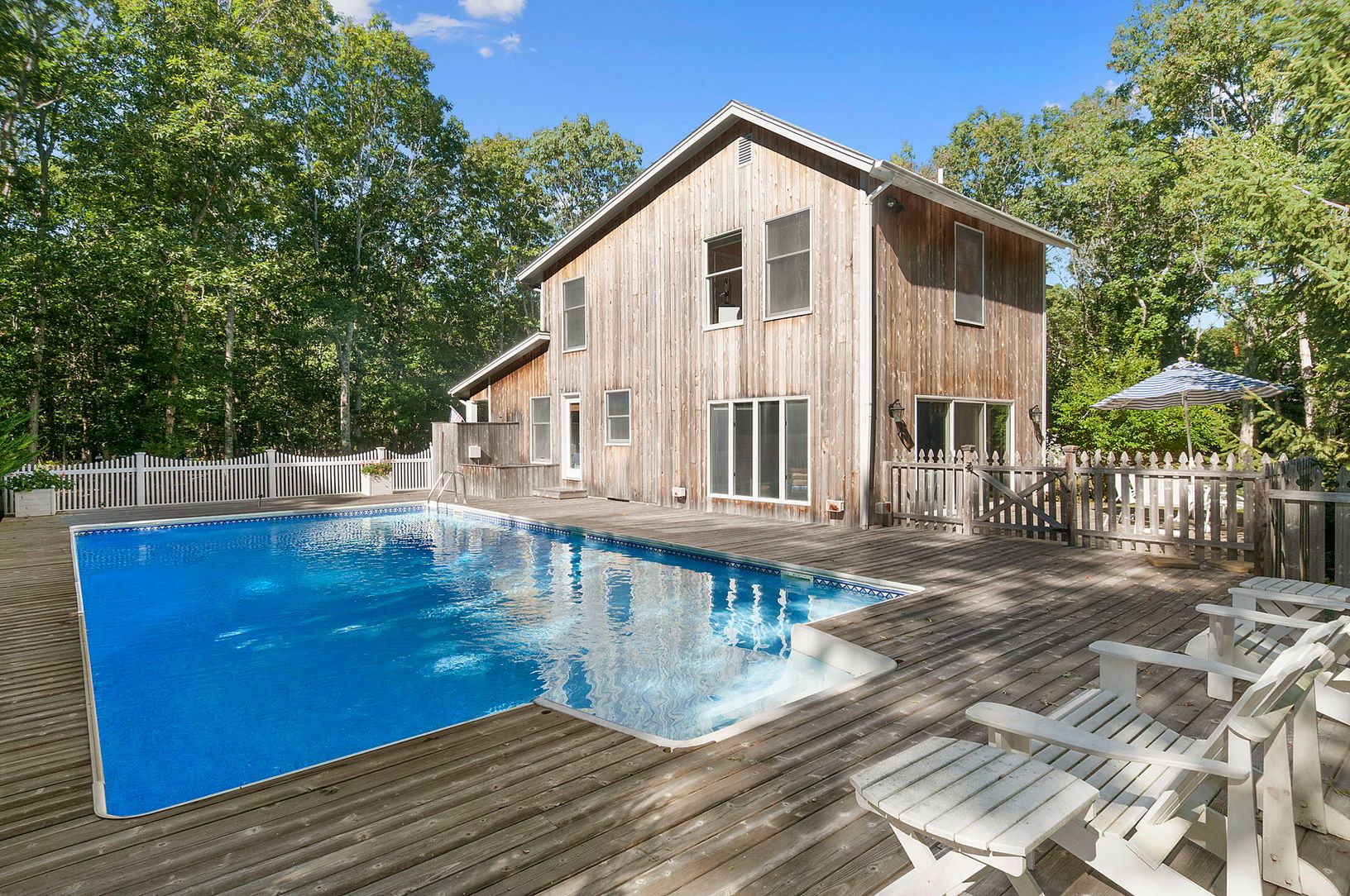 Privately sited on one acre, this 4 bedroom 3 bath home with a two car garage is ready for your personal touches. The open floor plan provides a flow between the kitchen, dining room and sunken family room with fireplace. All this leads to extensive grounds, and decking around the heated saltwater pool and outdoor shower. The cozy living room has a stone fireplace. The main floor bath is easily accessed by the pool and first floor bedroom. Up