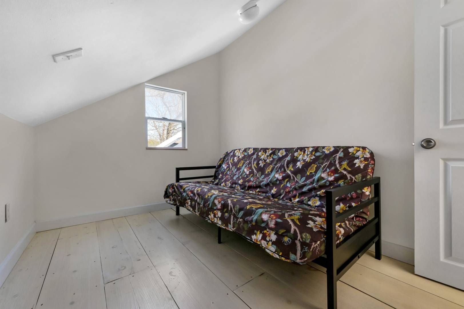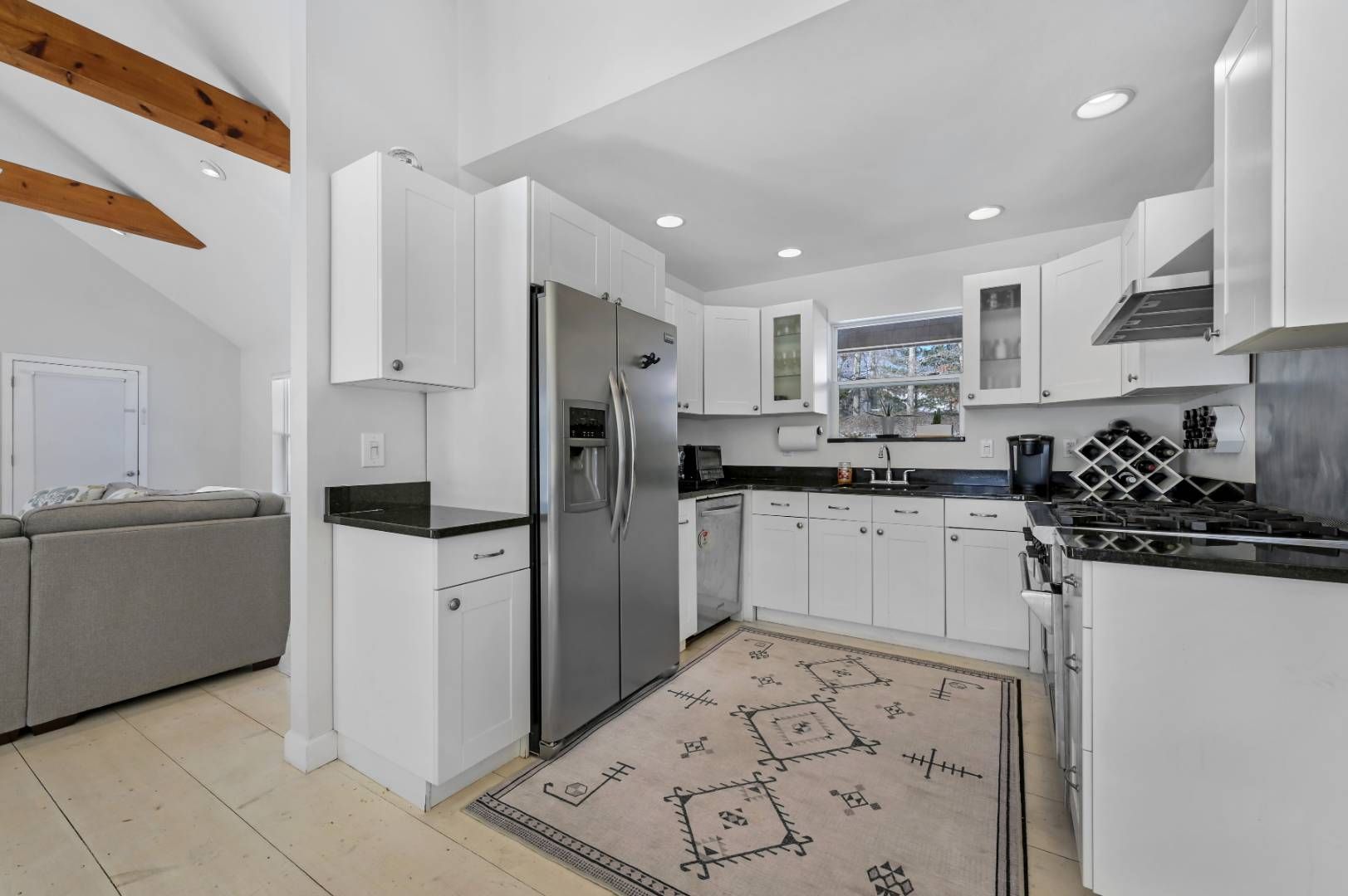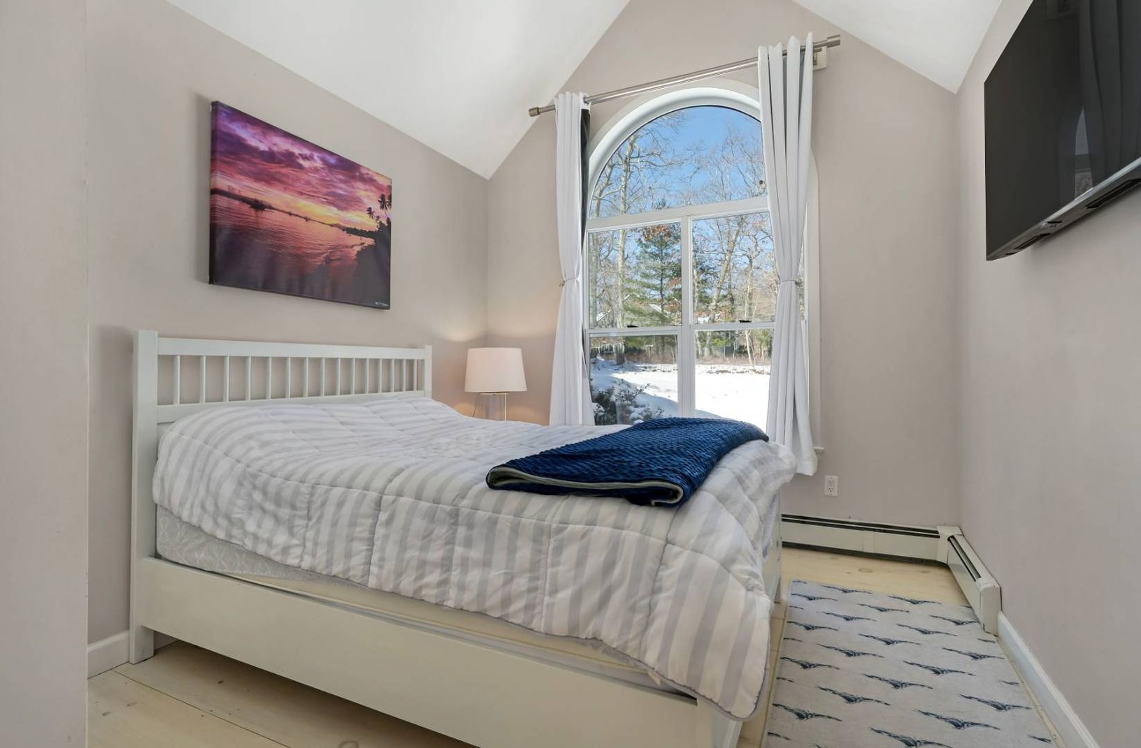 This postmodern features open living space, exposed beams, and gorgeous wide plank bleached pine floors. Sliding glass doors extend the full length of the living area, opening out to the pool and deck area. The ground floor master bedroom has a walk-in closet, a recently upgraded ensuite bathroom and also opens out to the deck and pool. On the ground floor are two guest bedrooms. Above and overlooking the living room is an open mezzanine and e