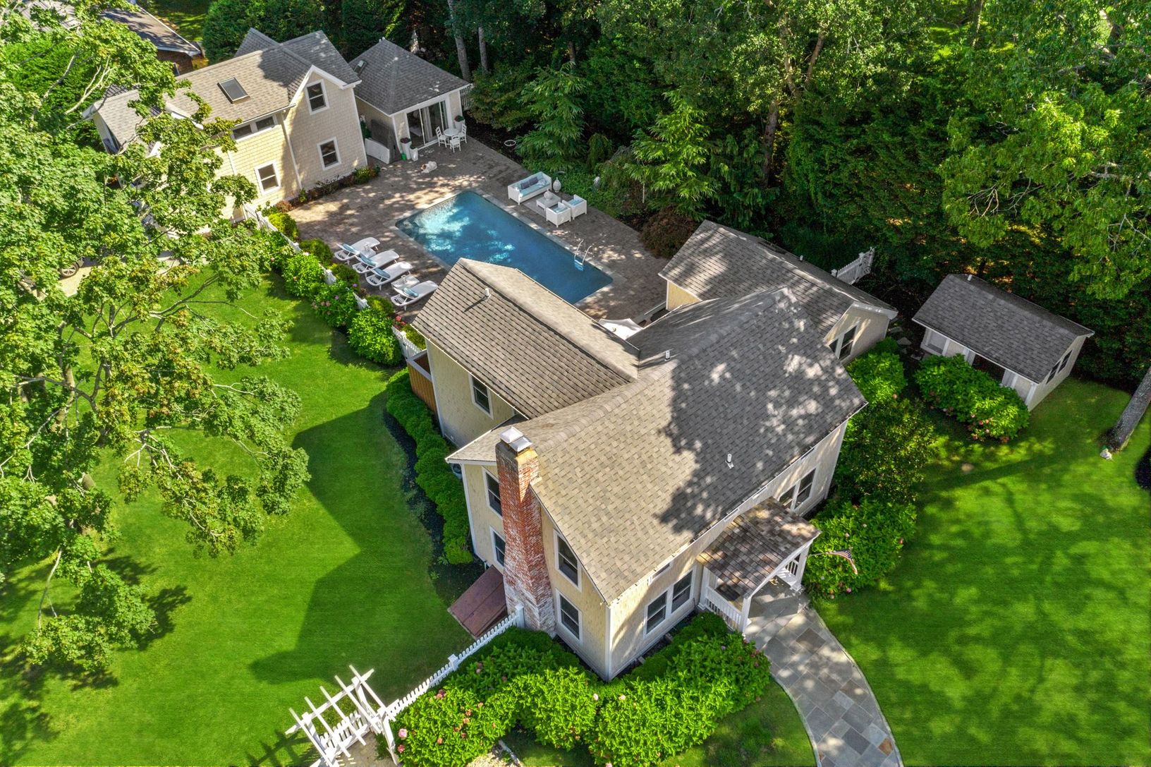 This charming 1930’s, ½ acre, corner lot farm cottage complex has been thoughtfully renovated (2010) and includes 3 separate outbuildings (in addition to main house) for lounging, relaxing, sleeping, movie nights and home office/working.