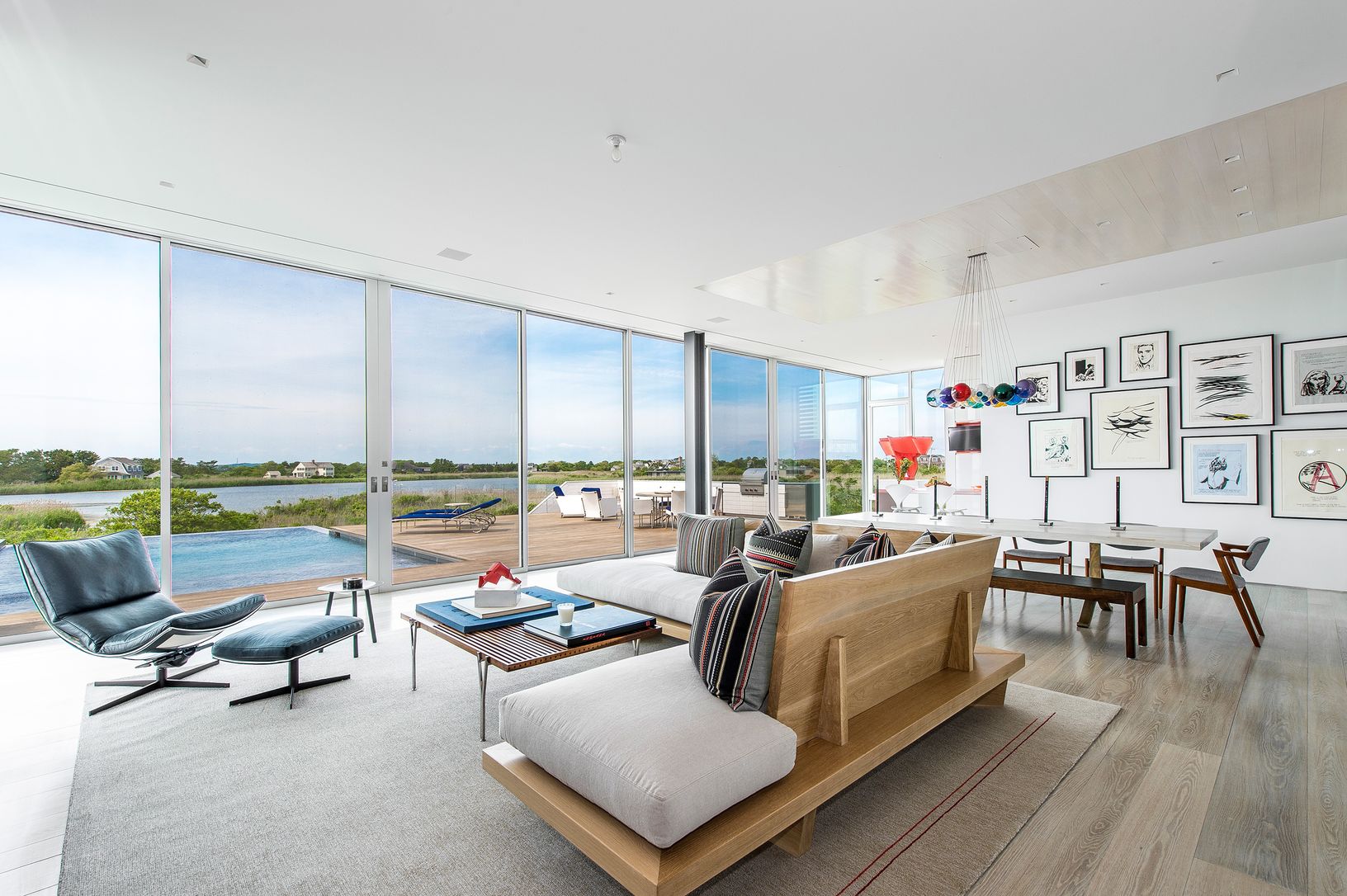 Located south-of-the-highway nestled between the ocean and Mecox Bay in Bridgehampton, this spectacular modern bayfront home spans an impressive 5,000 +/- square feet, and sits on nearly 2.4+/- acres of some of the most sought-after property in the Hamptons. The location is sublime, with sites and sounds of the sea from every vantage point in the house. The panoramic views are maximized in this modern stunner with expansive upstairs living sp