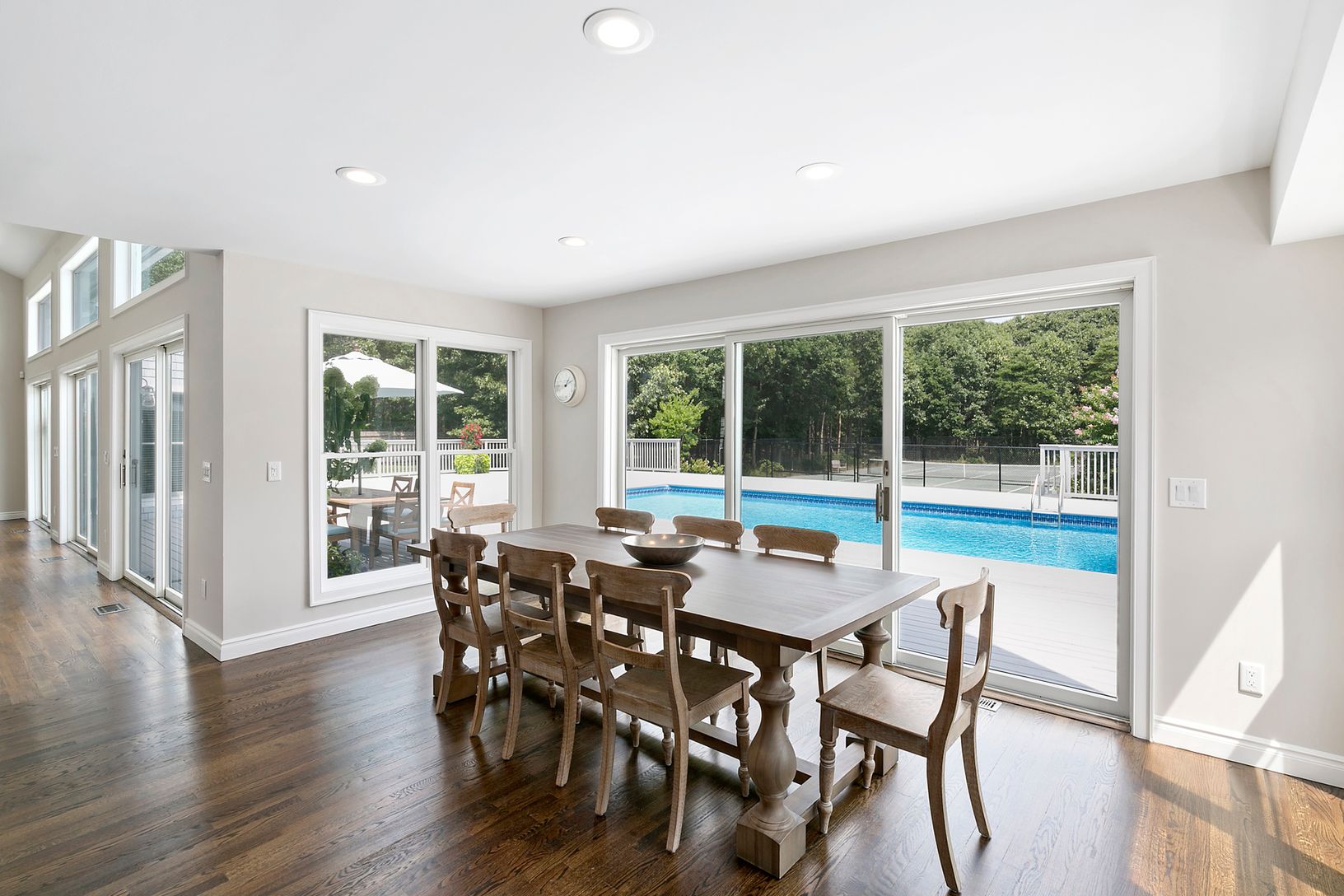 Dramatic, modern and sleek, this spacious four bedroom, four bath home offers an open floor plan, bright and beautiful great room with fireplace, dining area that opens onto the deck and pool, and spacious kitchen. Perfect for indoor and outdoor entertaining or relaxation on the private 1.7+/- acres featuring a heated pool and tennis. New to the market and very well priced.