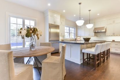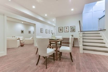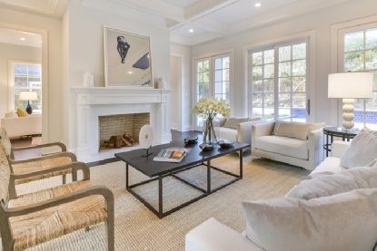 This exciting new traditional by Konner Development in a convenient East Hampton Village fringe location presents a great value and offers open, light-filled first floor interiors and stylish finishes throughout. Enter from the covered porch to a double height foyer flowing to the living room with coffered ceiling and wall of French doors and windows overlooking the grounds. The sunny eat-in kitchen with breakfast area has an island with seati