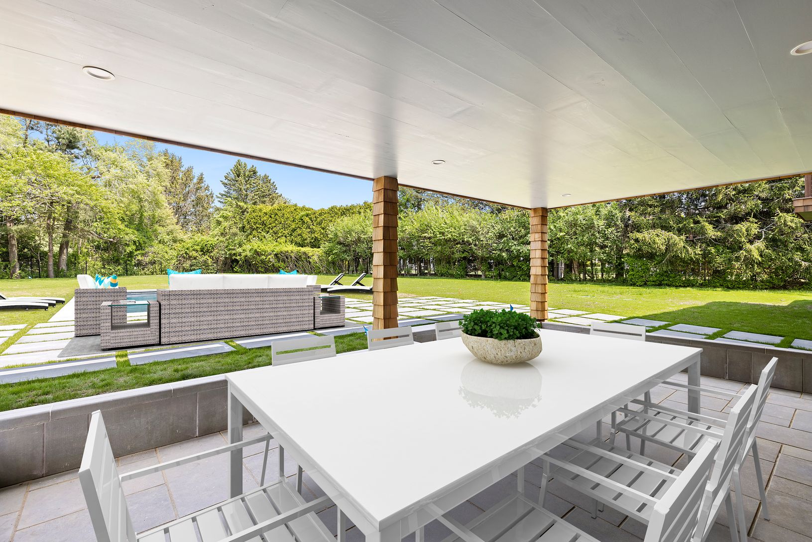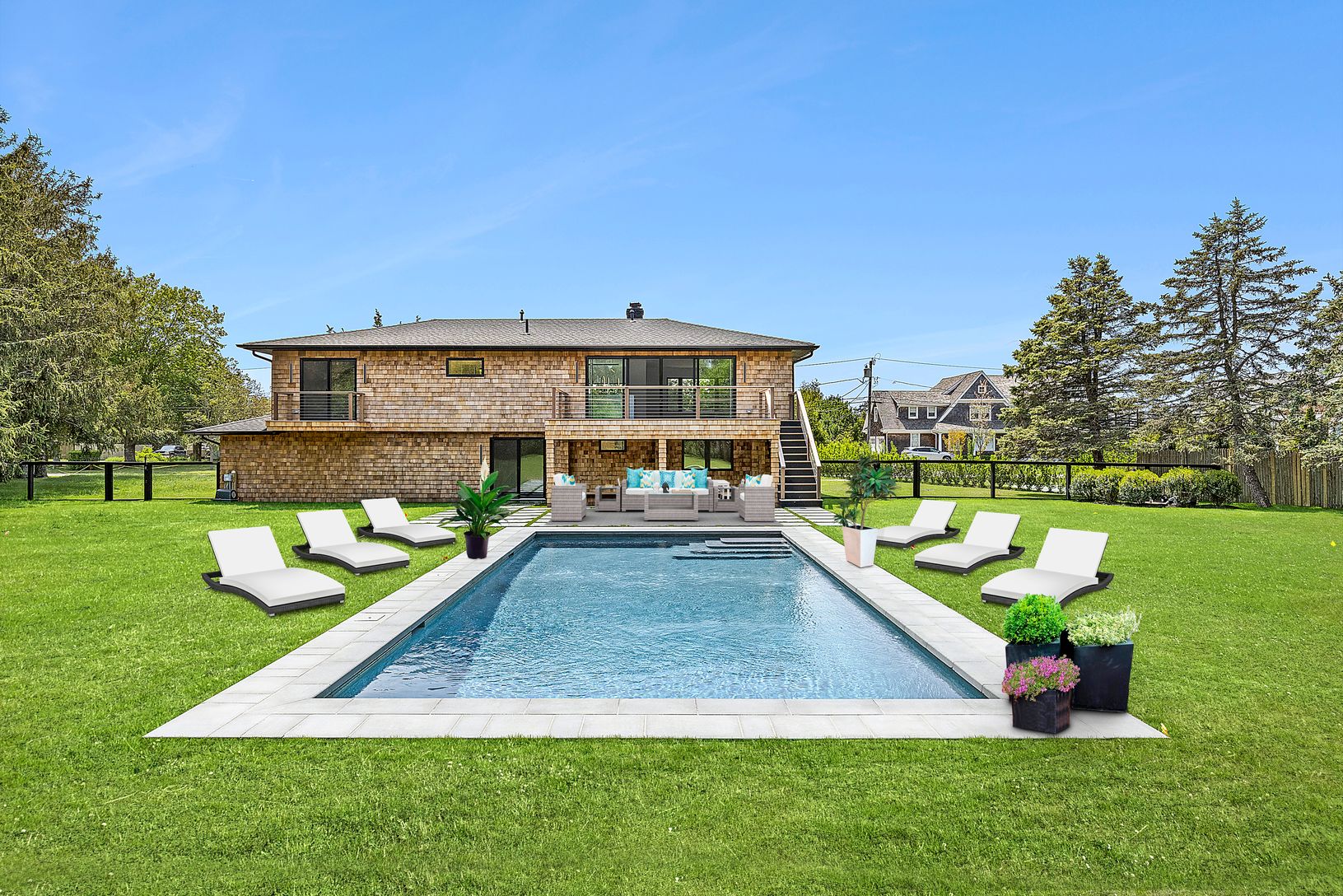 Private oasis easily accessible to Route 27, Southampton Village, golf, ocean and bay, this five-bedroom, four bathroom has been meticulously reimagined and rebuilt. The grounds and pool, roof, siding and windows, interior configuration and fixtures, as well as mechanicals and insulation are all brand new. Enjoy year round indoor and outdoor spaces with open main floor chef's kitchen, dining area and living room with a custom fireplace as well