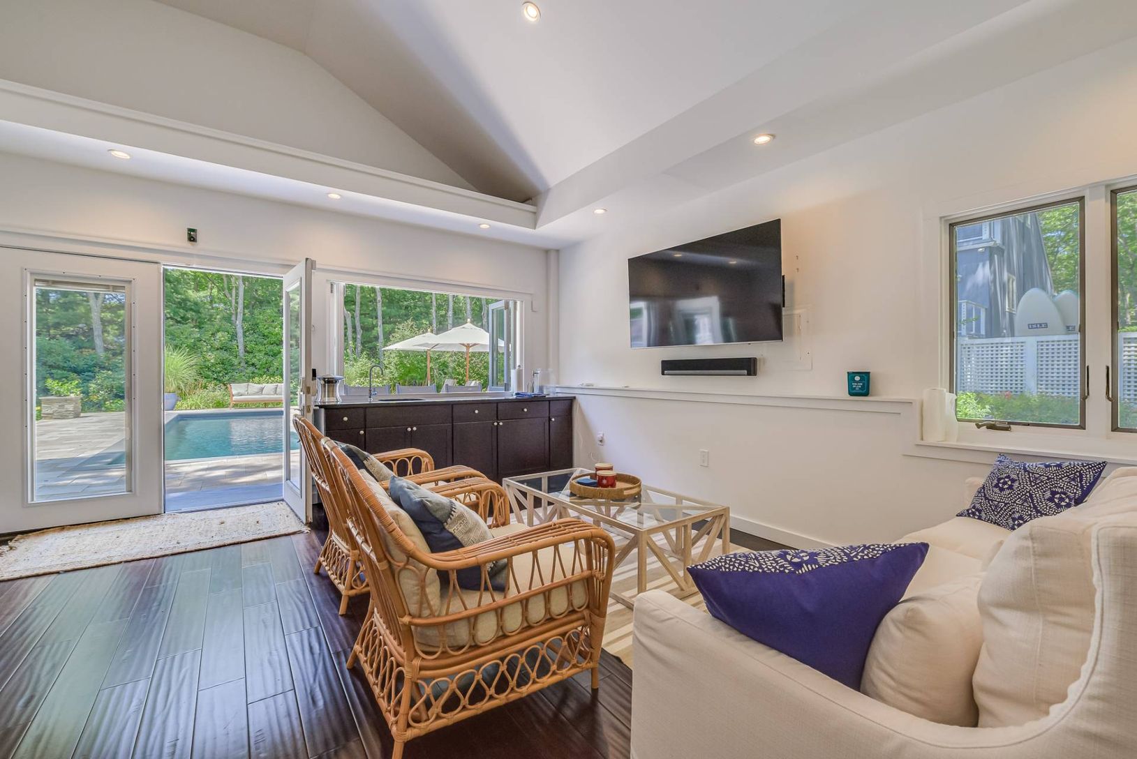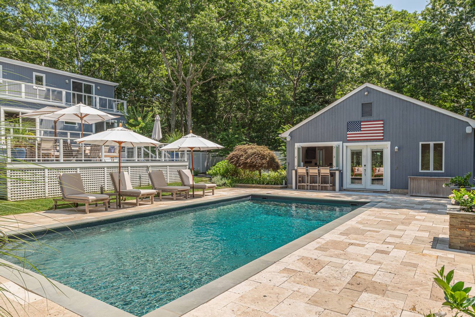 Set on a quiet street in a peaceful Hamptons setting, this exceptional property offers the kind of summer experience that feels both relaxed and refined. The backyard is designed for effortless outdoor living. A sparkling pool is surrounded by an expansive deck and patio - ideal for long afternoons in the sun, casual lunches, and evenings that stretch under the stars. The pool house adds another layer of enjoyment, complete with a bar so you c