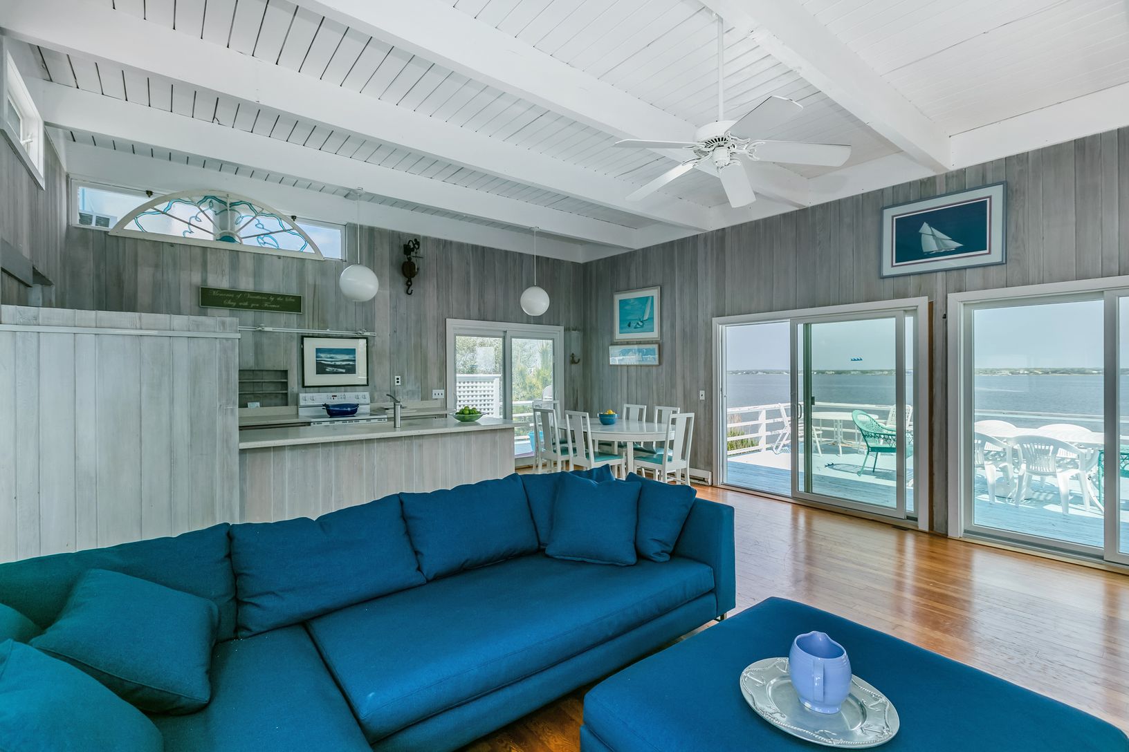One of a Kind! This very special Dune Road beach house is offered for the first time in many years. A Moriches Bay bungalow on over a quarter of an acre, with 83 feet of bulkheaded waterfront property. Western facing for spectacular sunsets, features an open plan great room, with living, dining and an open galley kitchen, all overlooking the serene waters of Moriches Bay. Sliders to the multiple decks, one for grilling, one for sunning or jus